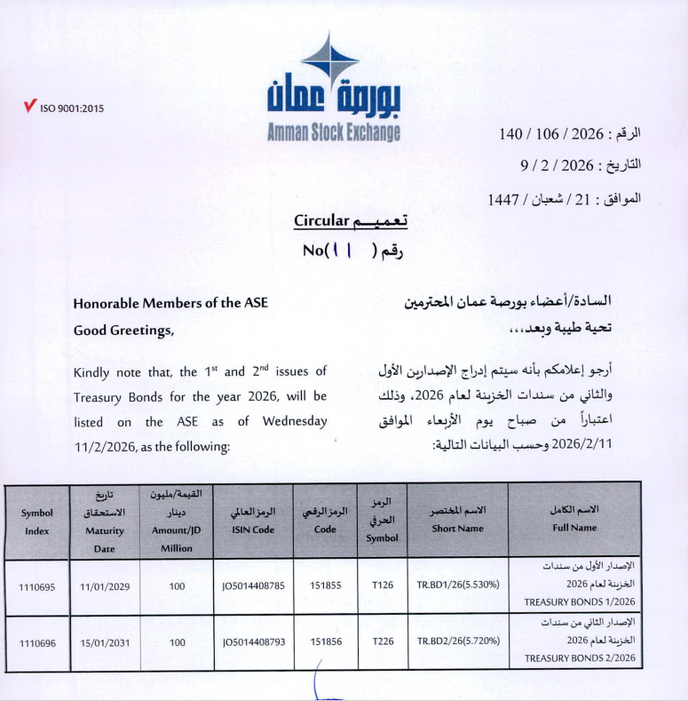 عمون - أعلنت بورصة عمّان، في تعميم صادر عنها عن عزمها إدراج الإصدارين الأول والثاني من سندات الخزينة للعام 2026 بقيمة 200 مليون دينار |