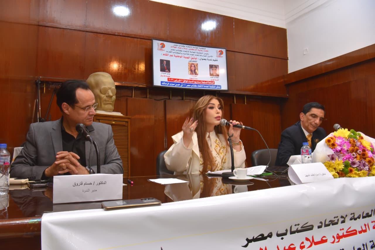عقب ذلك، جاءت كلمة الكاتب اللواء أشرف فوزي، الذي قدّم طرحًا عميقًا انطلق من تجربته العسكرية والثقافية معًا، مؤكدًا أن الهوية الوطنية تمثل أحد أعمدة الأمن القومي، وأن معارك العصر الحديث لم تعد تقتصر على السلاح، بل امتدت إلى الوعي والذاكرة والانتماء. وأوضح أن الكتابة كانت عبر التاريخ إحدى أدوات الدفاع الأساسية عن الأوطان، وأن الأمم التي تُهمل ذاكرتها المكتوبة تفتح الباب واسعًا أمام محاولات التزييف وتشويه التاريخ.