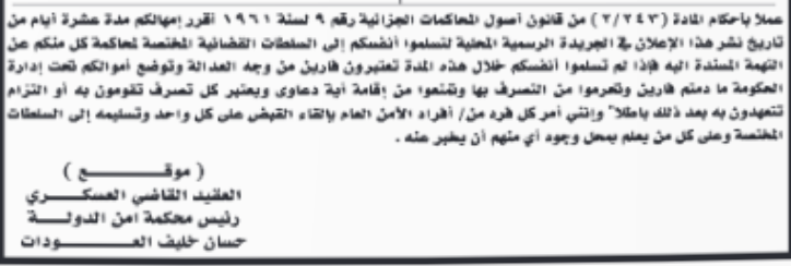 عمون - أعلنت محكمة أمن الدولة اليوم الأربعاء إمهال عدد من المتهمين مدة 10 أيام لتسليم أنفسهم. |
