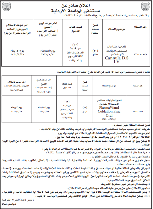 عطاءات صادرة عن مستشفى الجامعة الاردنية