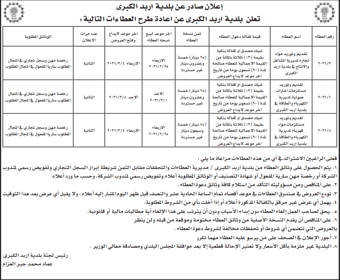 عطاءات صادرة عن بلدية اربد الكبرى