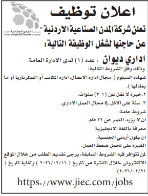 وظيفة شاغرة لدى شركة المدن الصناعية الاردنية