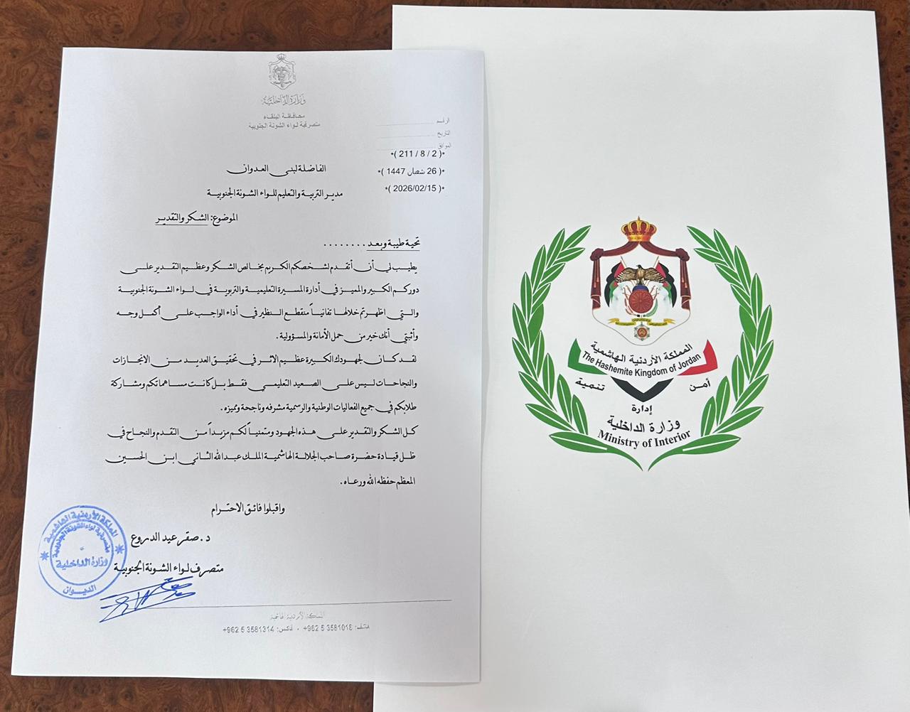 عمون - من شادي نبيل - في لفتة تقديرية تعكس عمق الشراكة بين الحاكمية الإدارية والقطاع التربوي، كَرّم متصرف لواء الشونة الجنوبية الدكتور صقر الدروع، اليوم الأحد الموافق 15-2-2026، مديرة التربية والتعليم للواء الشونة الجنوبية الأستاذة لبنى فرحان العدوان، وذلك خلال زيارة رسمية قام بها إلى مبنى المديرية.