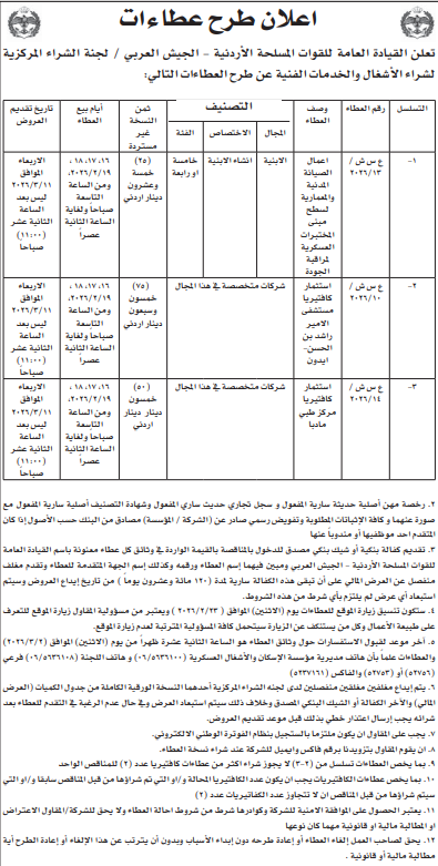 عطاءات صادرة عن القيادة العامة للقوات المسلحة الاردنية