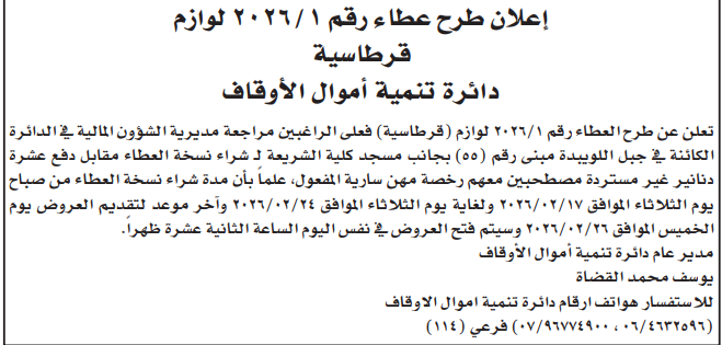 عطاء شراء قرطاسية لدائرة تنمية اموال الاوقاف