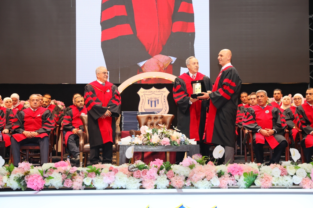 وألقى كلمة الخريجين الطالب الخريج أيهم ماجد سعيفان / كلية تقنية المعلومات / تخصص علم البيانات والذكاء الاصطناعي ، حيث رحب براعي الحفل والعمداء والاساتذة والحضور وذوي الخريجين وقال :