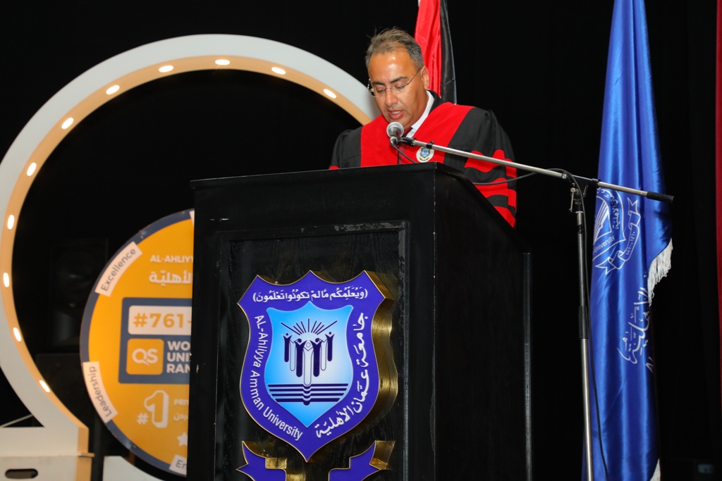 أقف أمامكم اليوم ممثلاً لزملائي الخريجين، ممتناً لهذه اللحظة العظيمة، متقدماً بجزيل الشكر لدولة الرئيس عبد الكريم الكباريتي رئيس مجلس الأمناء، وللأستاذ الدكتور ساري حمدان رئيس جامعة عمّان الأهلية، ولعطوفة الدكتور ماهر الحوراني رئيس هيئة المديرين، والسادة عمداء الكليات وأعضاء الهيئتين التدريسية والإدارية، على ما بذلوه من جهد ودعم حتى نصل إلى هذا اليوم.