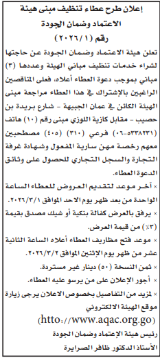 عطاء شراء خدمات النظافة لمبنى هيئة الاعتماد وضمان الجودة