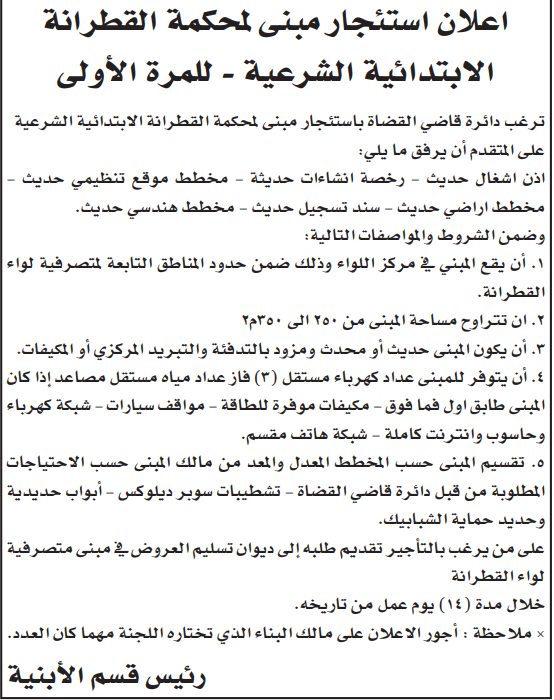 عطاء استئجار مبنى لمحكمة القطرانة الابتدائية الشرعية