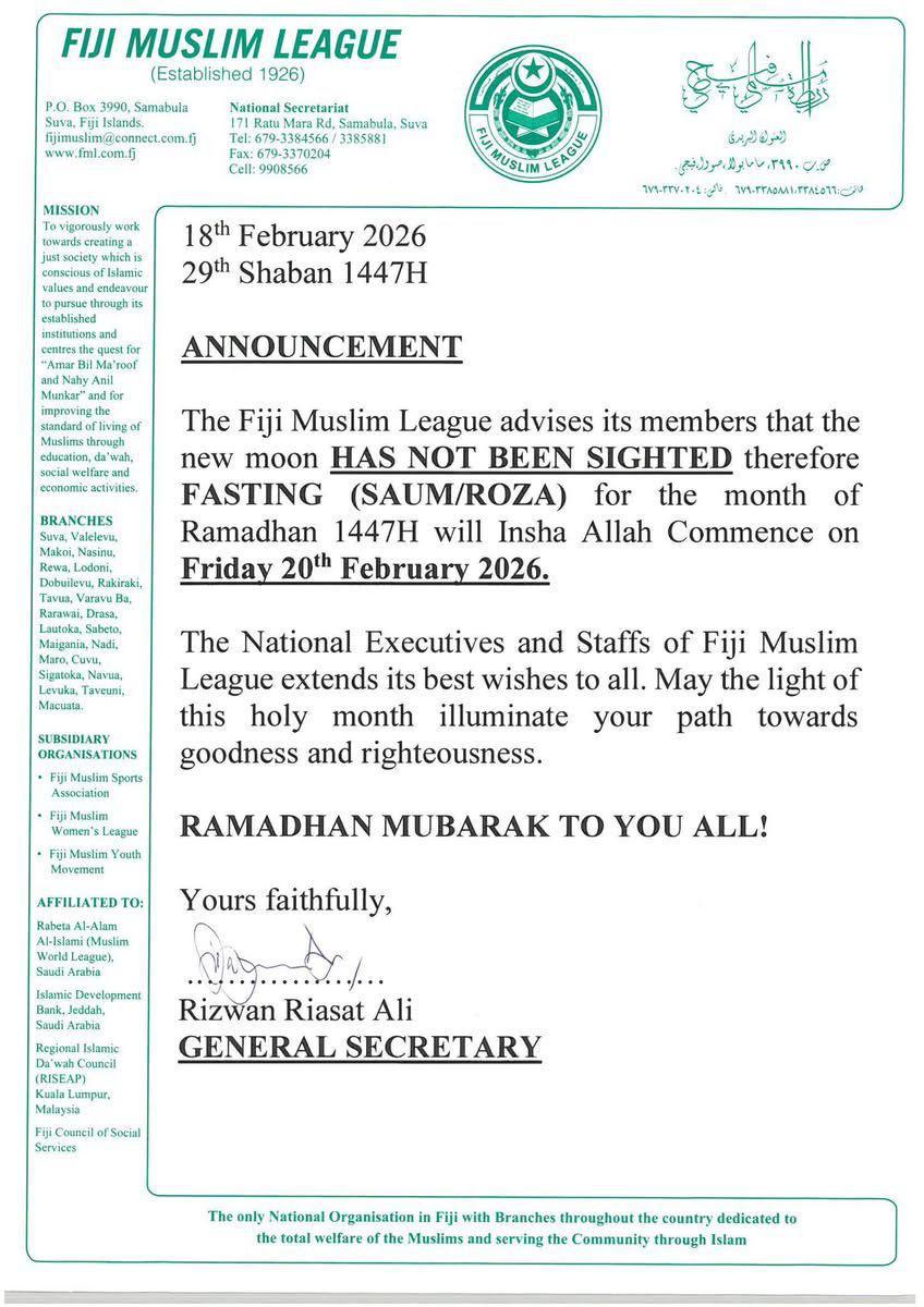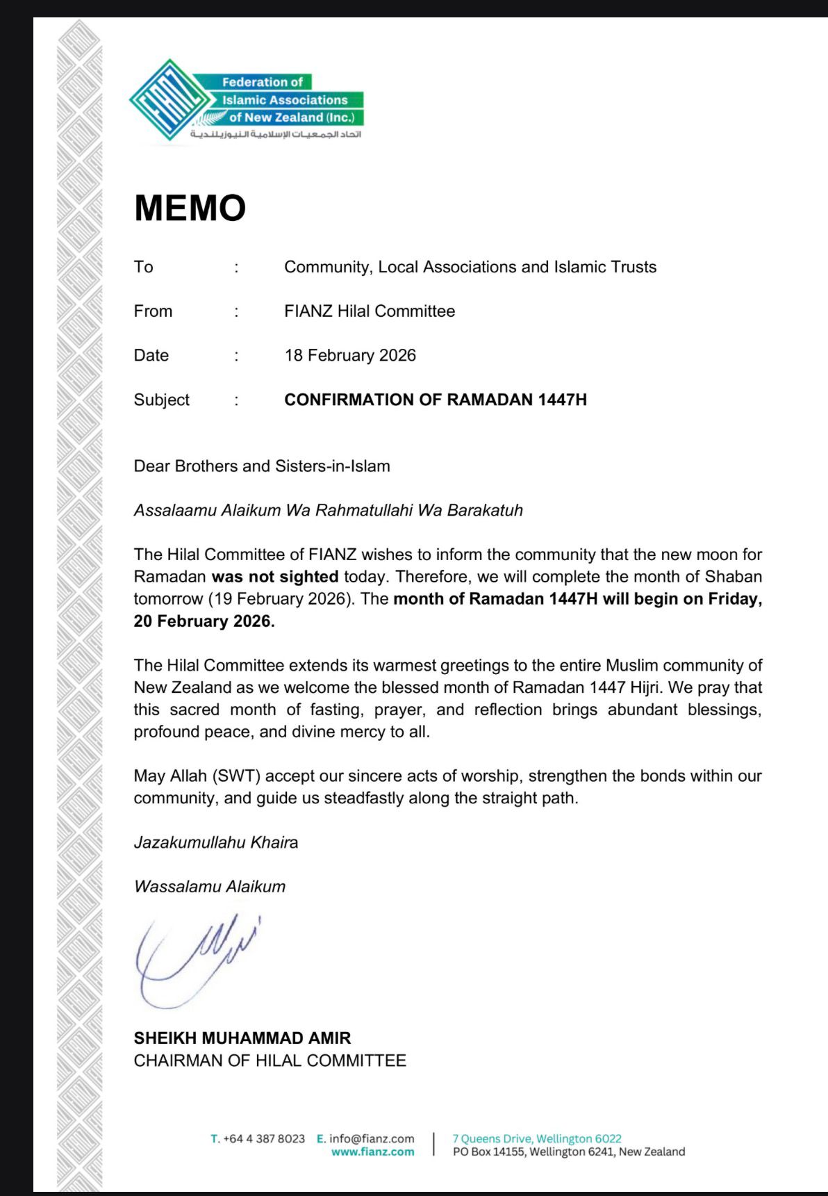 وبناءً على ذلك، تم الإعلان أن يوم غدٍ الخميس 19 فبراير هو المتمم لشهر شعبان، وأن يوم الجمعة 20 فبراير 2026م سيكون أول أيام شهر رمضان المبارك في نيوزيلندا وفيجي.
