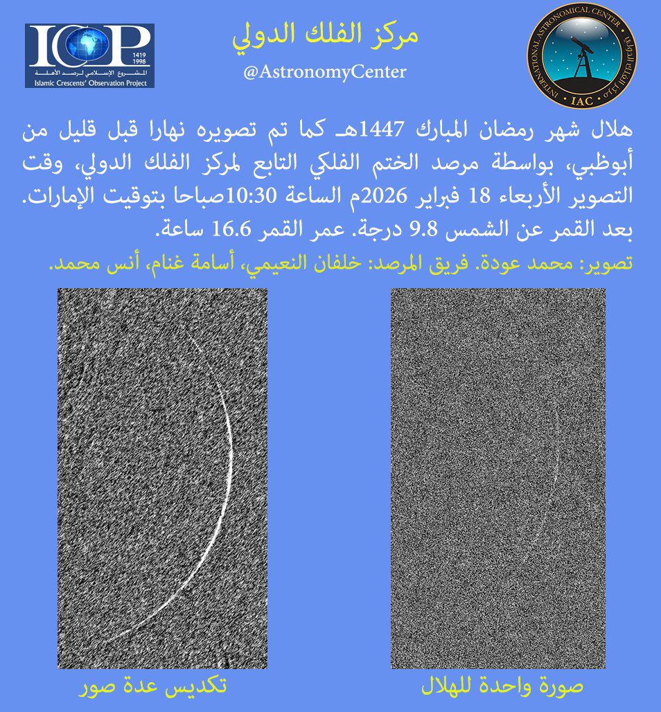 وكما نشرت صور هلال شهر رمضان المبارك 1447هـ كما تم تصويره من أبوظبي، بواسطة مرصد الختم الفلكي التابع لمركز الفلك الدولي، وكان قت التصوير الأربعاء 18 فبراير 2026م الساعة 10:30صباحا بتوقيت الإمارات، وكان بعد القمر عن الشمس 9.8 درجة. عمر القمر 16.6 ساعة، حيث تم التصوير عن طريق فريق المرصد: خلفان النعيمي، أسامة غنام، أنس محمد.