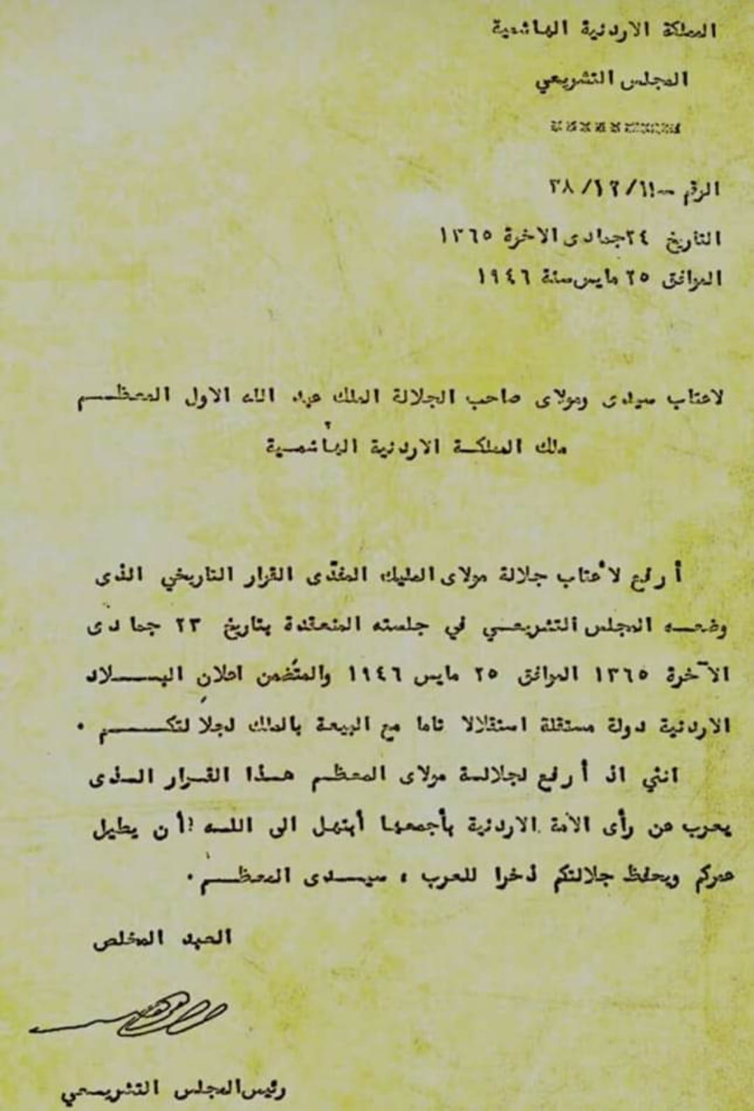 وبعد مناقشاتٍ حملت ثقل التاريخ ومسؤوليته، أصدر المجلس التشريعي الأردني الخامس بالإجماع قراره التاريخي الذي لا لبس فيه: إعلان البلاد الأردنية دولةً مستقلة استقلالًا تامًا، وذات سيادة، وحكومة ملكية وراثية نيابية، ومبايعة سيد البلاد ومؤسس كيانها، وريث النهضة العربية، سمو الأمير عبد الله بن الحسين المعظم، ملكًا دستوريًا على رأس الدولة الأردنية، بلقب "حضرة صاحب الجلالة ملك المملكة الأردنية الهاشمية". بهذا القرار، لم تُعلن دولة فقط، بل أُغلقت صفحة الانتداب إلى غير رجعة، وفُتحت صفحة السيادة الوطنية بإرادة ممثلي الشعب لا بإملاء الخارج.