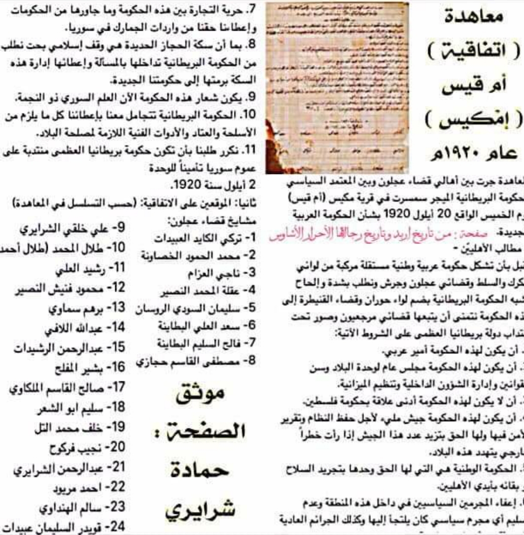 ثم جاء مؤتمر ووثيقة أم قيس... حين نطقت الإرادة الأردنية باسم الإستقلال... ففي ربيع عام 1920، وعلى تخوم التاريخ والجغرافيا، انعقد في بلدة أم قيس شمال الأردن واحدٌ من أهم وأشرف الاجتماعات السياسية في تاريخ الأردن الحديث، والتي يجب على جيلكم أن يعرف عنها ويعيها ويستوعب معانيها وأهميتها في تحقيق استقلال الوطن. لم يكن لقاءً عابرًا لوجهاء منطقة، ولا ردّ فعلٍ آنيًّا على أحداثٍ متسارعة، بل كان وعيًا مبكرًا يُترجِم ما كان يدور في صدور الأردنيين إلى موقفٍ مكتوبٍ واضحٍ لا يحتمل التأويل. هناك، وُلدت وثيقة أم قيس؛ لا بوصفها بيان احتجاج، بل بوصفها برنامجًا وطنيًا متكاملًا رسم ملامح الاستقلال قبل أن تُعلن الدولة بربع قرن.