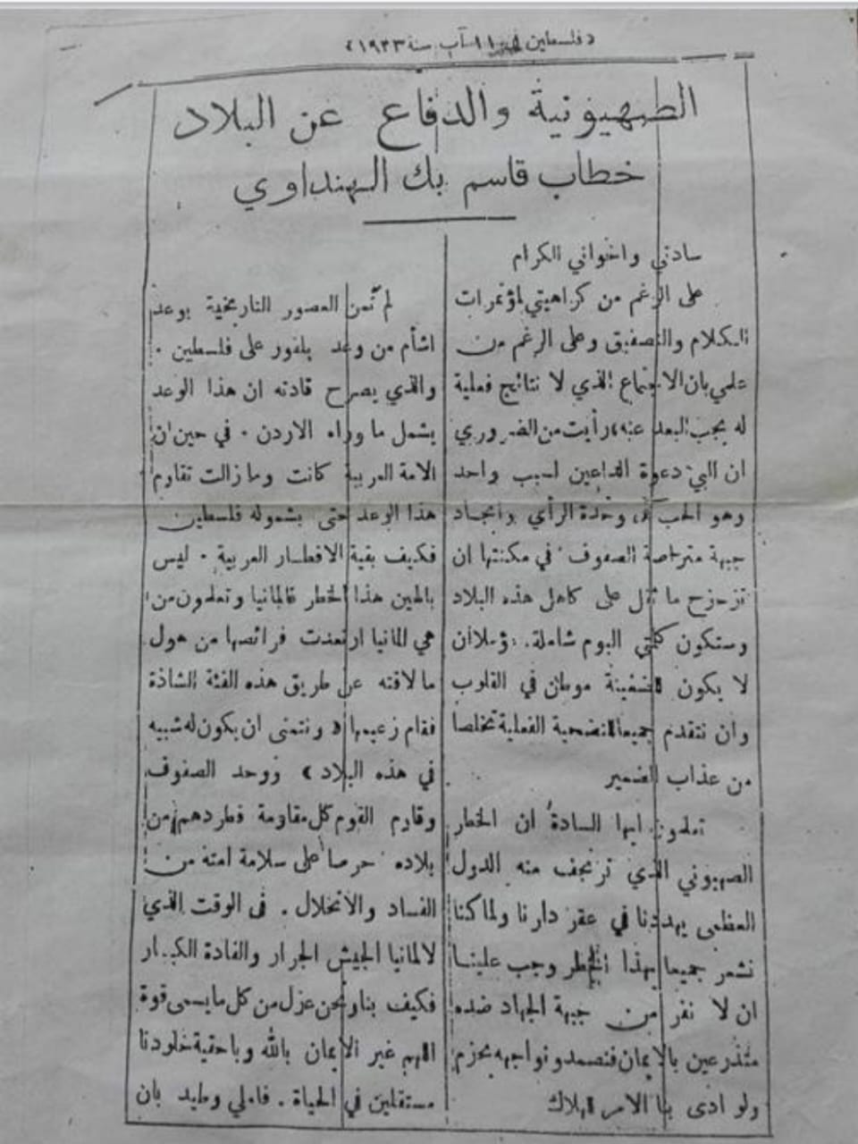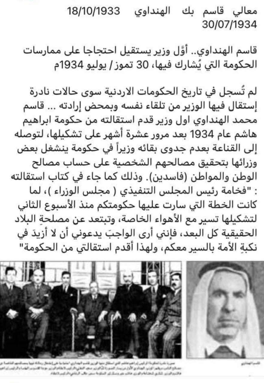 وفي قلب هذه المرحلة، برز نموذج أخلاقي فريد في العمل العام تمثّل في عمكم الأكبر قاسم بيك الهنداوي، الذي حذّر في خطابه الشهير بمؤتمر الشعب الأردني عام 1933 من الخطر الصهيوني، ودعا إلى استعداد حقيقي للتضحية دفاعًا عن الأرض. ثم قدّم استقالته من حكومة إبراهيم هاشم عام 1934، في سابقة نادرة، مؤكدًا أن البقاء في منصب لا يخدم الوطن هو زيادة في نكبة الأمة، ليقدّم درسًا مبكرًا في أن السياسة أخلاق قبل أن تكون سلطة.