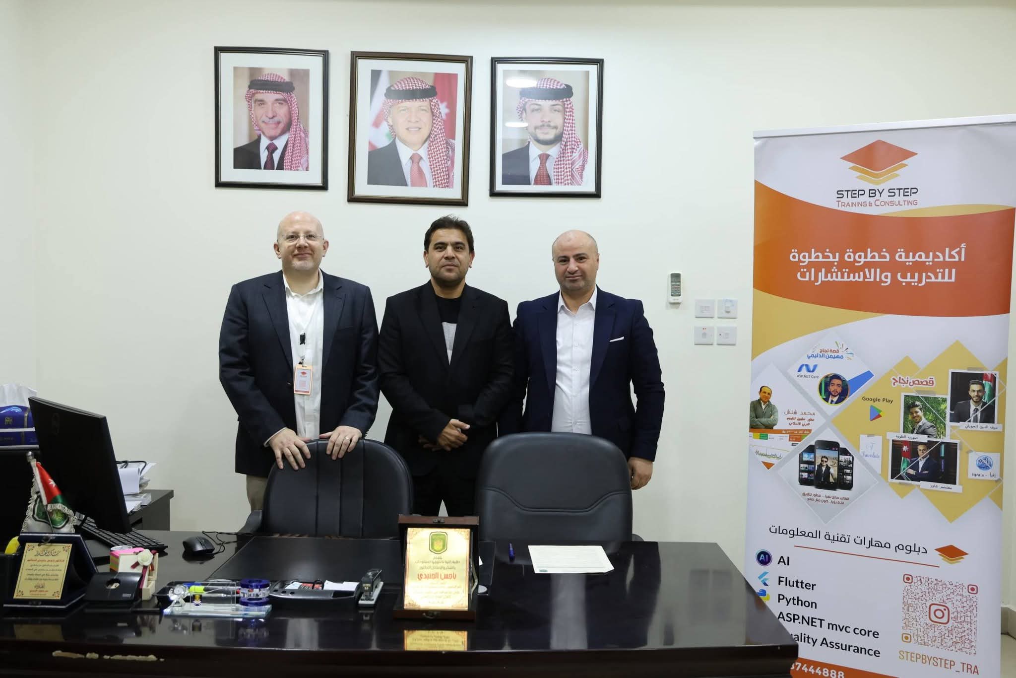 وجرى توقيع الاتفاقيات بحضور مساعد الرئيس للشؤون الإدارية الأستاذ الدكتور برهان حمادنة، وعميد كلية تكنولوجيا المعلومات الدكتور باجس الجنيدي، إلى جانب ممثلي الجهات الشريكة، حيث مثّل أكاديمية معًا نمضي الدكتورة مريم طعامنة والمدير التنفيذي المهندس نسيم خصاونة، ومثّل شركة الدائرة الخضراء لتكنولوجيا المعلومات المدير العام المهندس علي العساف ومدير التدريب والتطوير السيد أحمد مصلح، فيما مثّل أكاديمية خطوة بخطوة المدير العام السيد مهند ملحيس ومنسقات التدريب فاطمة ربابعة ورهف شاقلدي.