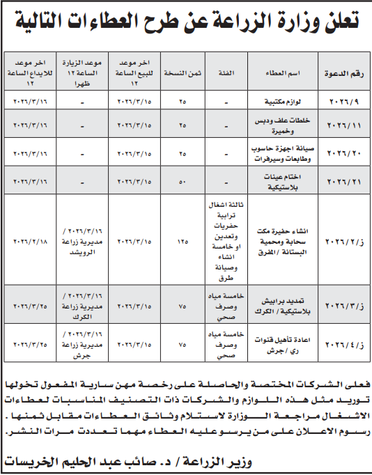 عطاءات صادرة عن وزارة الزراعة