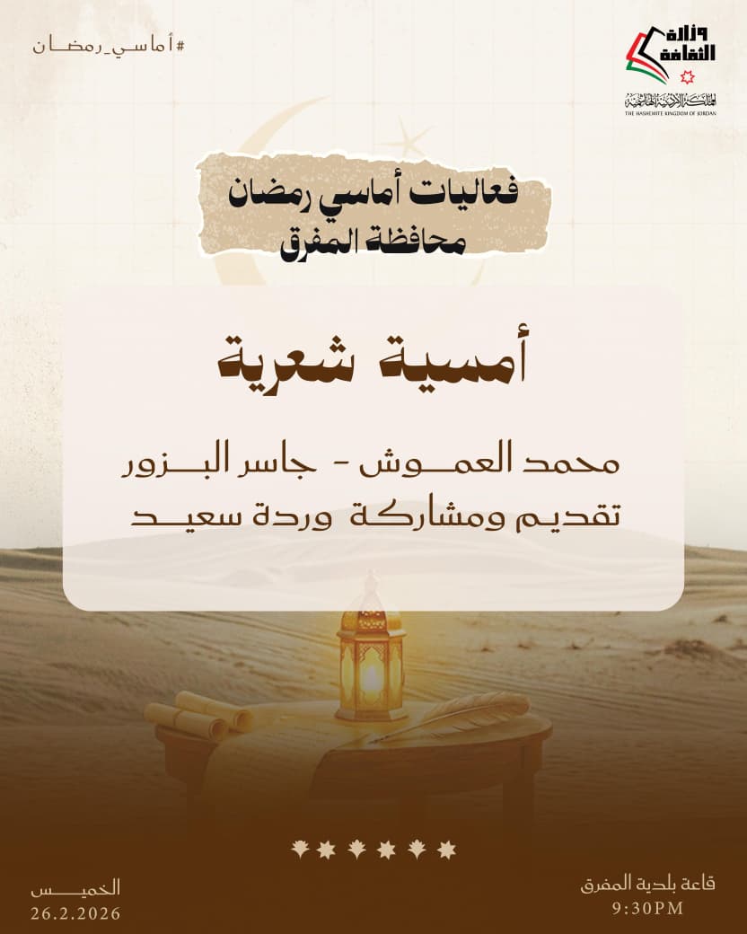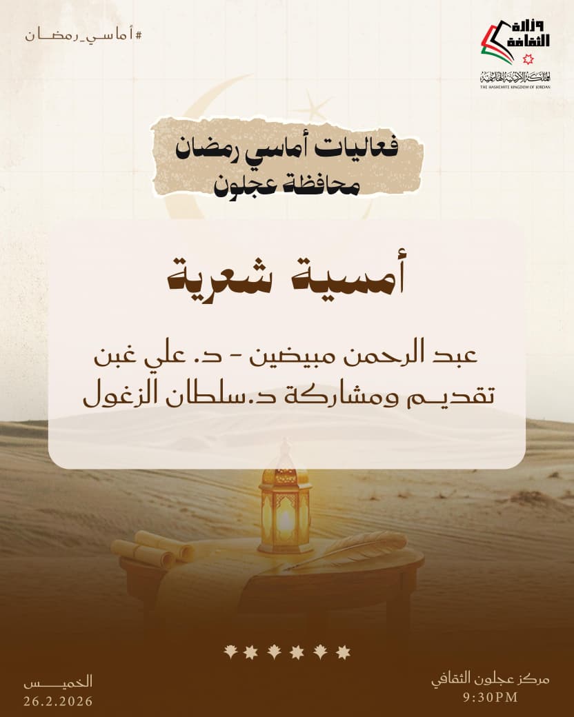 عمون - تواصل وزارة الثقافة تنفيذ برنامج «أماسي رمضان» من خلال حزمة فعاليات ثقافية وفنية تقام مساء الخميس المقبل في عدد من محافظات المملكة، انسجامًا مع ما يحمله الشهر الفضيل من قيم روحية واجتماعية، وذلك في المراكز الثقافية بالمحافظات من الساعة التاسعة والنصف مساءً وحتى الثانية عشرة ليلًا.