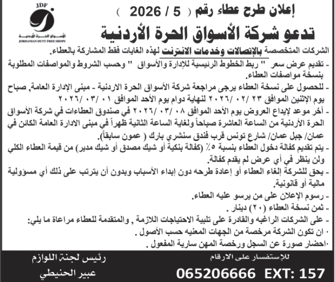 عطاء صادر عن الاسواق الحرة الاردنية