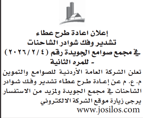 عطاء صادر عن الشركة العامة الاردنية للصوامع والتموين