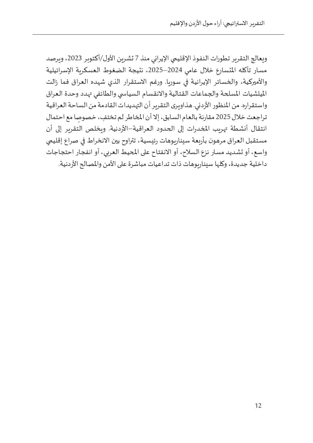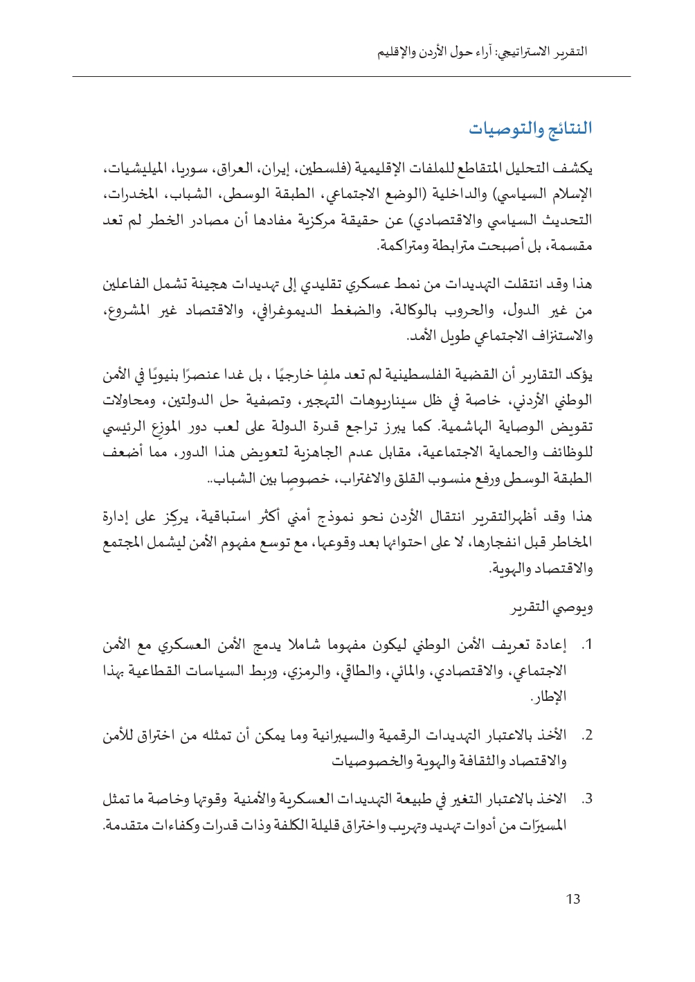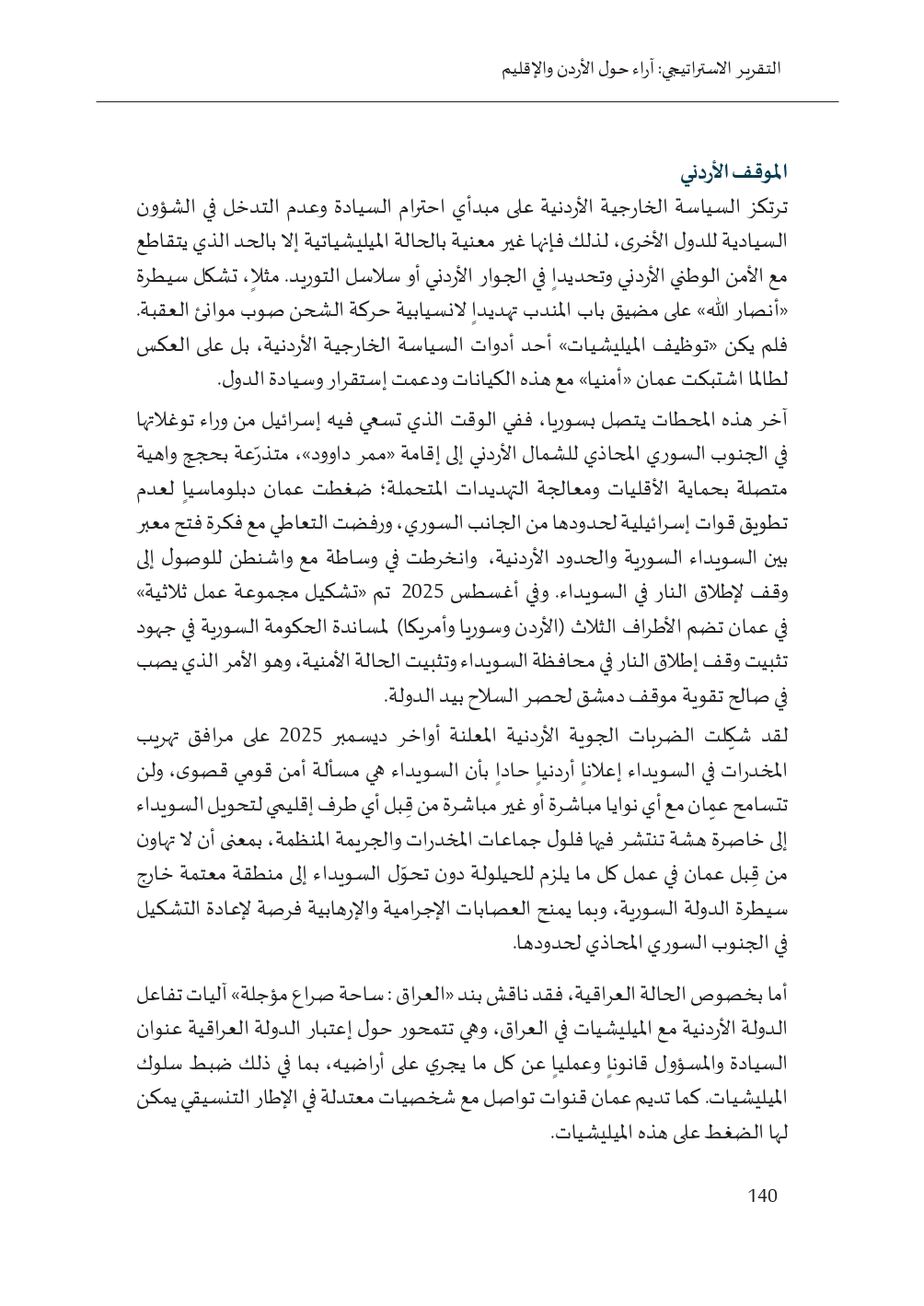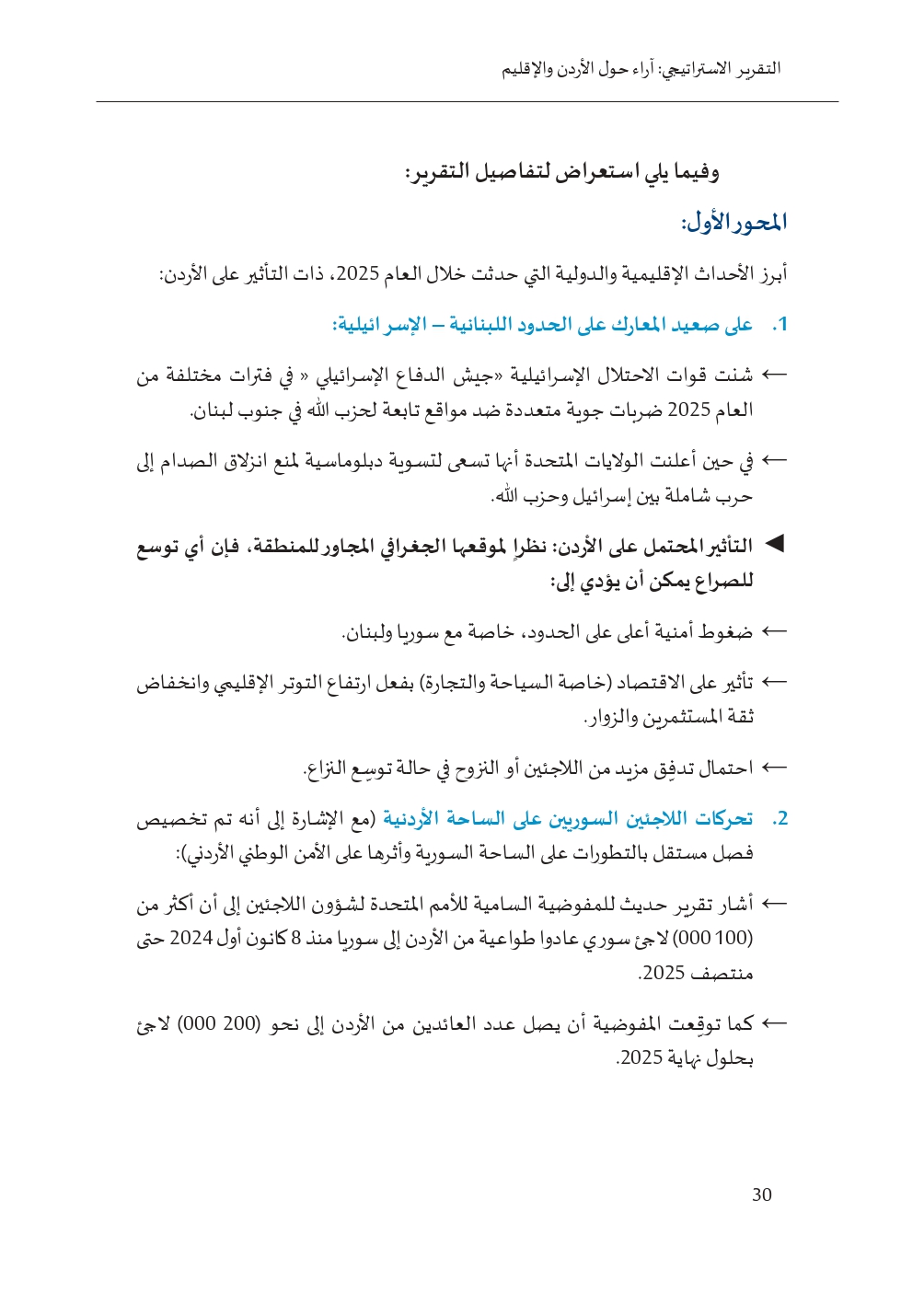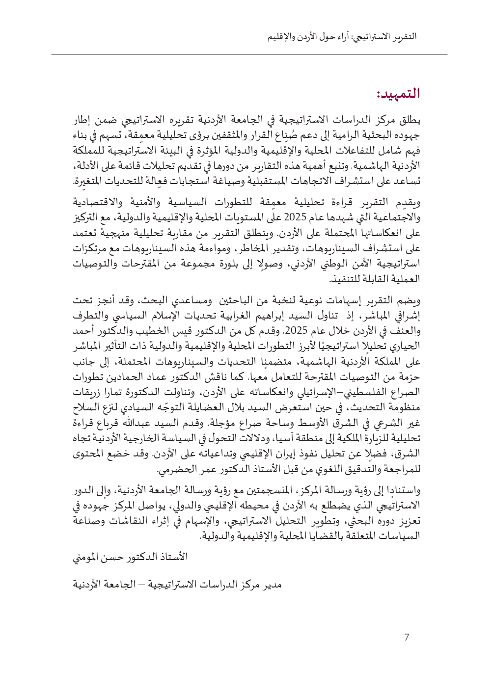 وينطلق التقرير من مقاربة تحليلية منهجية تقوم على استشراف السيناريوهات وتقدير المخاطر، ومواءمتها مع مرتكزات استراتيجية الأمن الوطني الأردني، وصولًا إلى بلورة مجموعة من المقترحات والتوصيات العملية القابلة للتنفيذ، بما يعزز قدرة صانع القرار على التعامل مع التحولات المتسارعة في الإقليم والعالم.