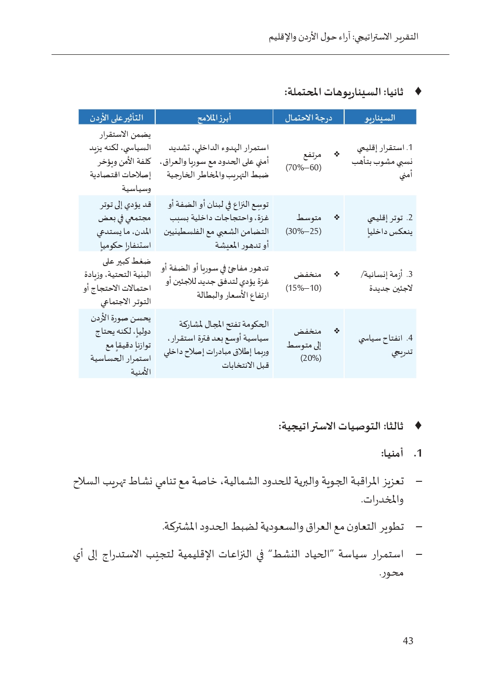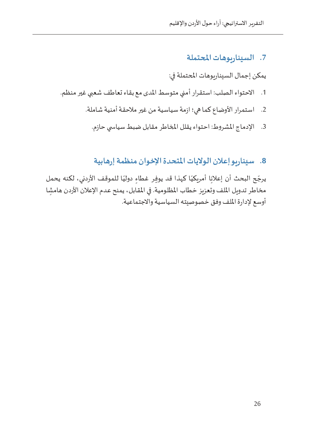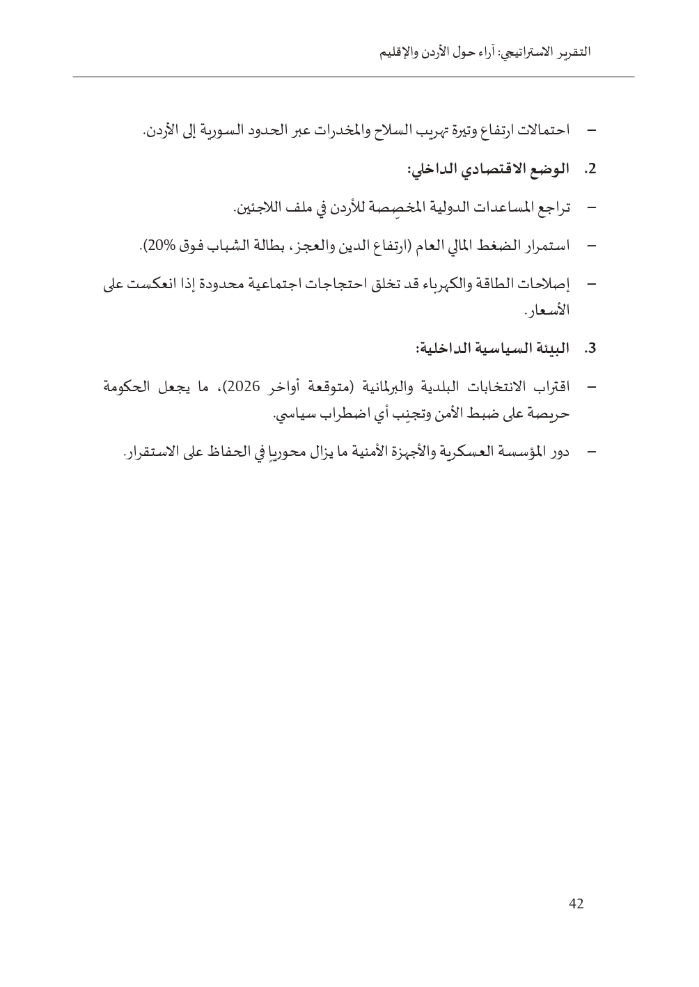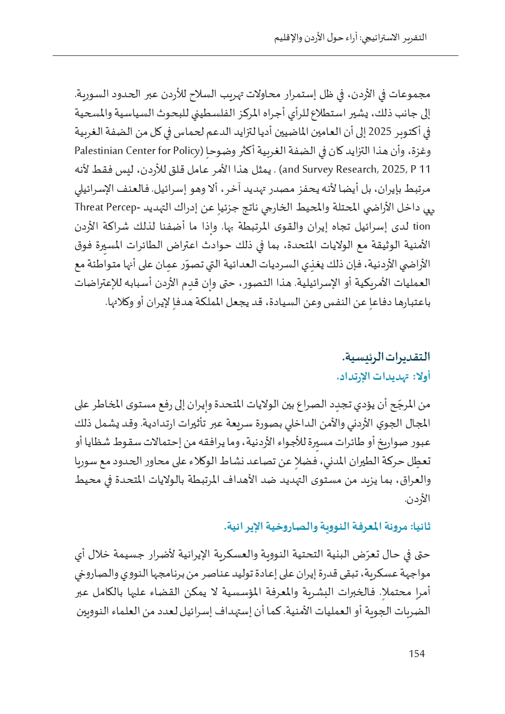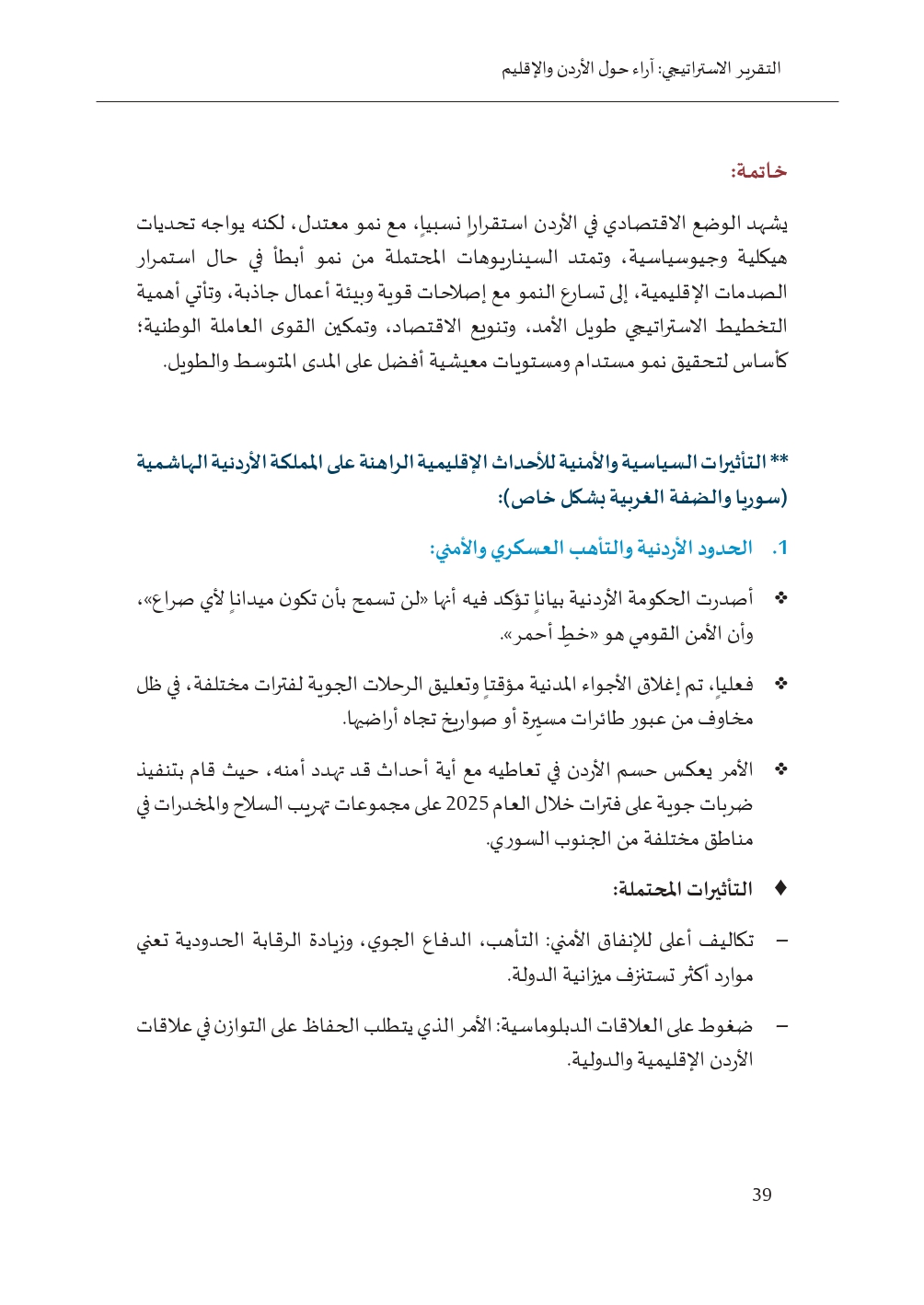 وينطلق التقرير من مقاربة تحليلية منهجية تقوم على استشراف السيناريوهات وتقدير المخاطر، ومواءمتها مع مرتكزات استراتيجية الأمن الوطني الأردني، وصولًا إلى بلورة مجموعة من المقترحات والتوصيات العملية القابلة للتنفيذ، بما يعزز قدرة صانع القرار على التعامل مع التحولات المتسارعة في الإقليم والعالم.