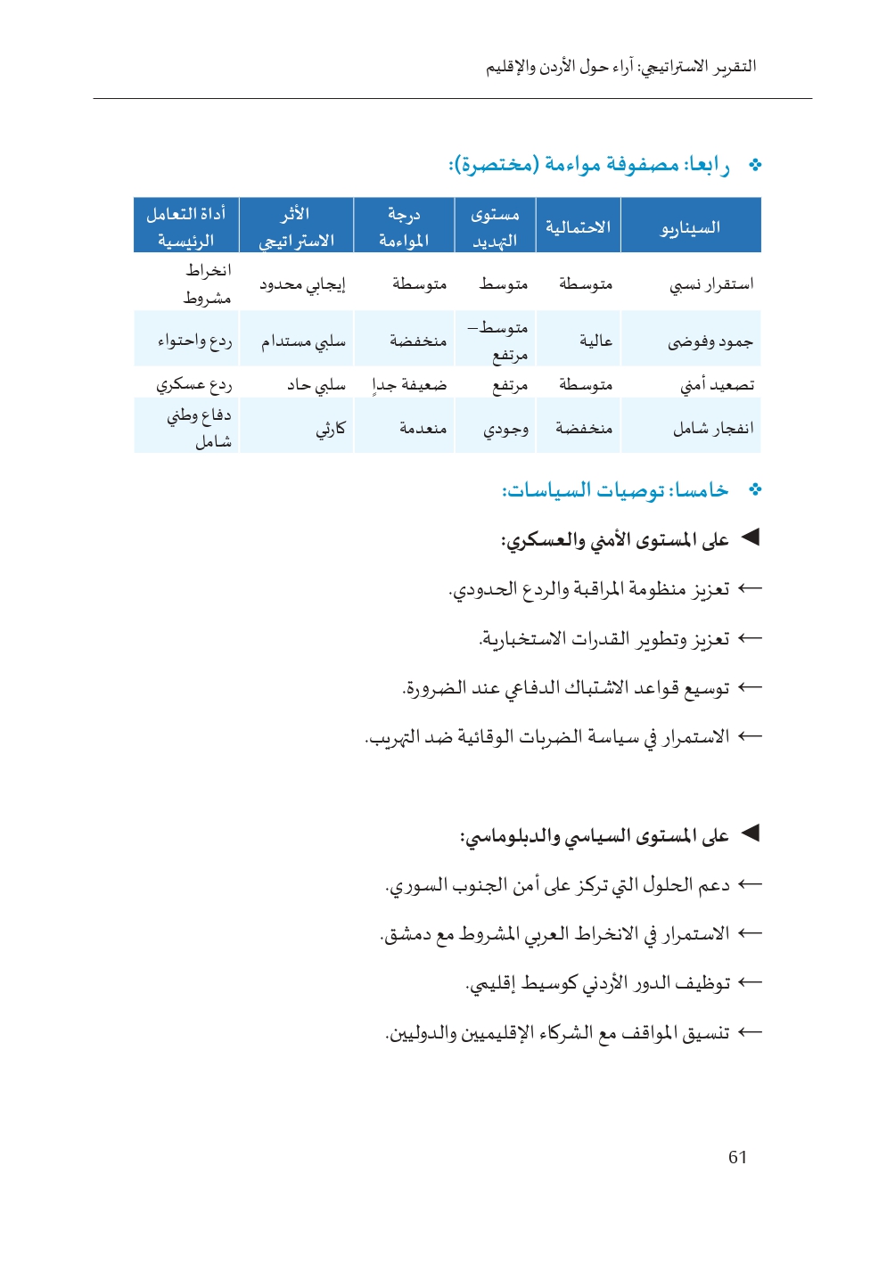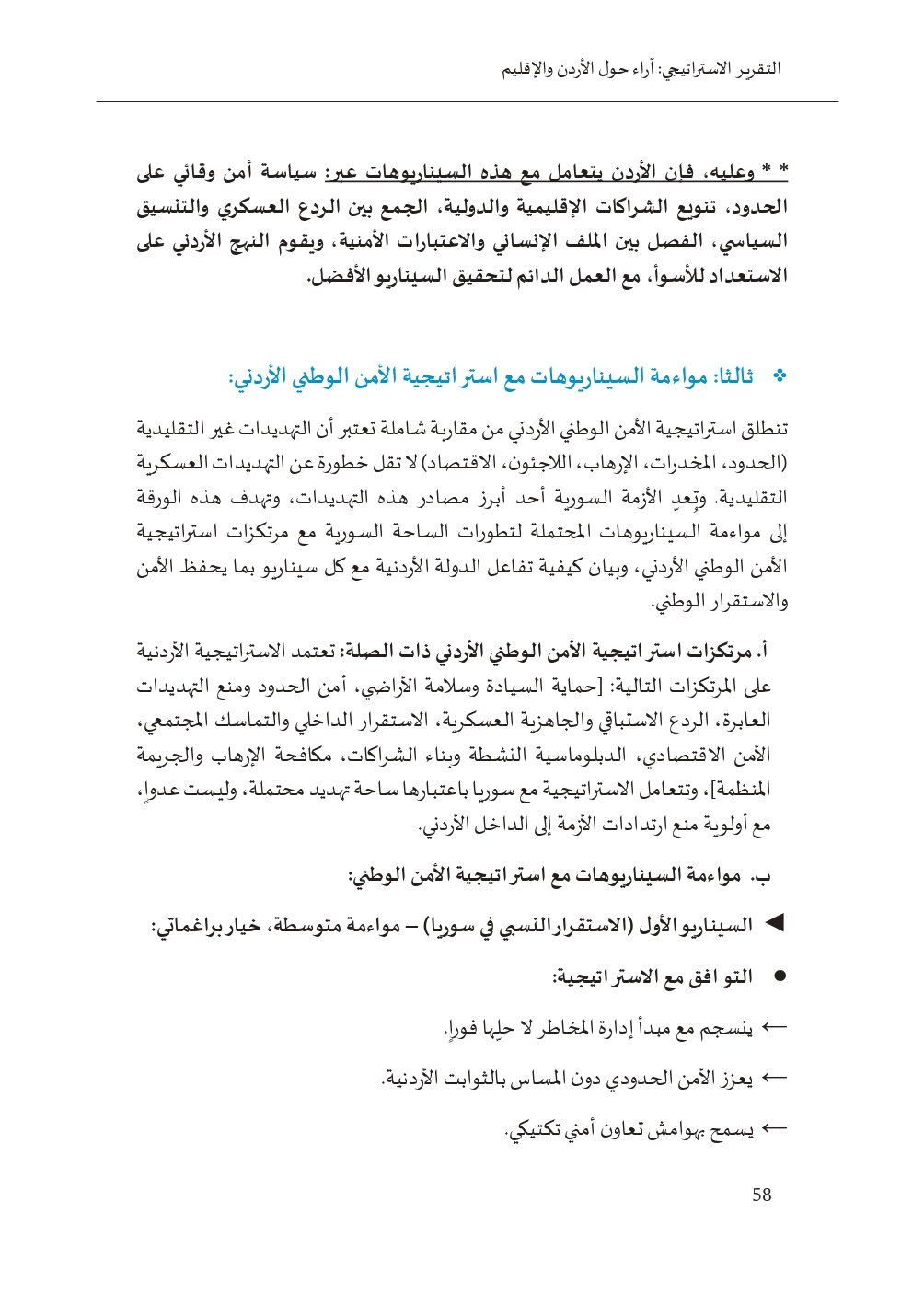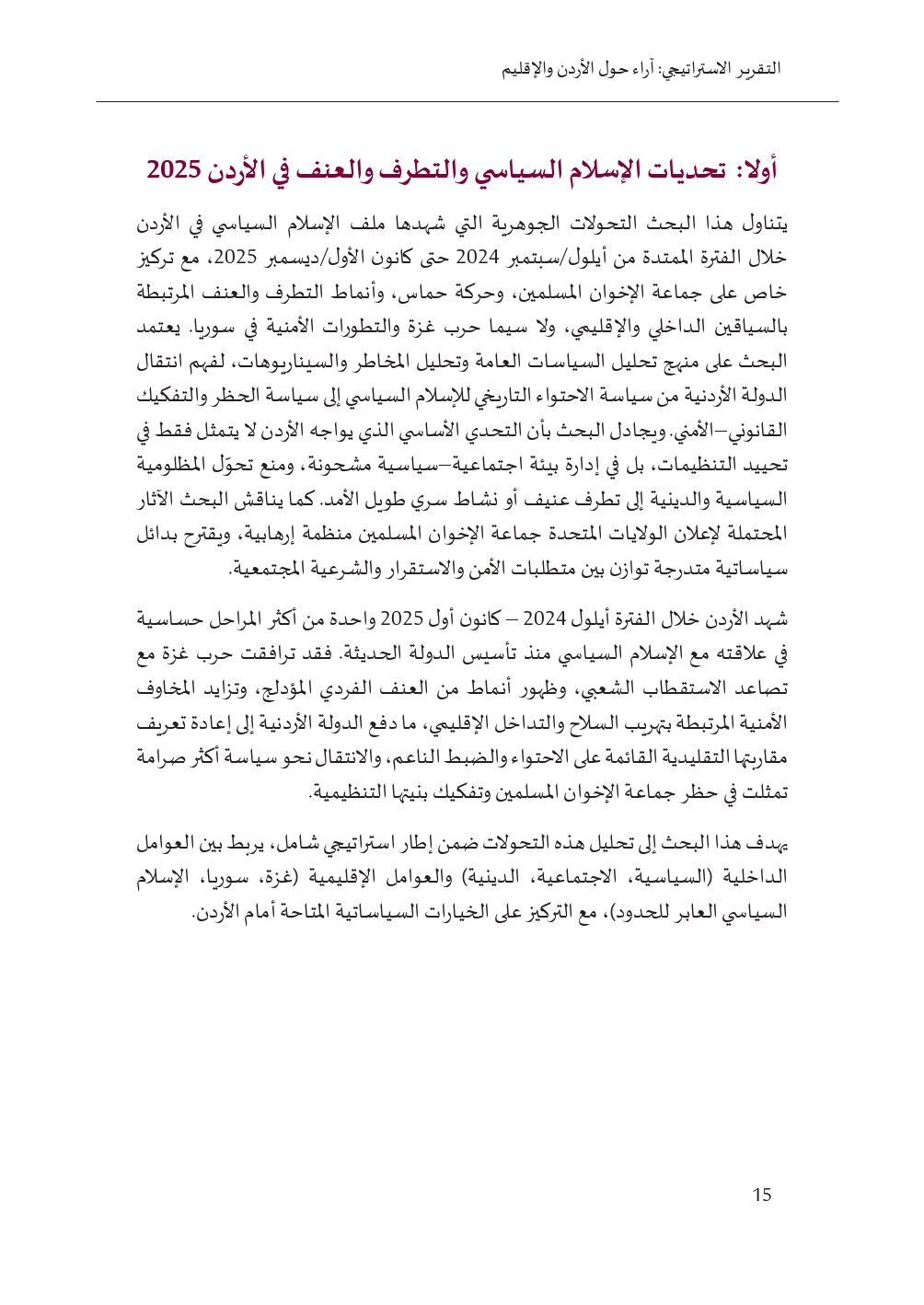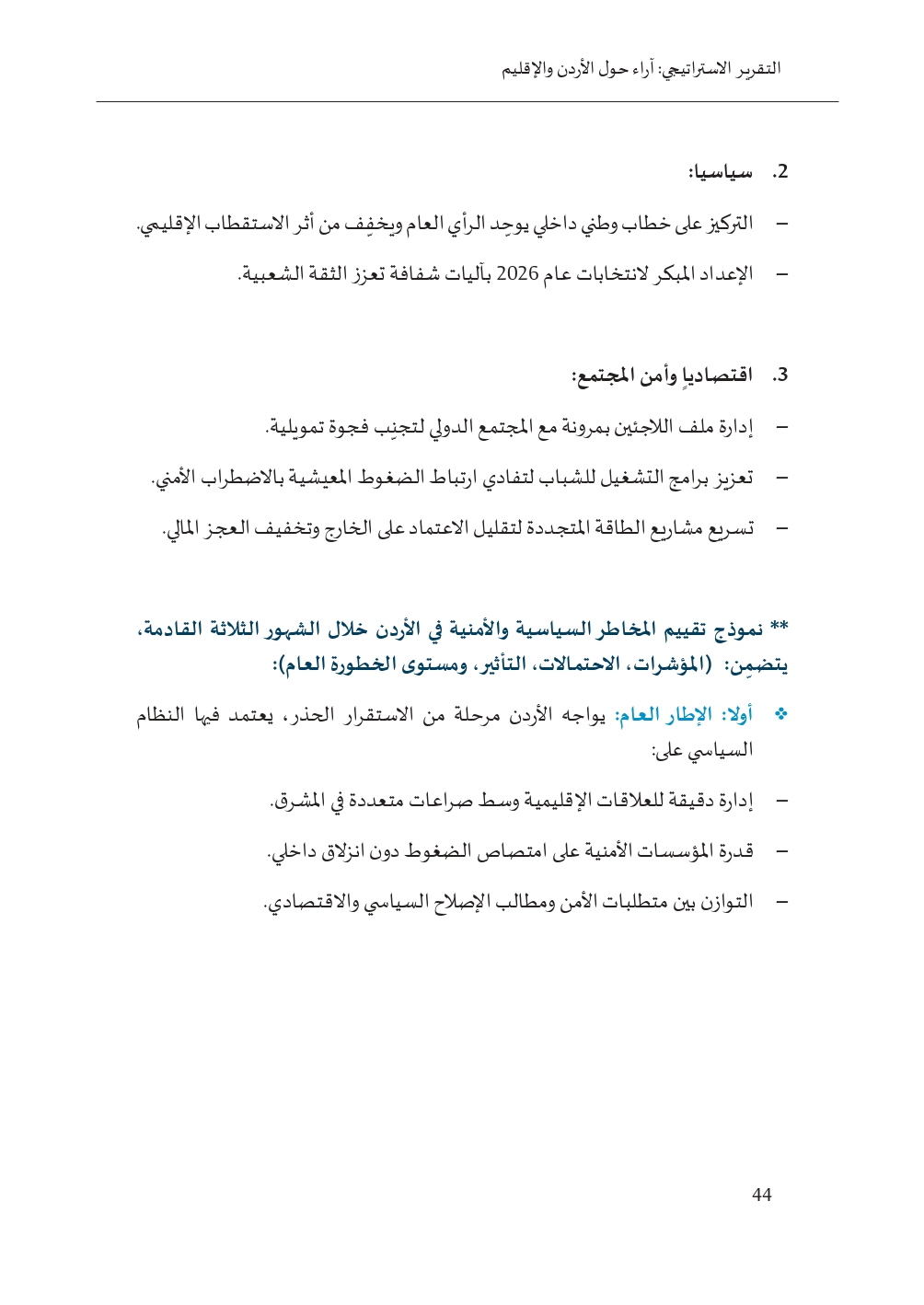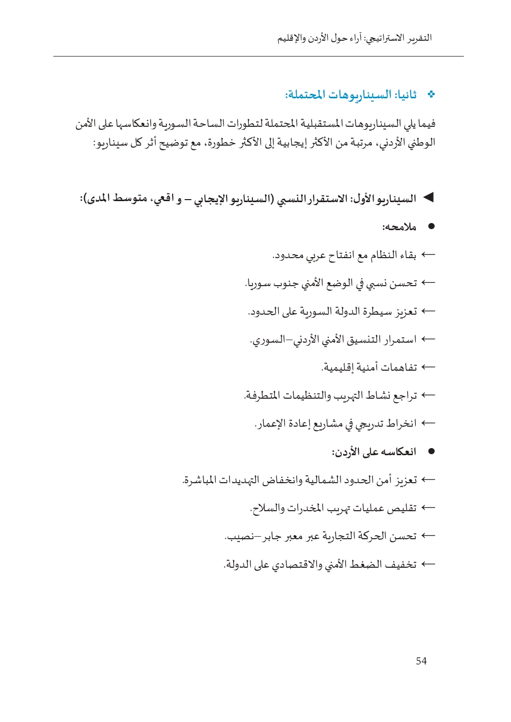 وينطلق التقرير من مقاربة تحليلية منهجية تقوم على استشراف السيناريوهات وتقدير المخاطر، ومواءمتها مع مرتكزات استراتيجية الأمن الوطني الأردني، وصولًا إلى بلورة مجموعة من المقترحات والتوصيات العملية القابلة للتنفيذ، بما يعزز قدرة صانع القرار على التعامل مع التحولات المتسارعة في الإقليم والعالم.