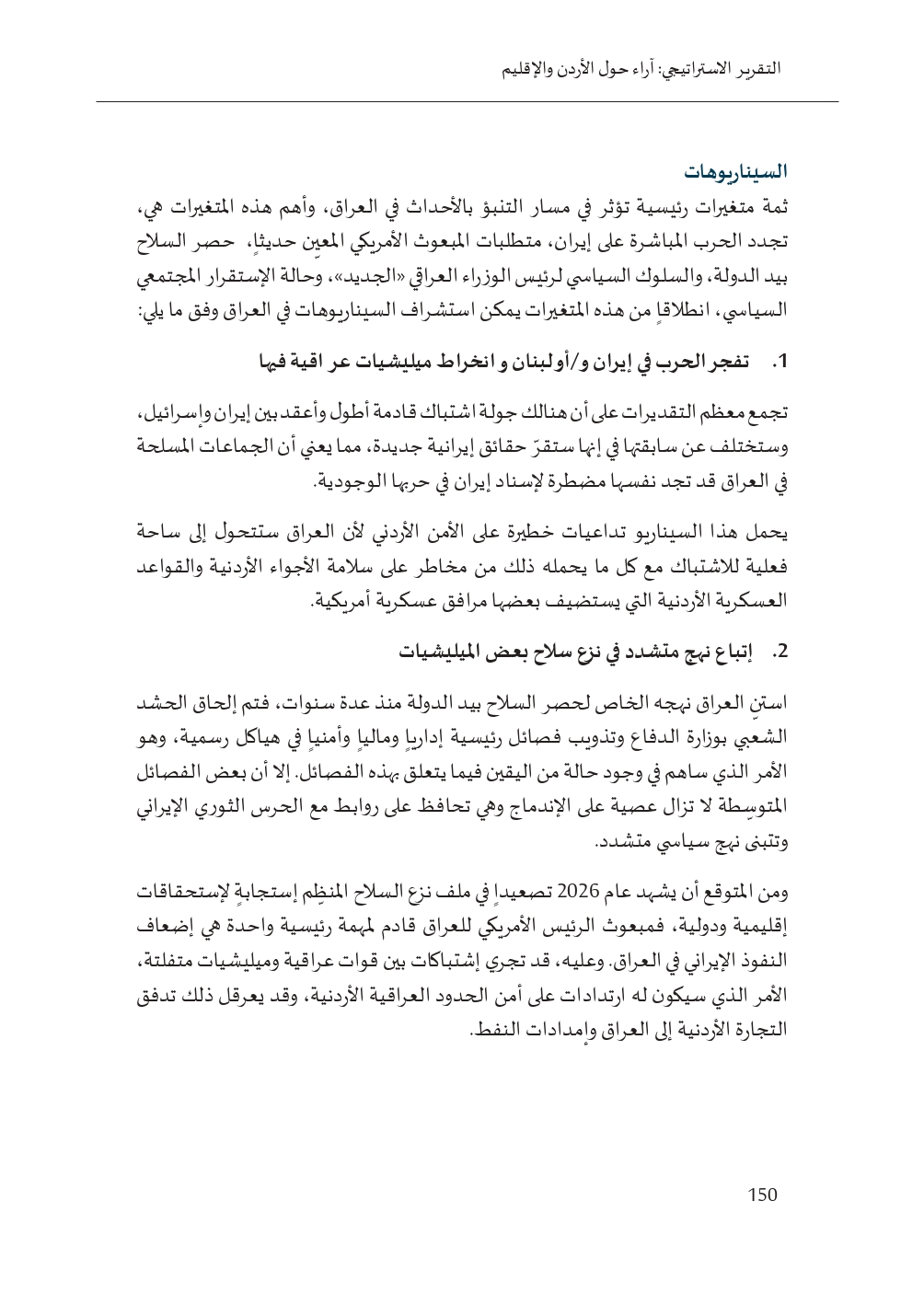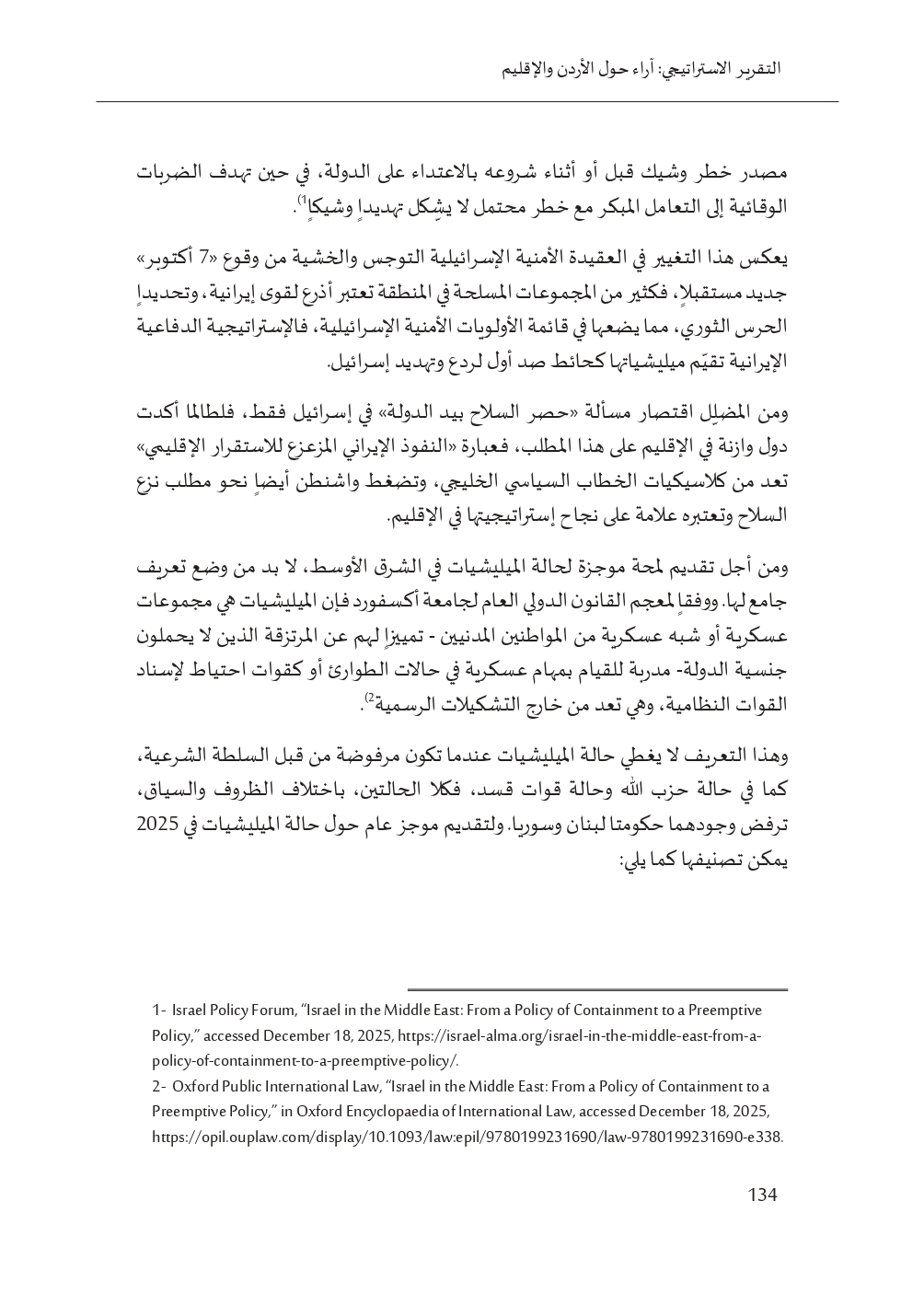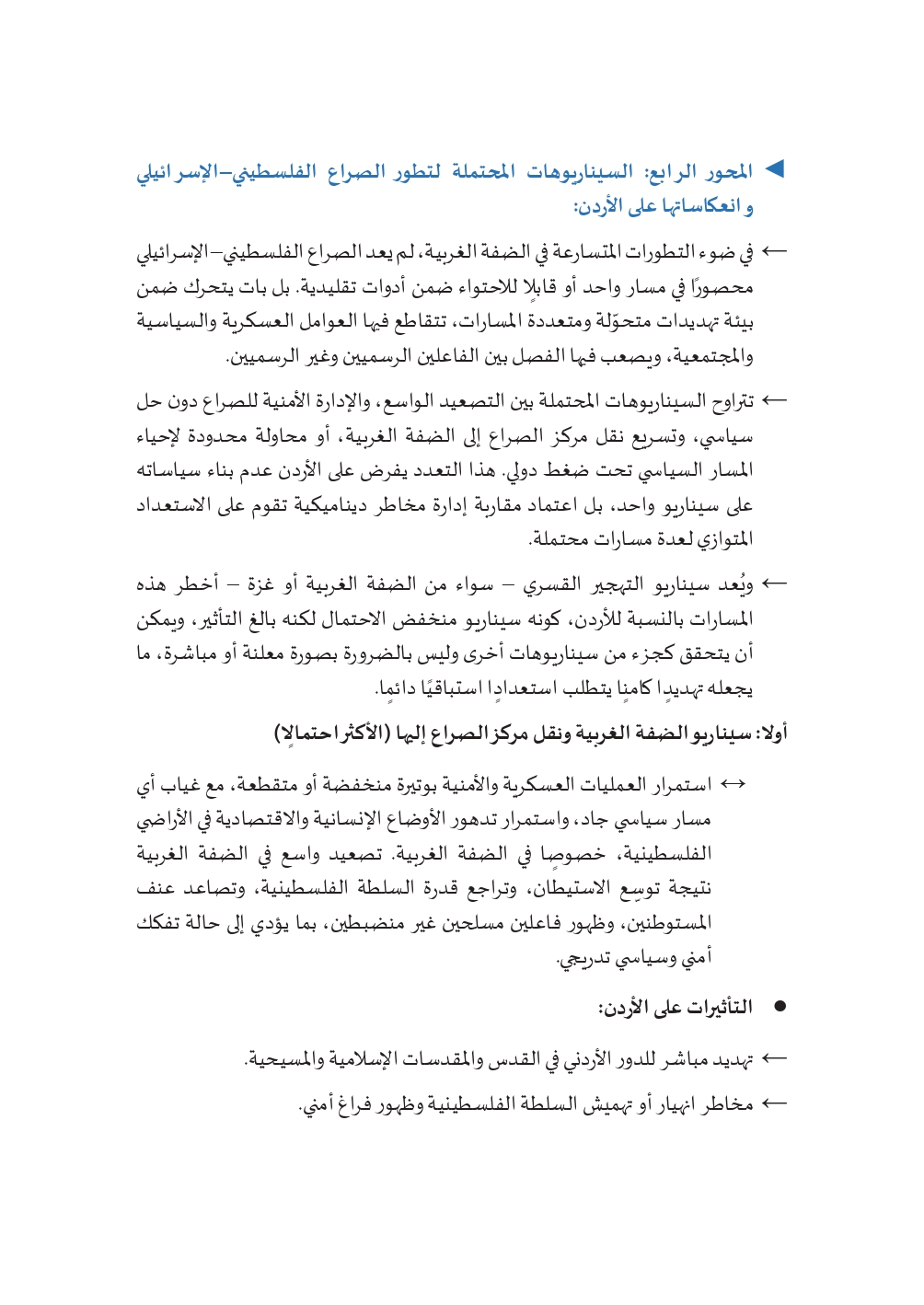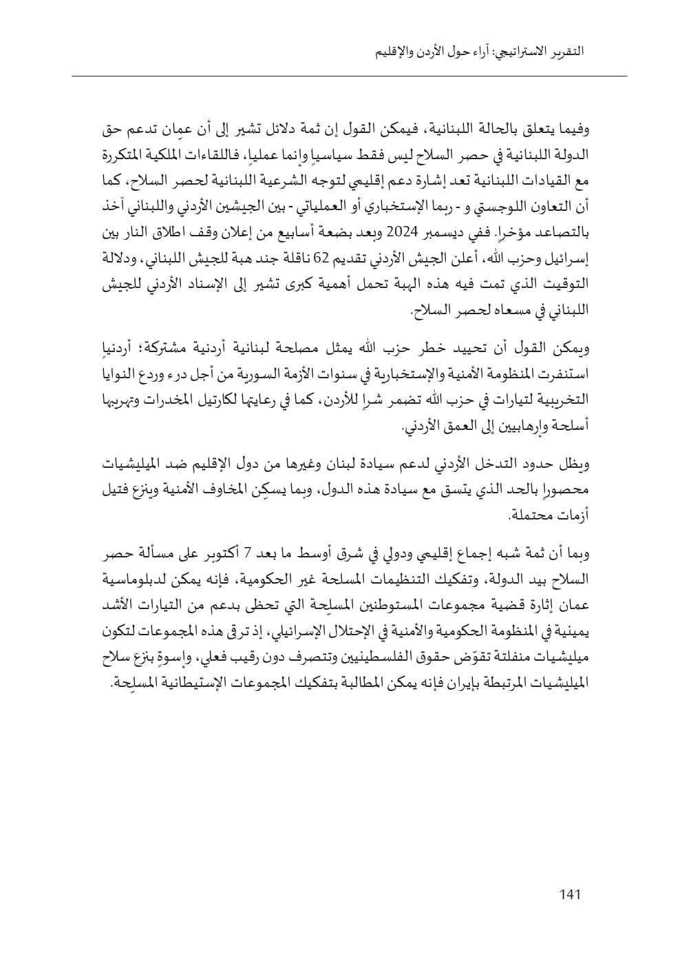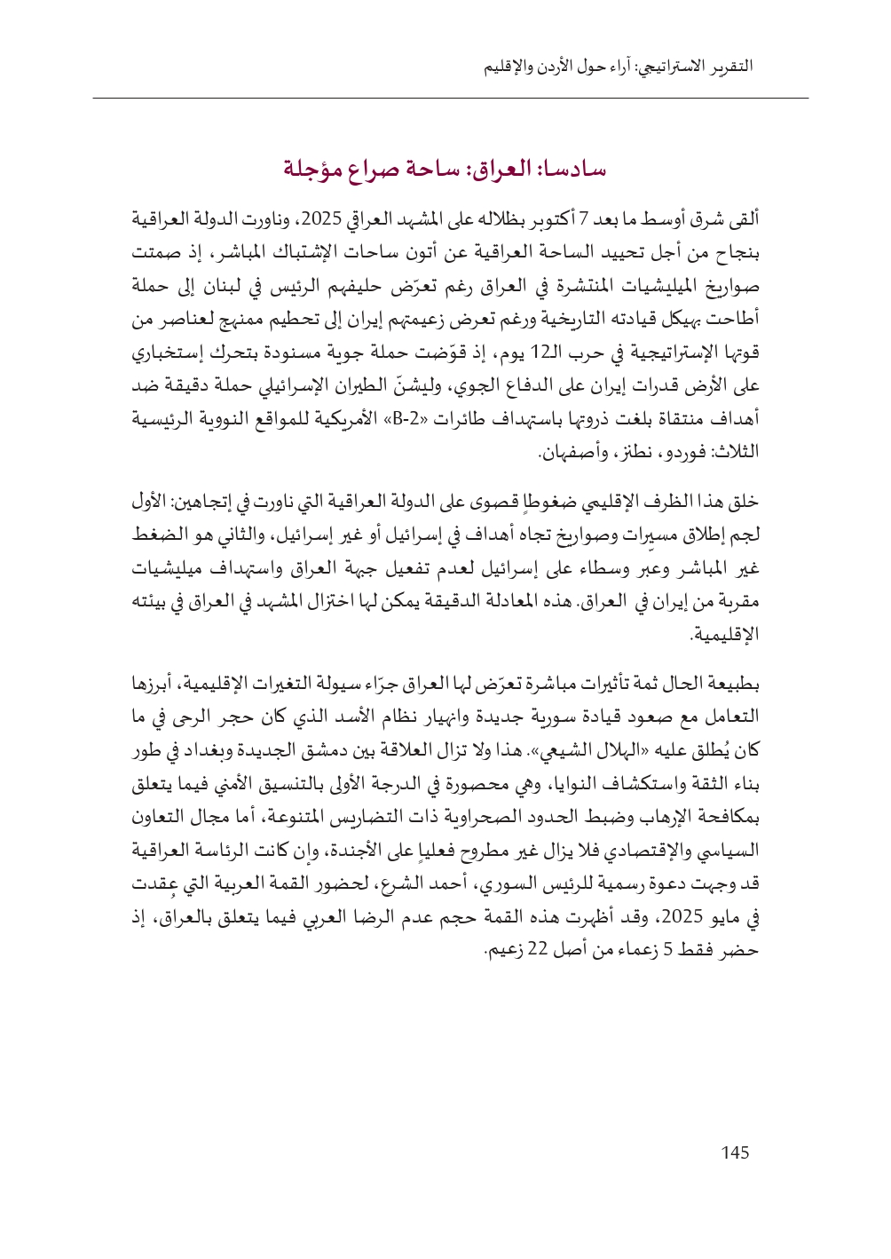 وينطلق التقرير من مقاربة تحليلية منهجية تقوم على استشراف السيناريوهات وتقدير المخاطر، ومواءمتها مع مرتكزات استراتيجية الأمن الوطني الأردني، وصولًا إلى بلورة مجموعة من المقترحات والتوصيات العملية القابلة للتنفيذ، بما يعزز قدرة صانع القرار على التعامل مع التحولات المتسارعة في الإقليم والعالم.