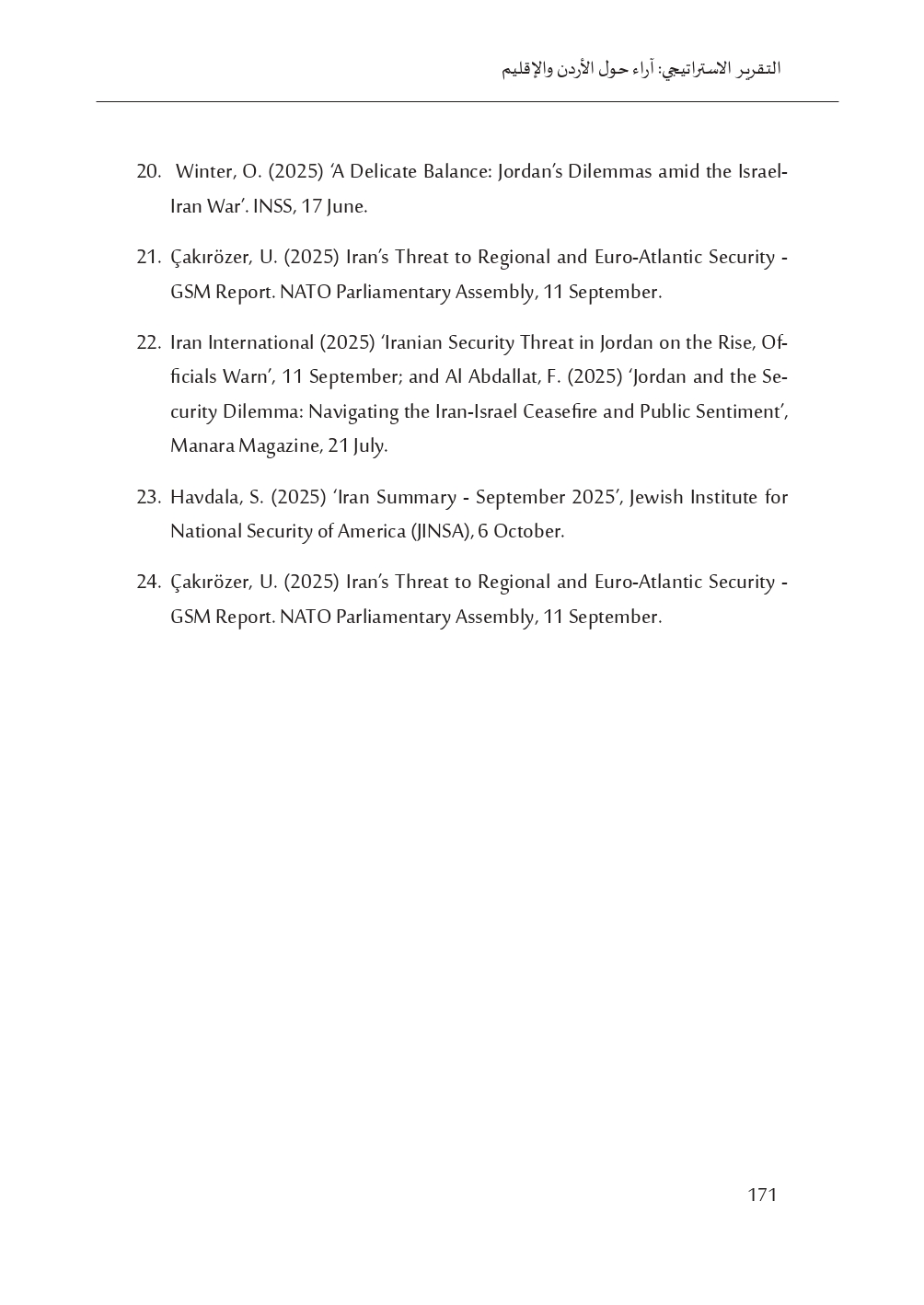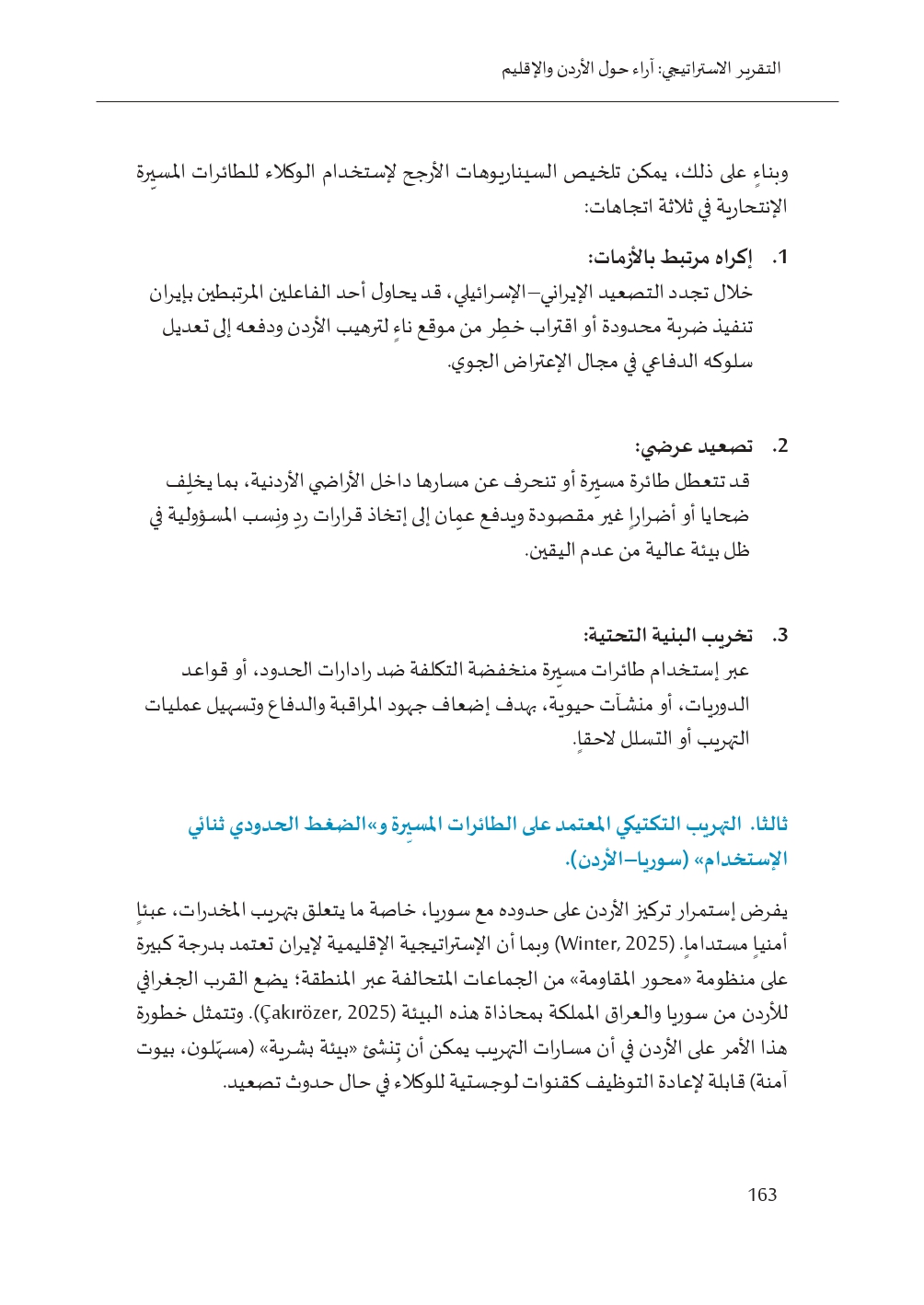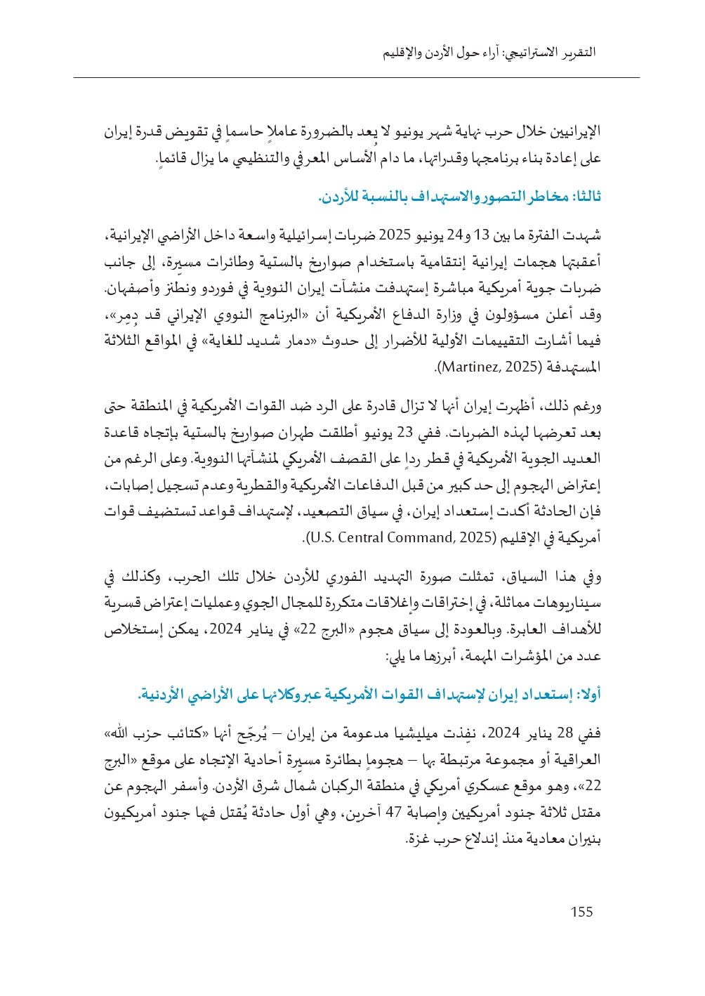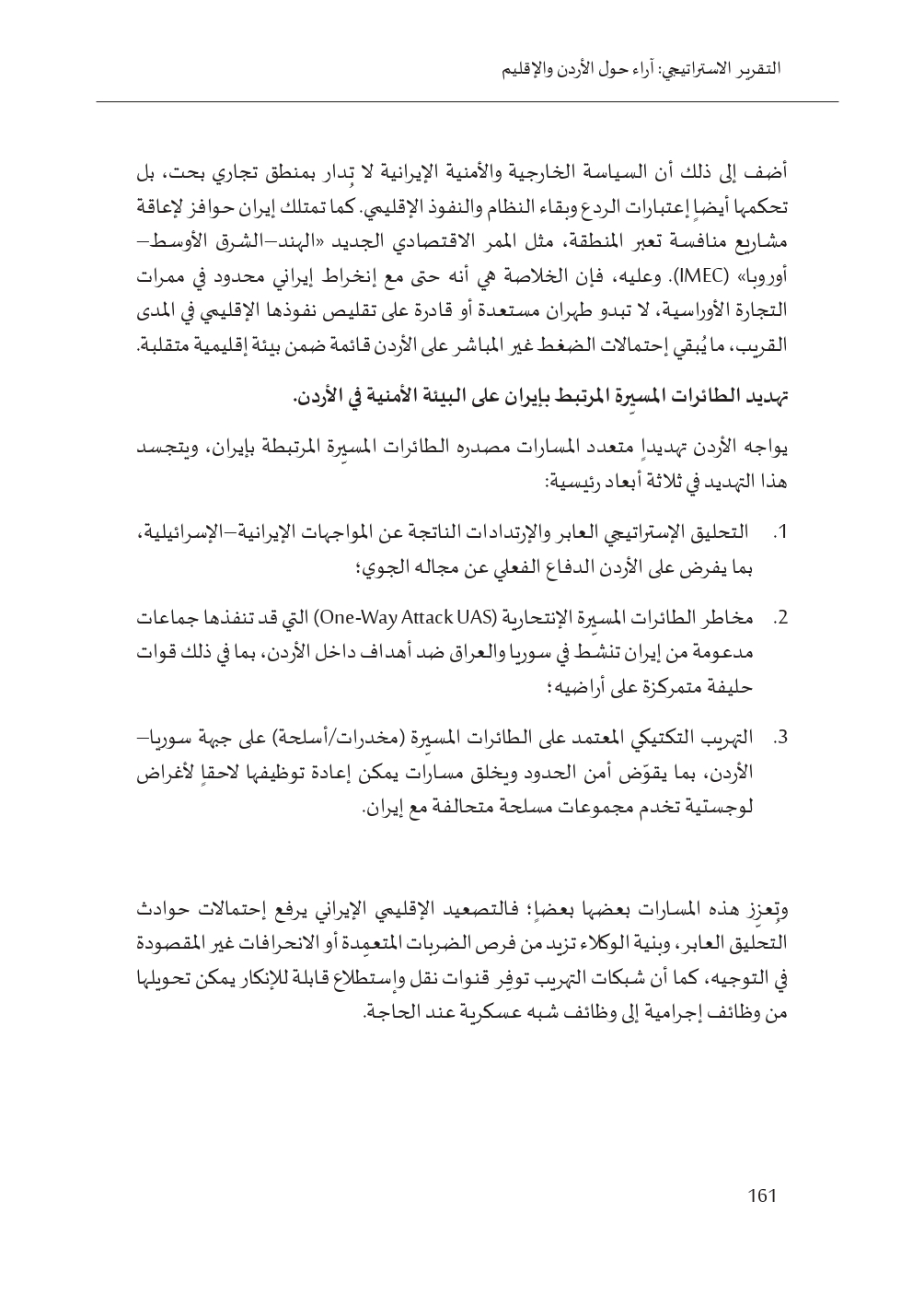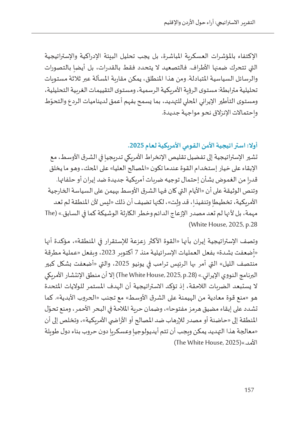 وينطلق التقرير من مقاربة تحليلية منهجية تقوم على استشراف السيناريوهات وتقدير المخاطر، ومواءمتها مع مرتكزات استراتيجية الأمن الوطني الأردني، وصولًا إلى بلورة مجموعة من المقترحات والتوصيات العملية القابلة للتنفيذ، بما يعزز قدرة صانع القرار على التعامل مع التحولات المتسارعة في الإقليم والعالم.