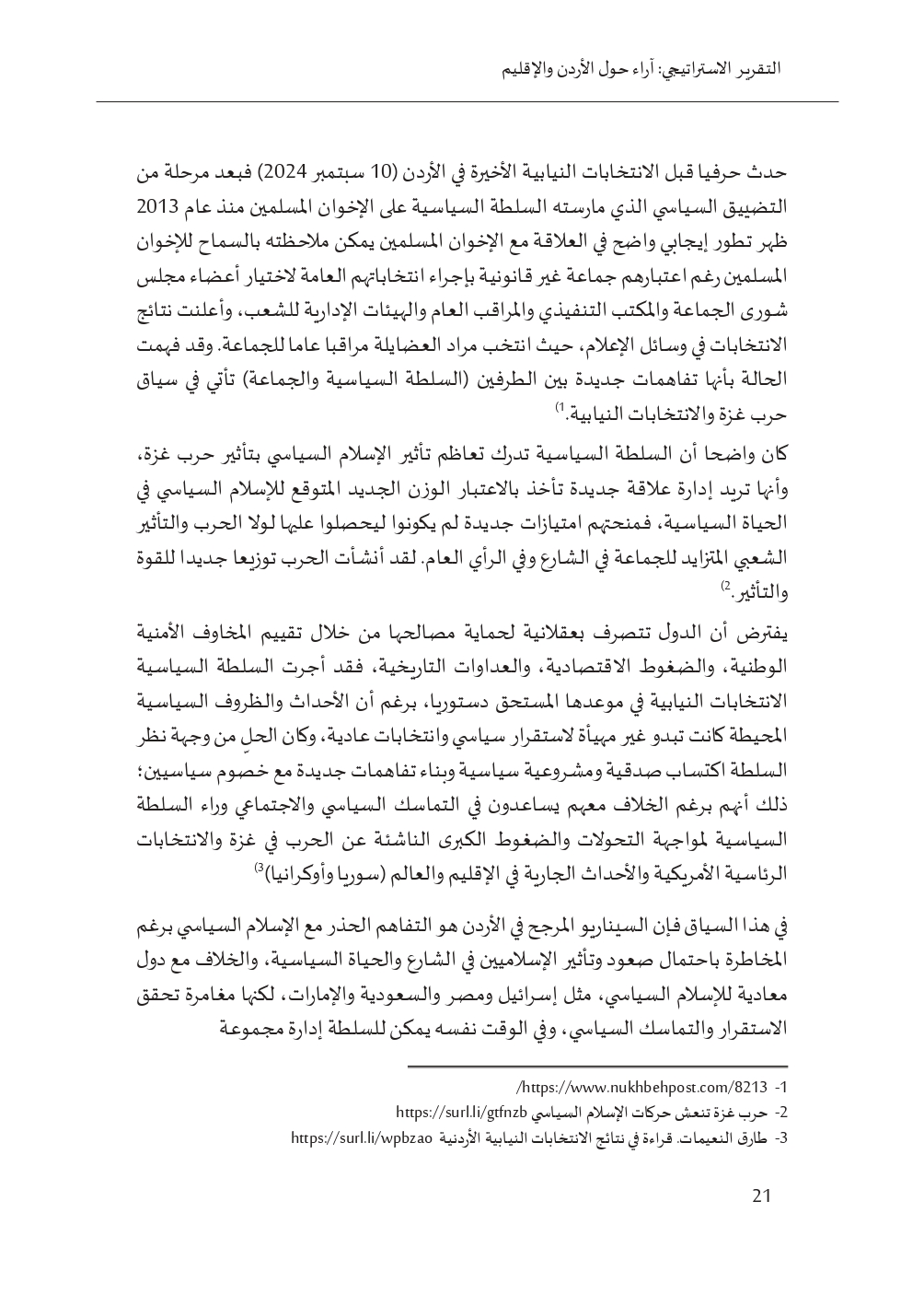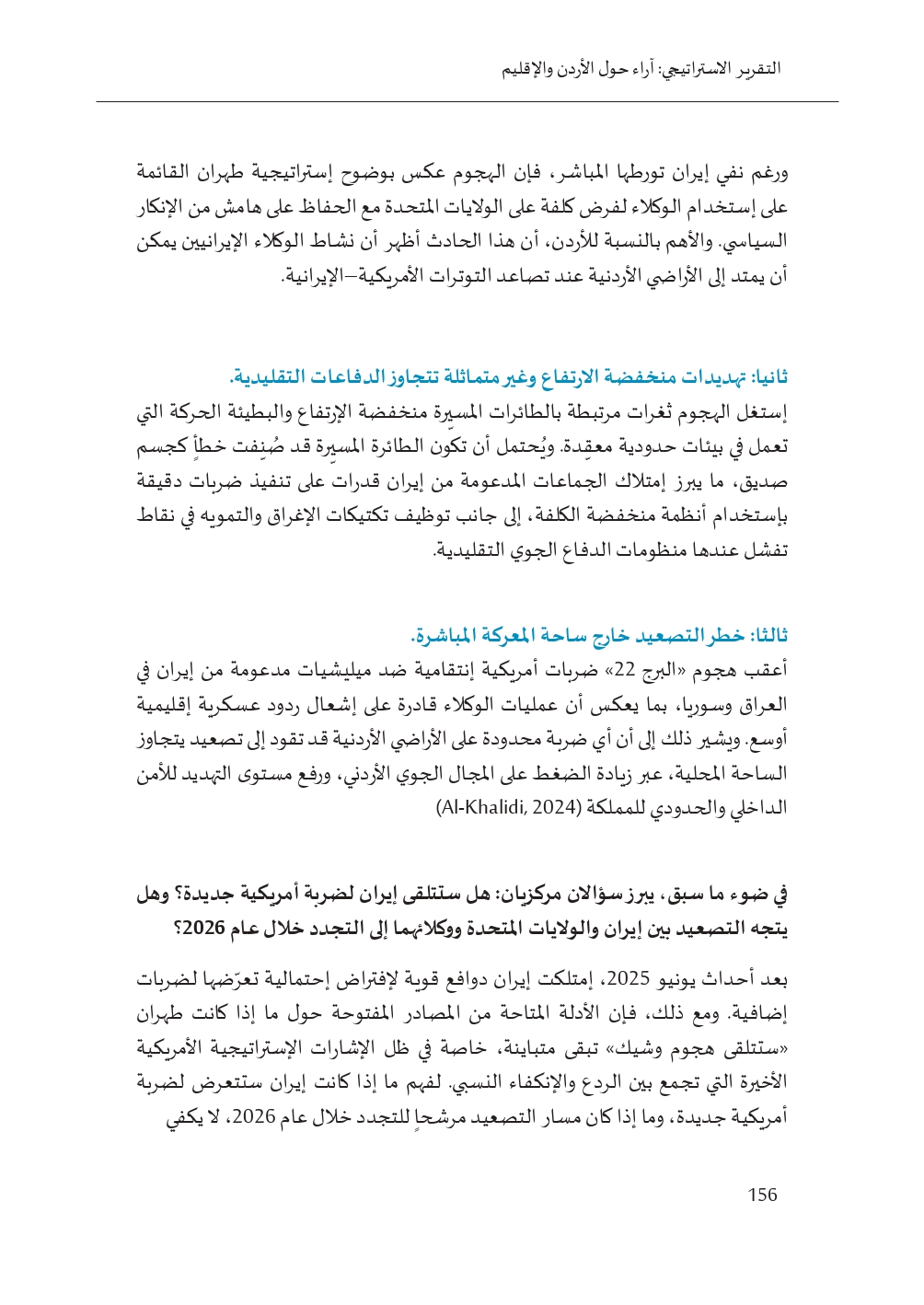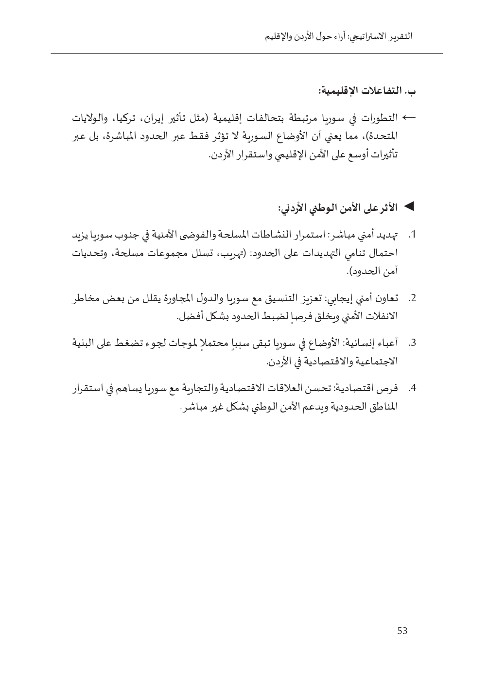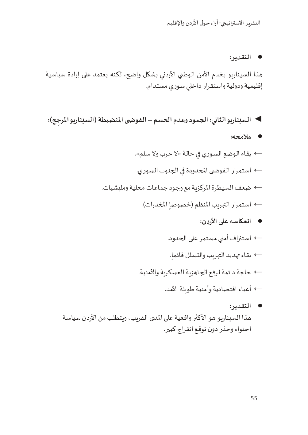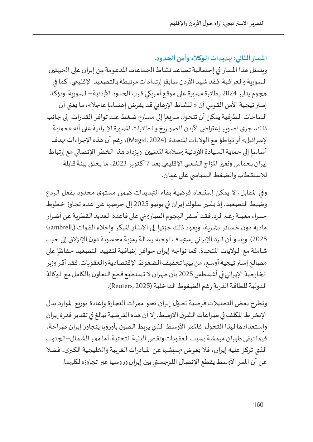 وينطلق التقرير من مقاربة تحليلية منهجية تقوم على استشراف السيناريوهات وتقدير المخاطر، ومواءمتها مع مرتكزات استراتيجية الأمن الوطني الأردني، وصولًا إلى بلورة مجموعة من المقترحات والتوصيات العملية القابلة للتنفيذ، بما يعزز قدرة صانع القرار على التعامل مع التحولات المتسارعة في الإقليم والعالم.