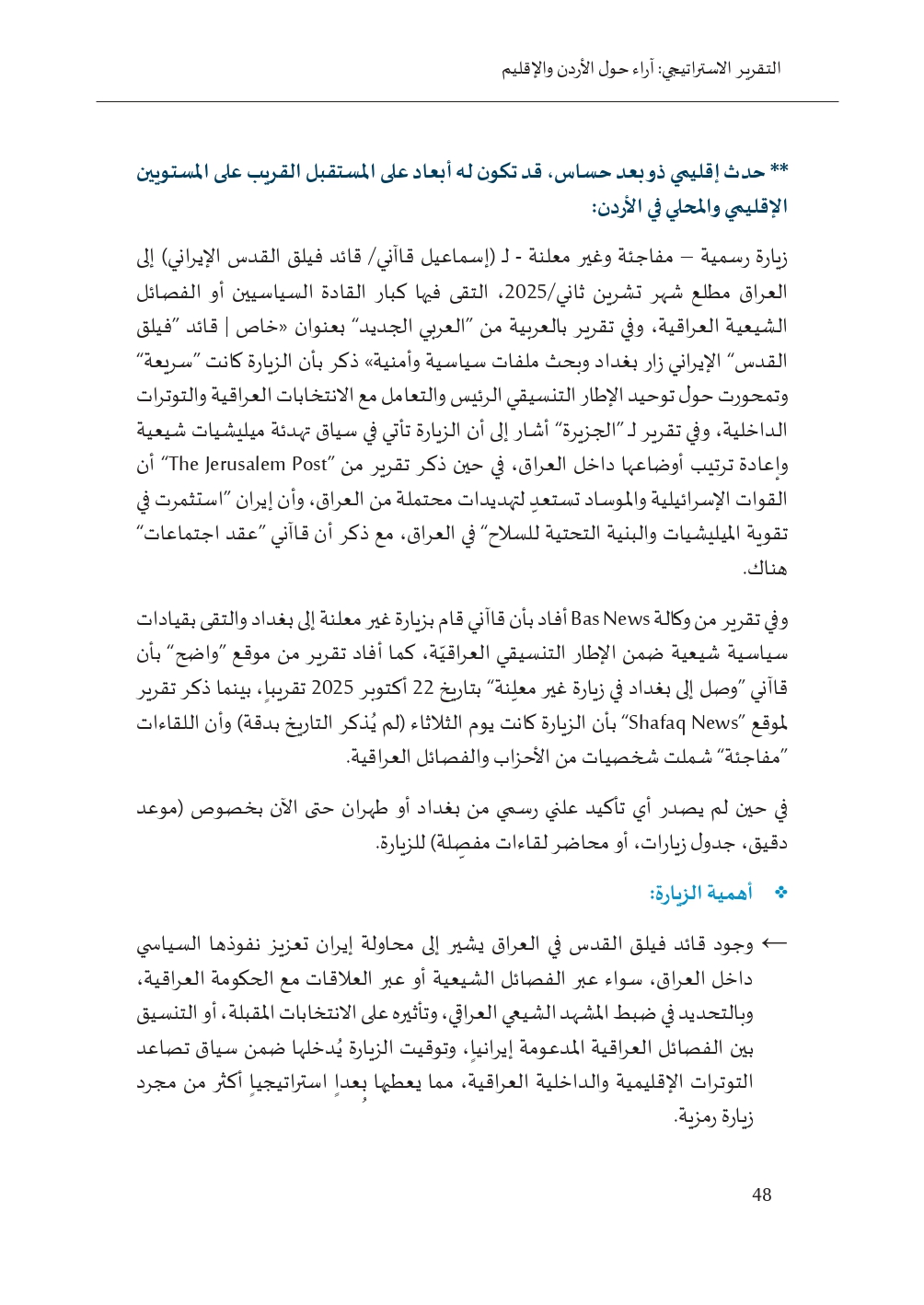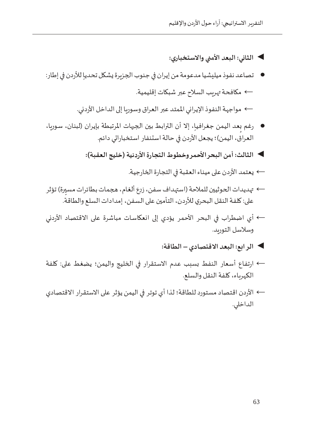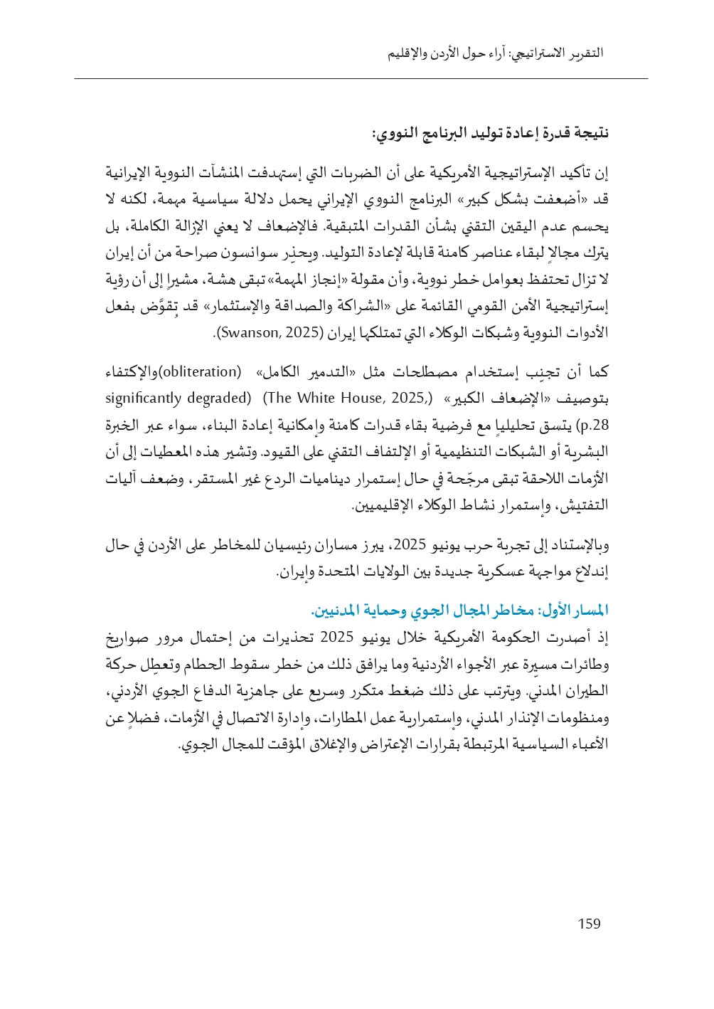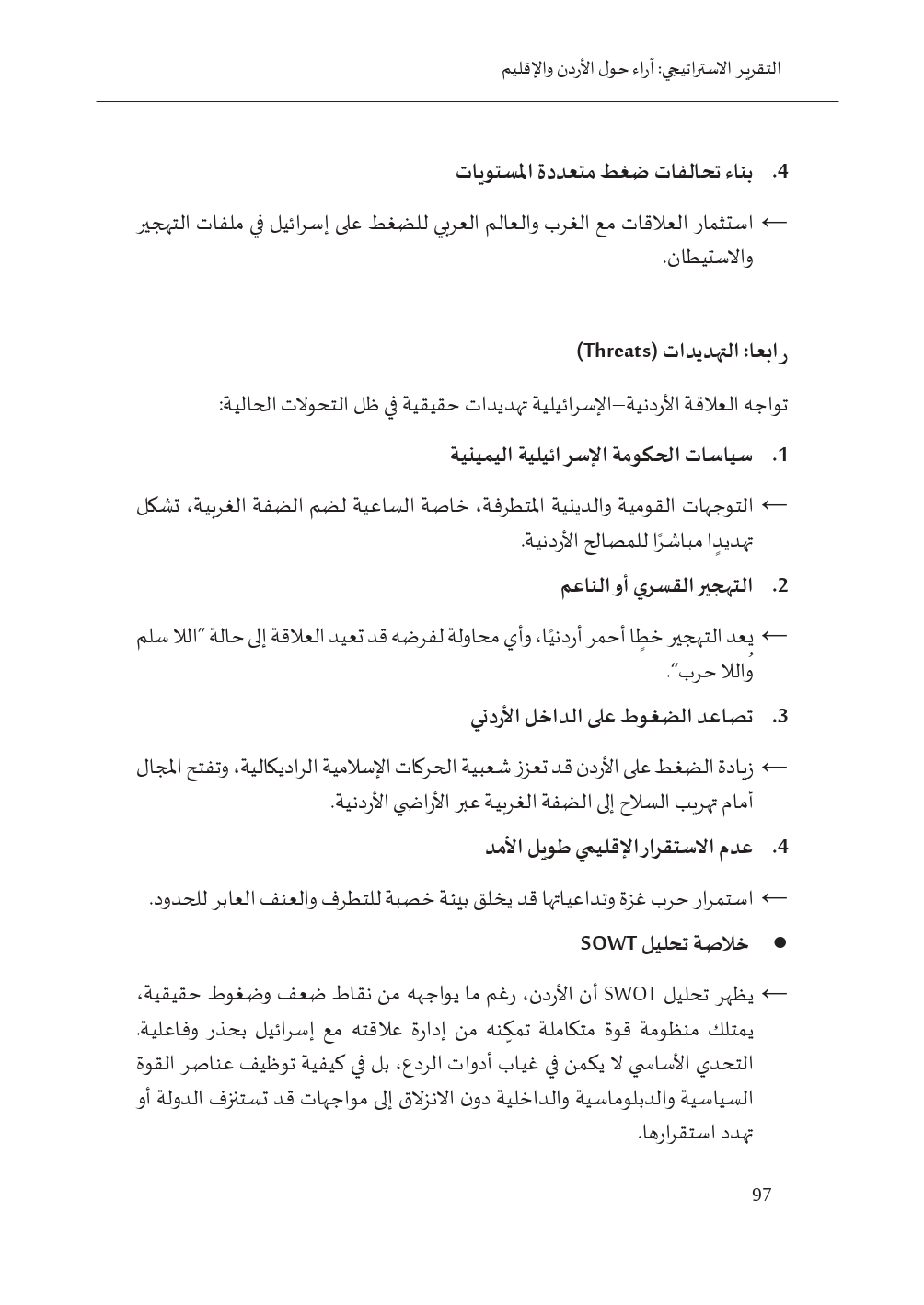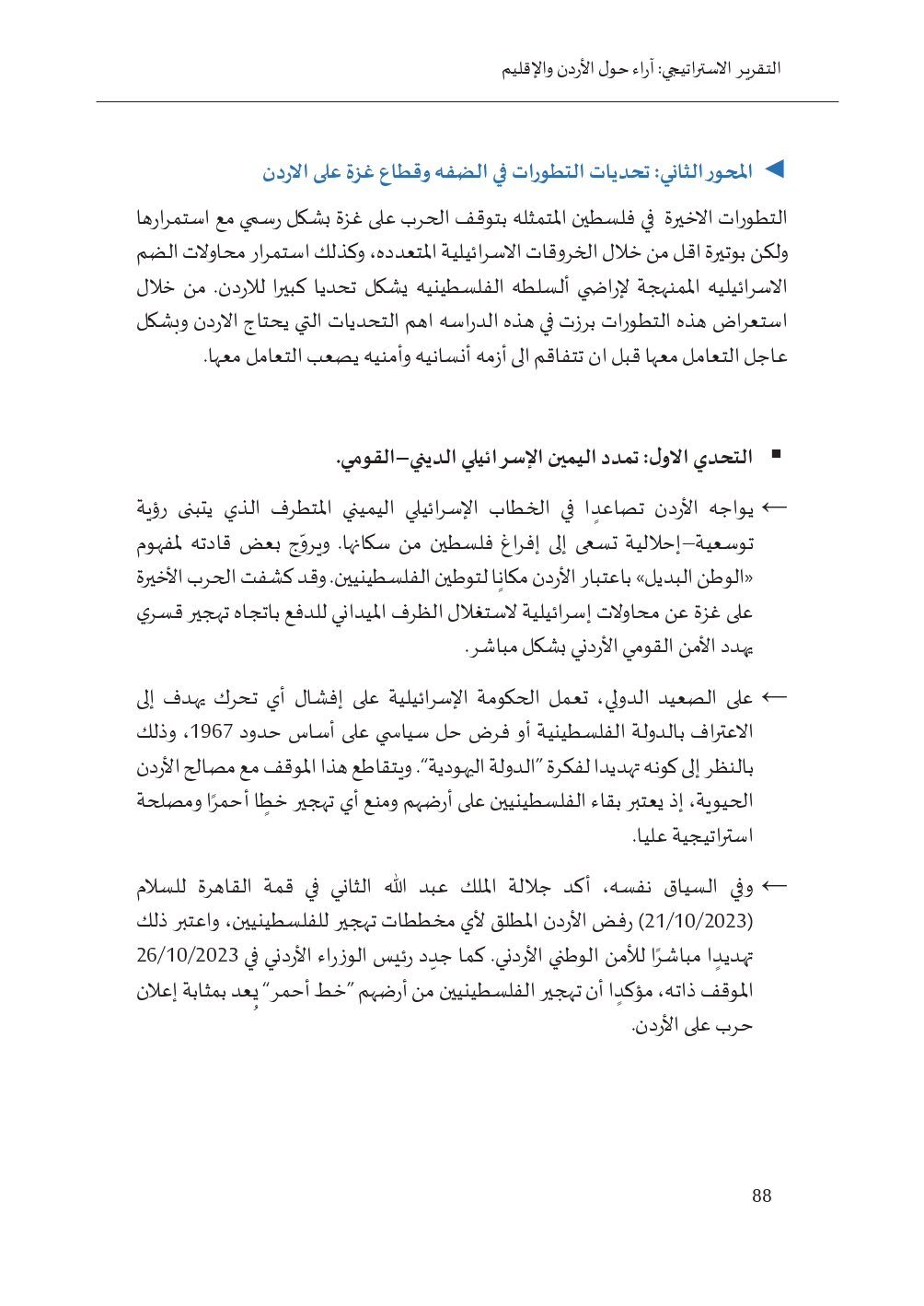 وينطلق التقرير من مقاربة تحليلية منهجية تقوم على استشراف السيناريوهات وتقدير المخاطر، ومواءمتها مع مرتكزات استراتيجية الأمن الوطني الأردني، وصولًا إلى بلورة مجموعة من المقترحات والتوصيات العملية القابلة للتنفيذ، بما يعزز قدرة صانع القرار على التعامل مع التحولات المتسارعة في الإقليم والعالم.