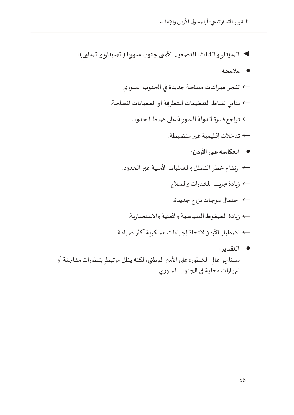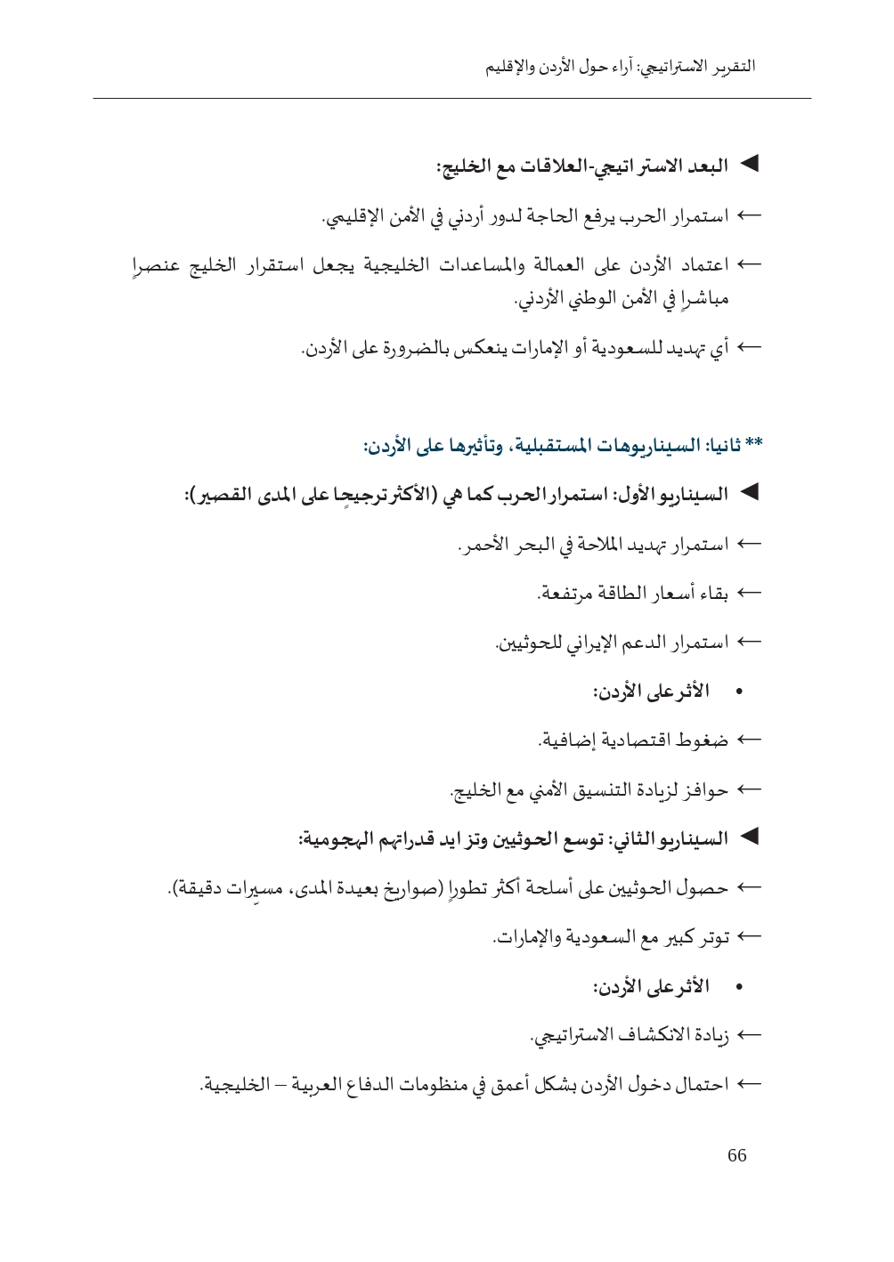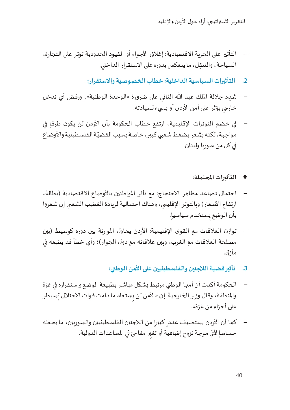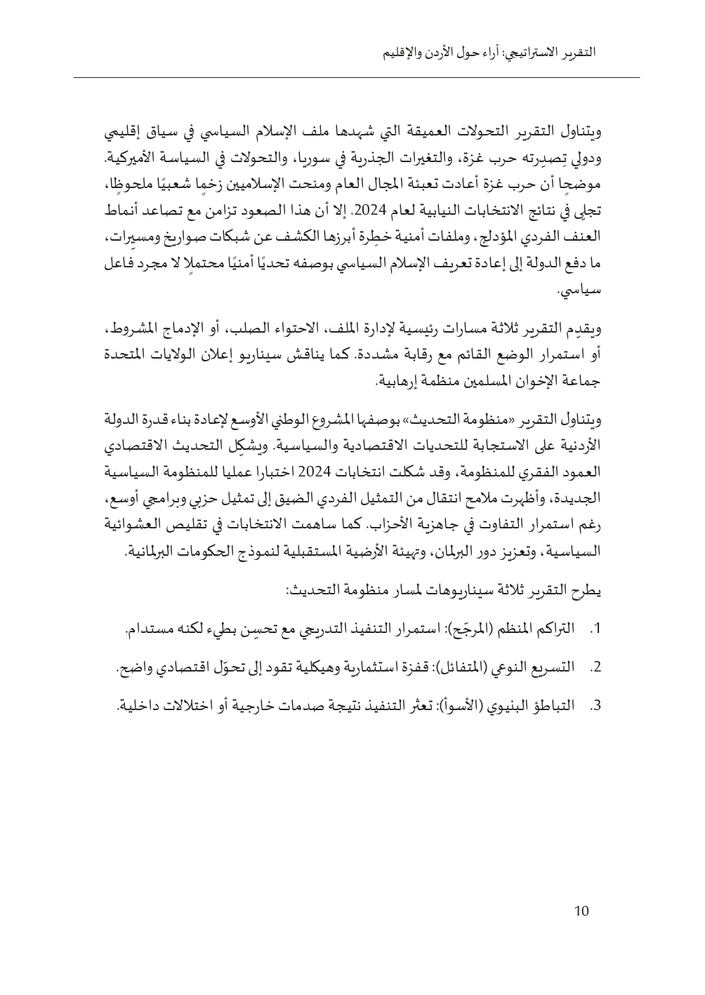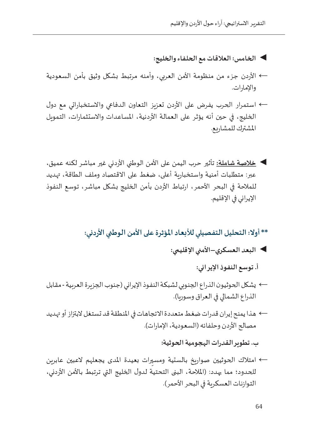 وينطلق التقرير من مقاربة تحليلية منهجية تقوم على استشراف السيناريوهات وتقدير المخاطر، ومواءمتها مع مرتكزات استراتيجية الأمن الوطني الأردني، وصولًا إلى بلورة مجموعة من المقترحات والتوصيات العملية القابلة للتنفيذ، بما يعزز قدرة صانع القرار على التعامل مع التحولات المتسارعة في الإقليم والعالم.
