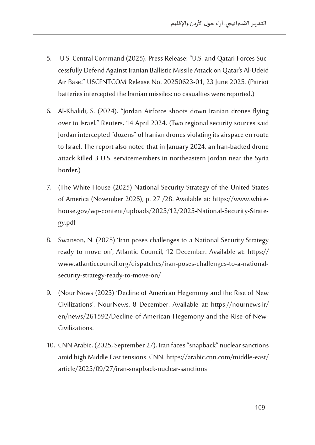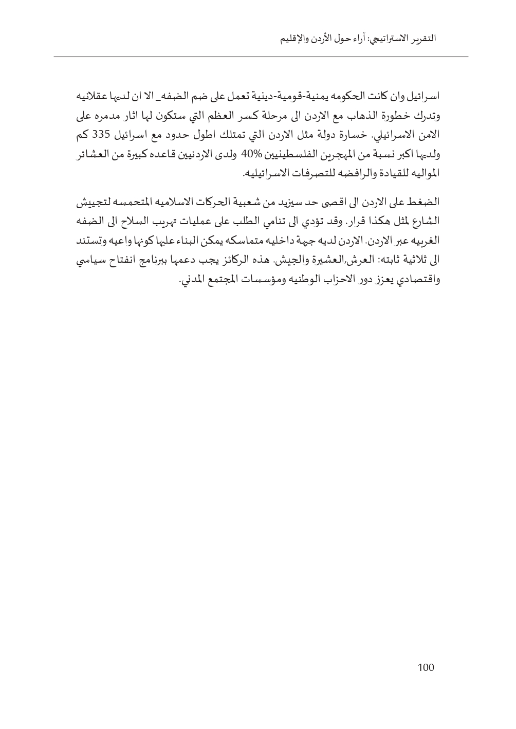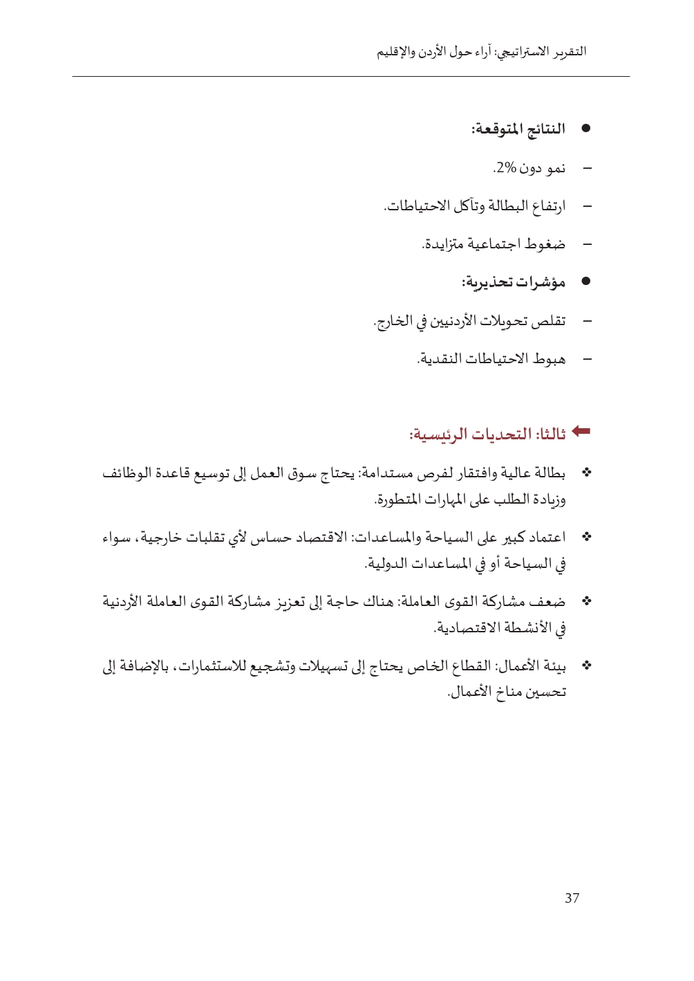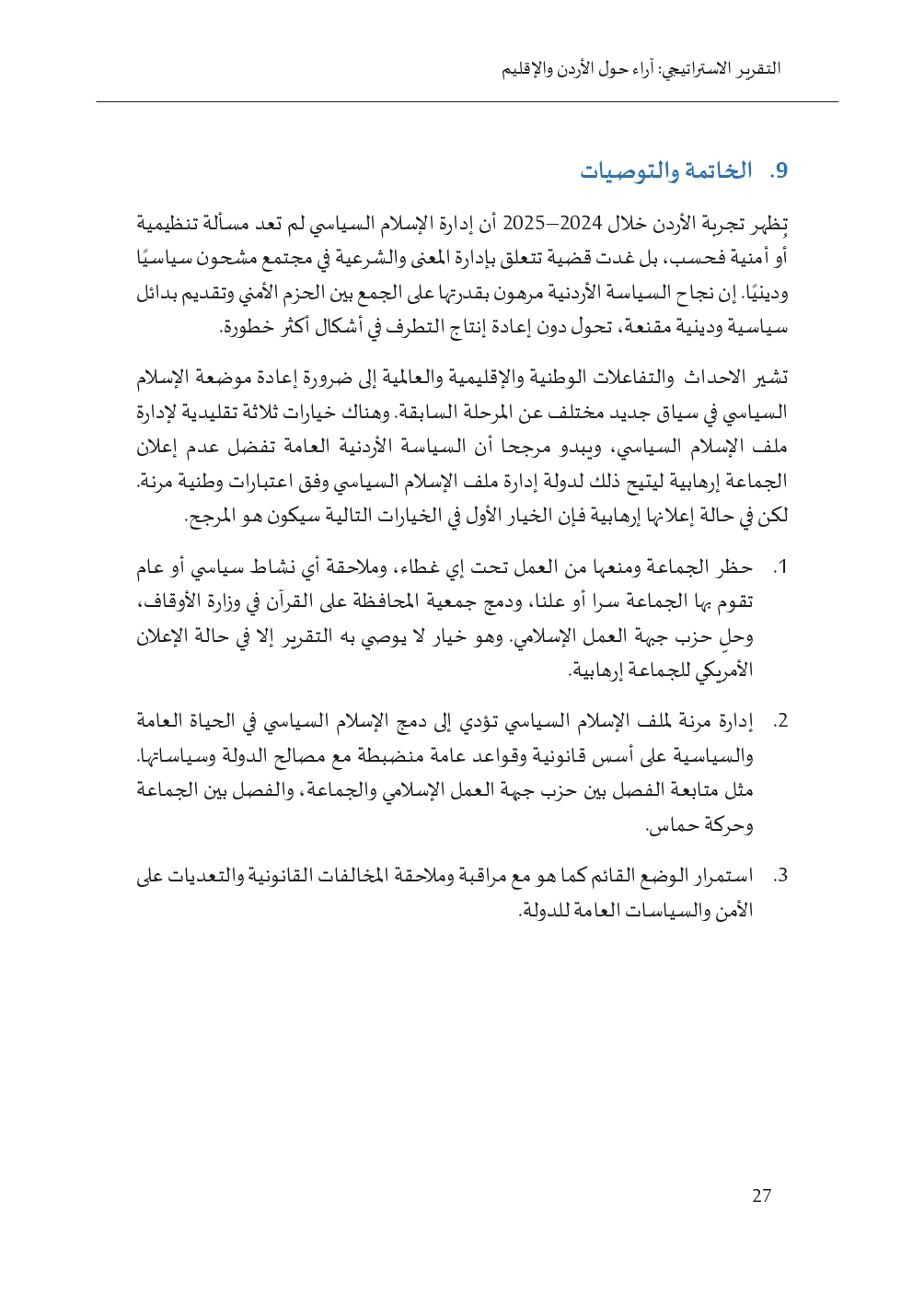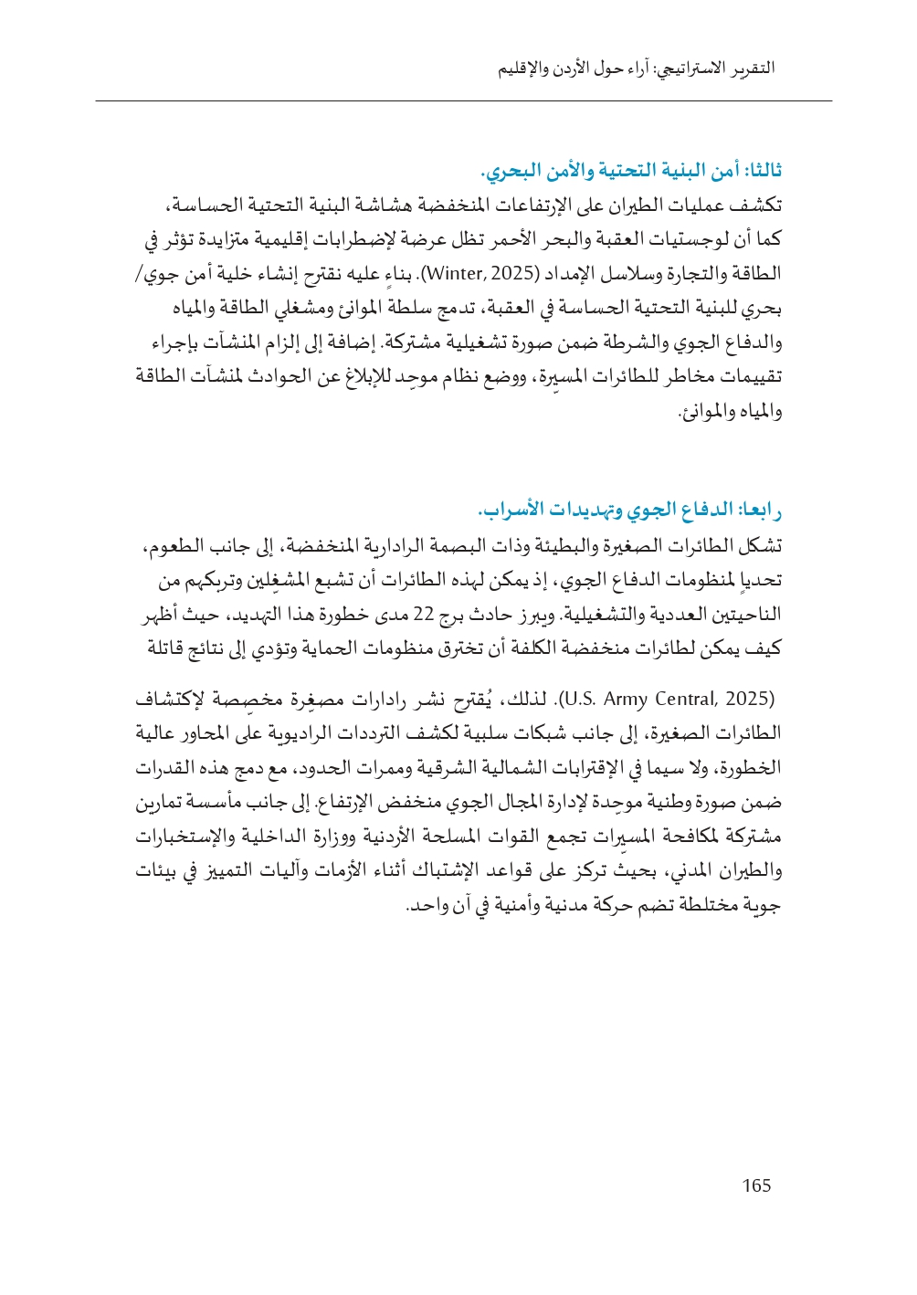 وينطلق التقرير من مقاربة تحليلية منهجية تقوم على استشراف السيناريوهات وتقدير المخاطر، ومواءمتها مع مرتكزات استراتيجية الأمن الوطني الأردني، وصولًا إلى بلورة مجموعة من المقترحات والتوصيات العملية القابلة للتنفيذ، بما يعزز قدرة صانع القرار على التعامل مع التحولات المتسارعة في الإقليم والعالم.