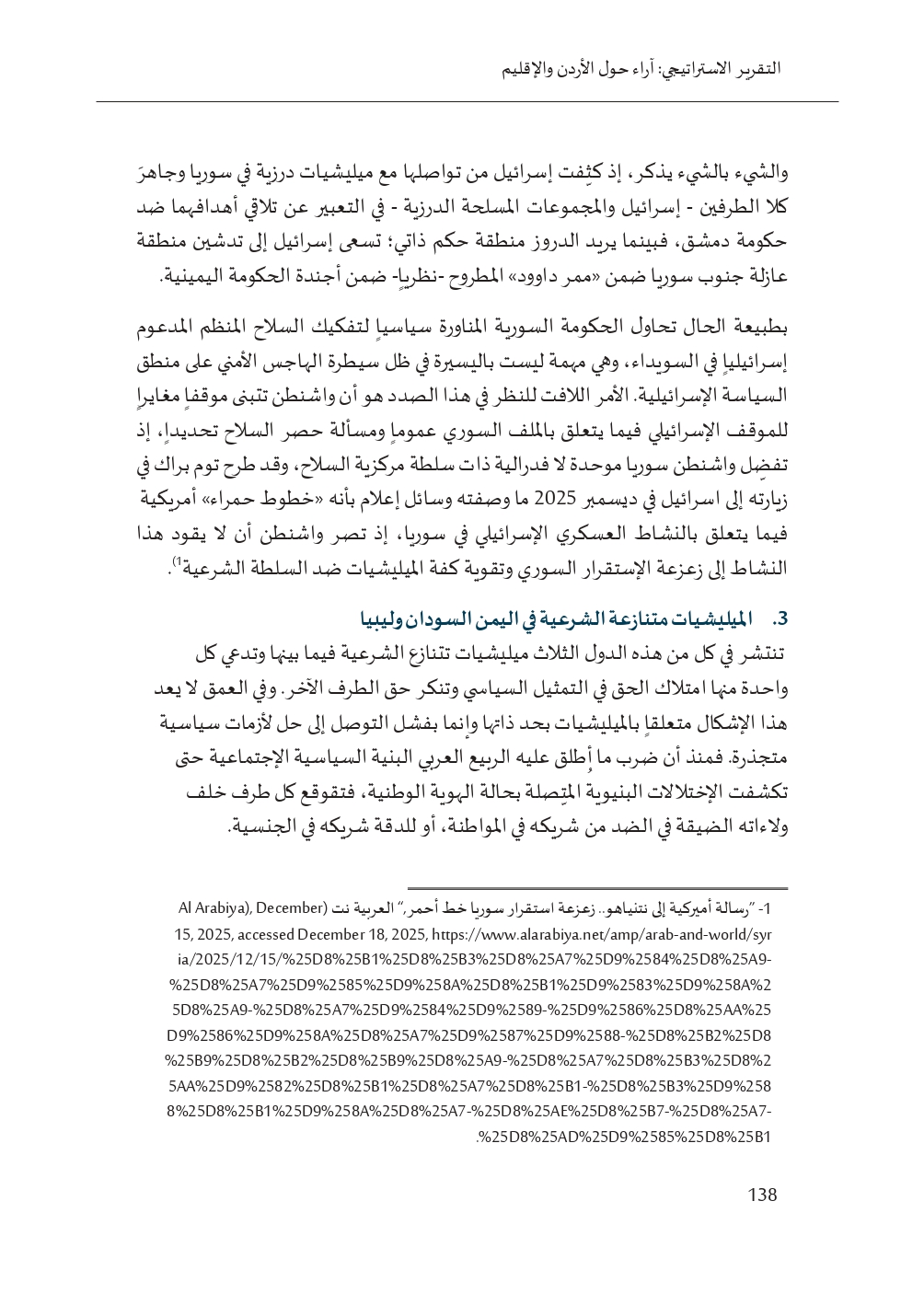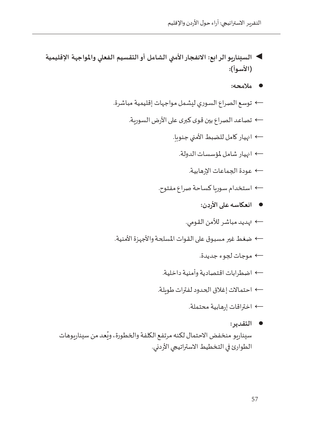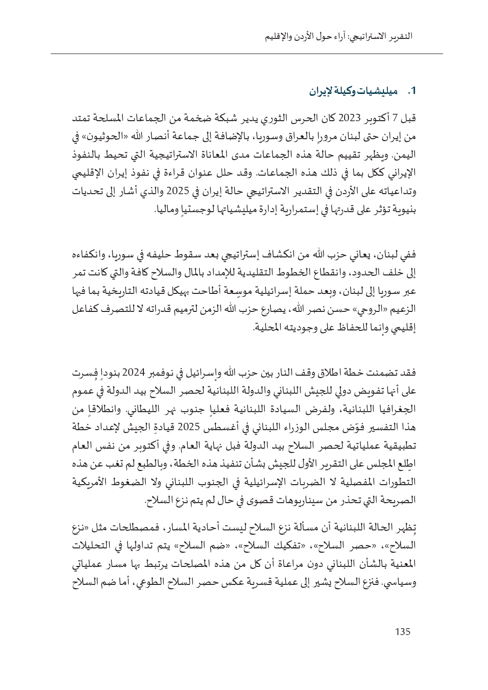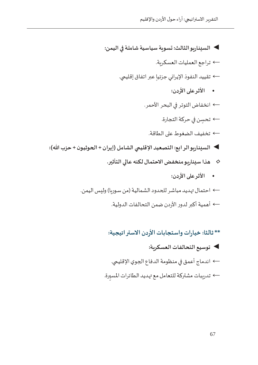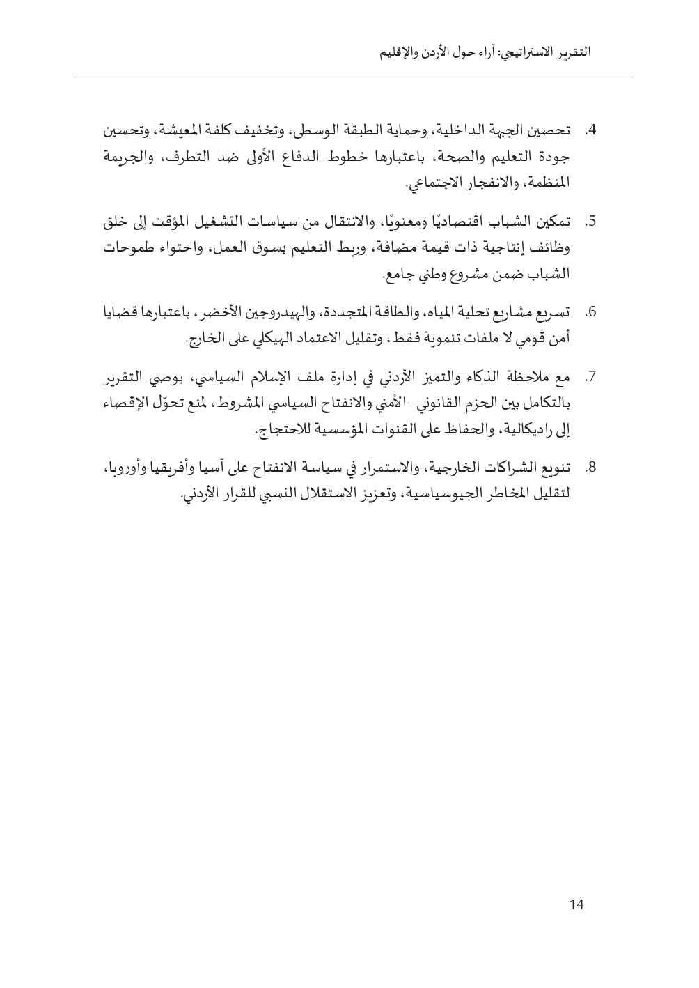 وينطلق التقرير من مقاربة تحليلية منهجية تقوم على استشراف السيناريوهات وتقدير المخاطر، ومواءمتها مع مرتكزات استراتيجية الأمن الوطني الأردني، وصولًا إلى بلورة مجموعة من المقترحات والتوصيات العملية القابلة للتنفيذ، بما يعزز قدرة صانع القرار على التعامل مع التحولات المتسارعة في الإقليم والعالم.