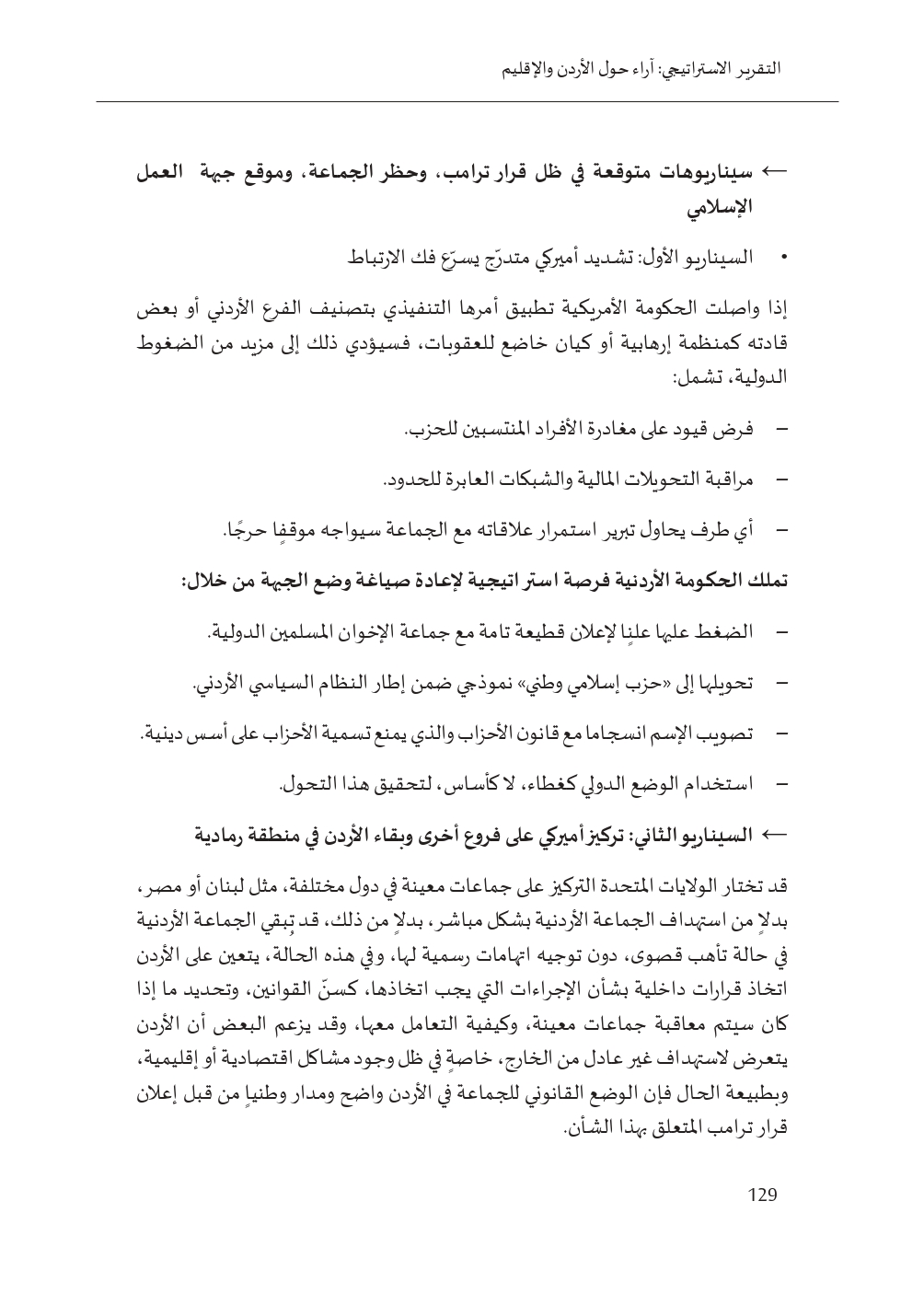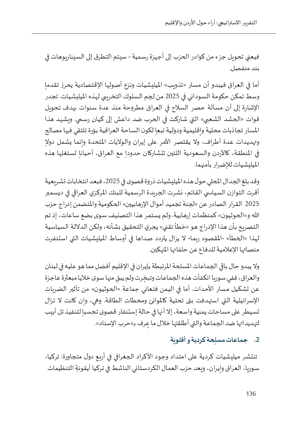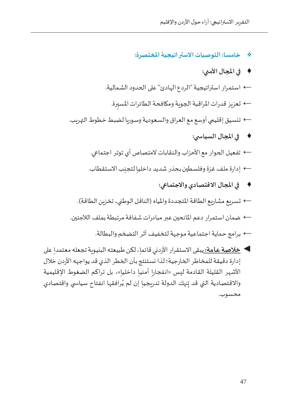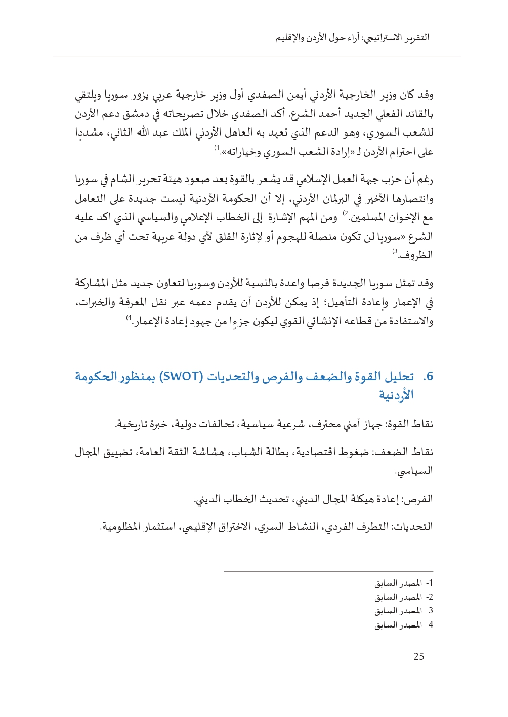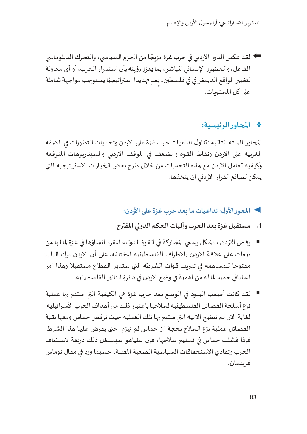 وينطلق التقرير من مقاربة تحليلية منهجية تقوم على استشراف السيناريوهات وتقدير المخاطر، ومواءمتها مع مرتكزات استراتيجية الأمن الوطني الأردني، وصولًا إلى بلورة مجموعة من المقترحات والتوصيات العملية القابلة للتنفيذ، بما يعزز قدرة صانع القرار على التعامل مع التحولات المتسارعة في الإقليم والعالم.