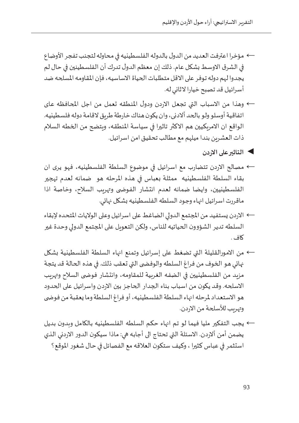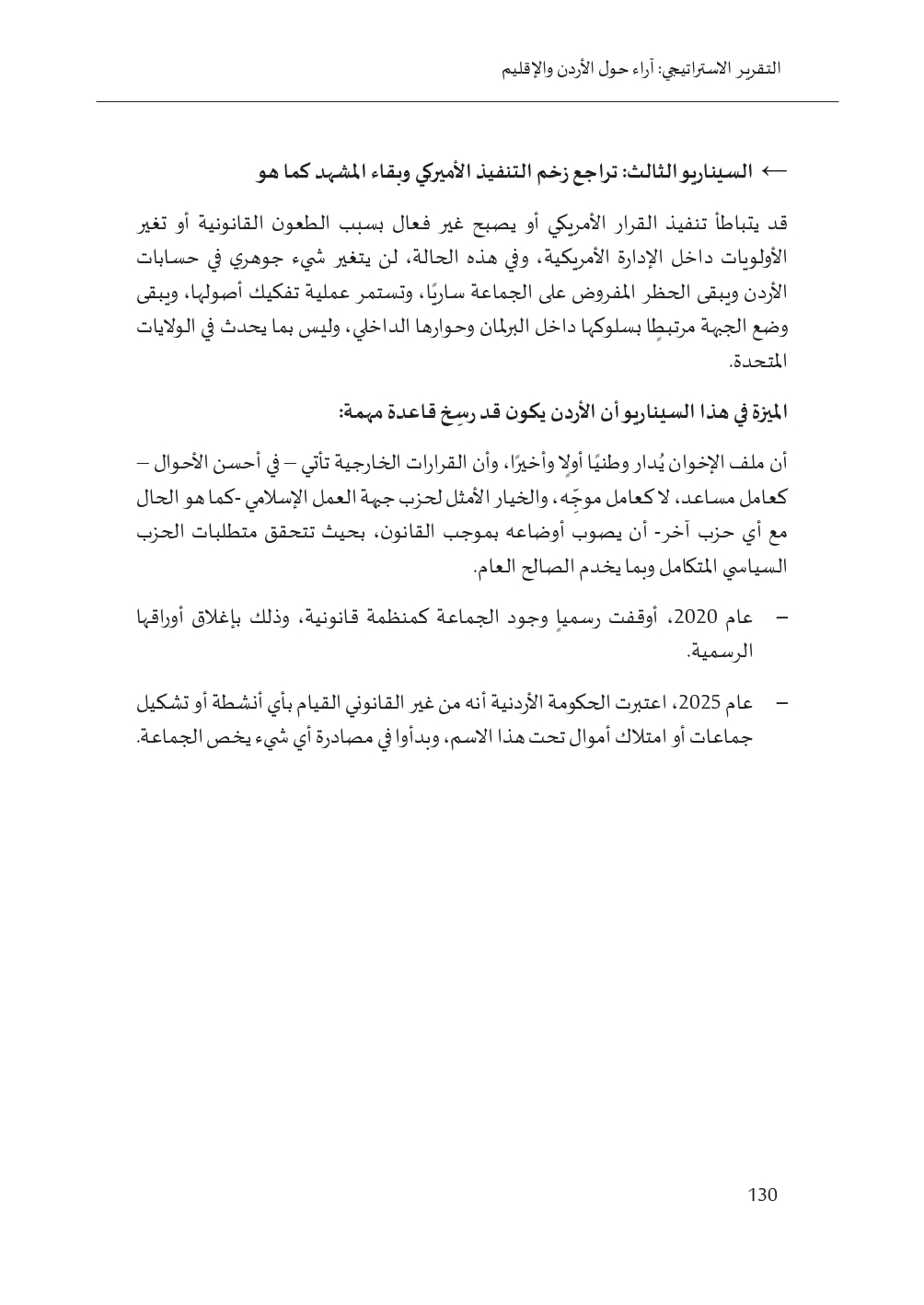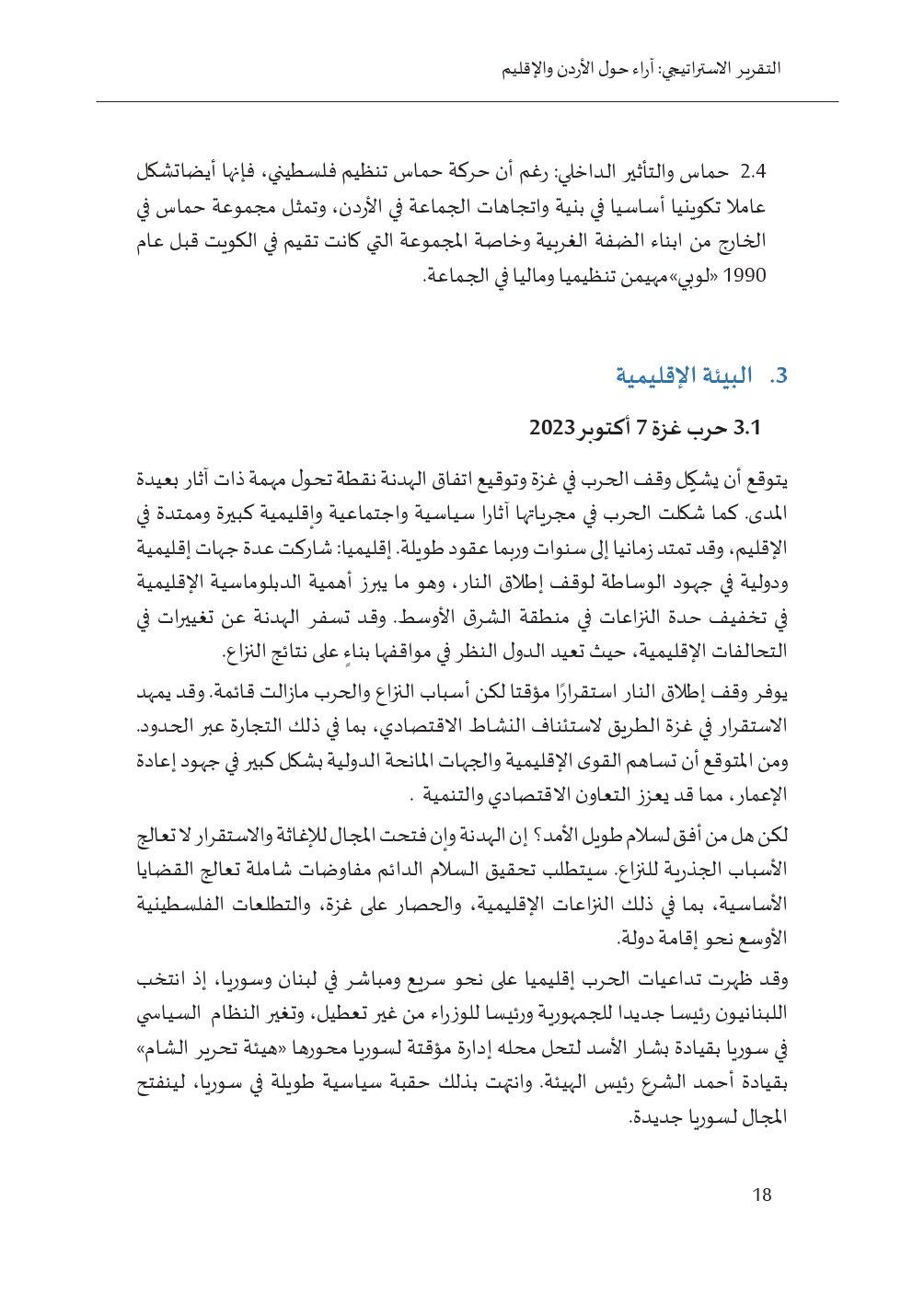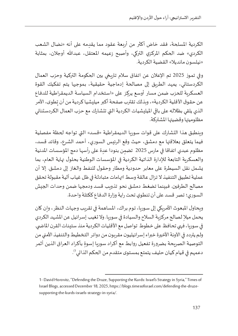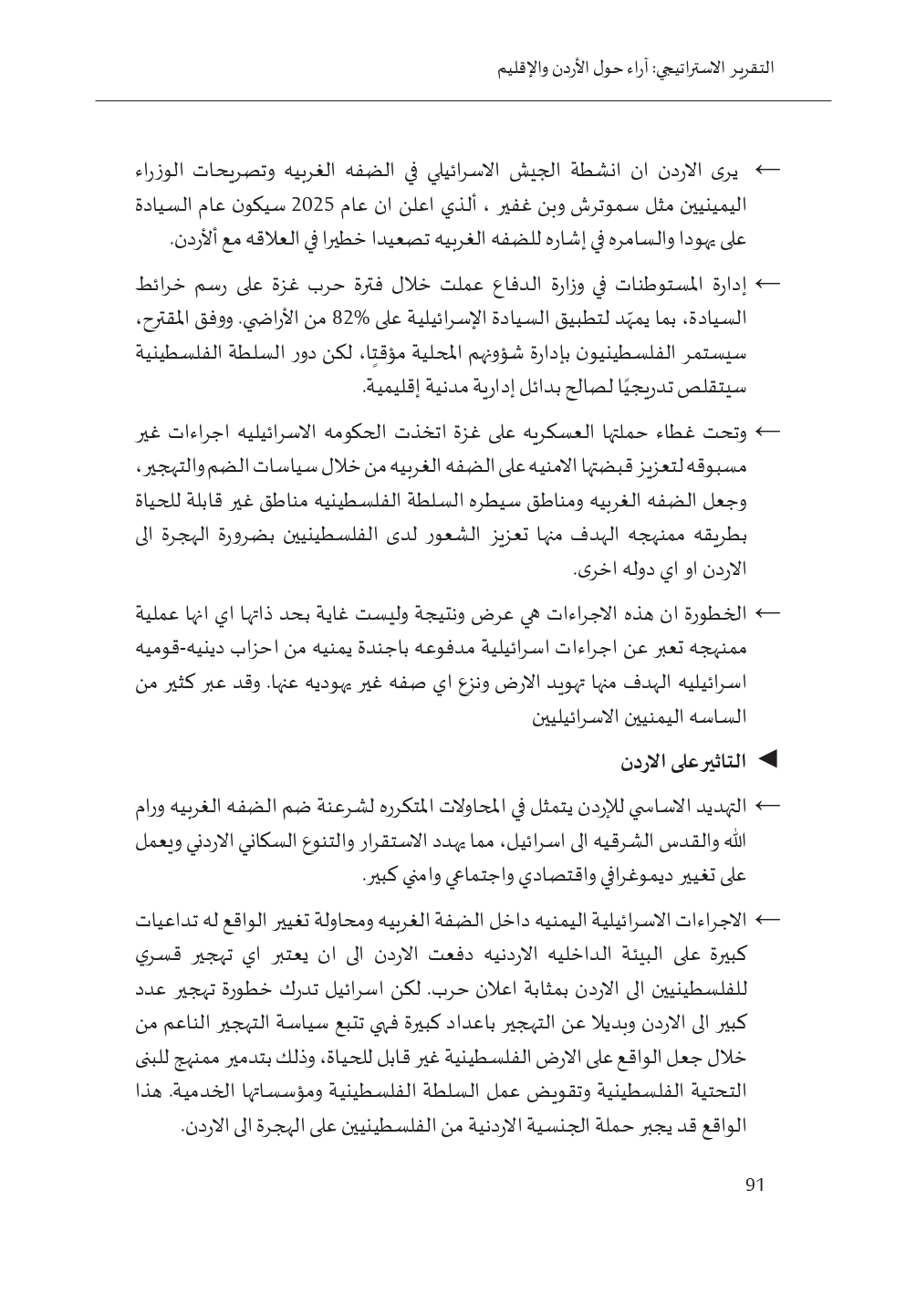 وينطلق التقرير من مقاربة تحليلية منهجية تقوم على استشراف السيناريوهات وتقدير المخاطر، ومواءمتها مع مرتكزات استراتيجية الأمن الوطني الأردني، وصولًا إلى بلورة مجموعة من المقترحات والتوصيات العملية القابلة للتنفيذ، بما يعزز قدرة صانع القرار على التعامل مع التحولات المتسارعة في الإقليم والعالم.