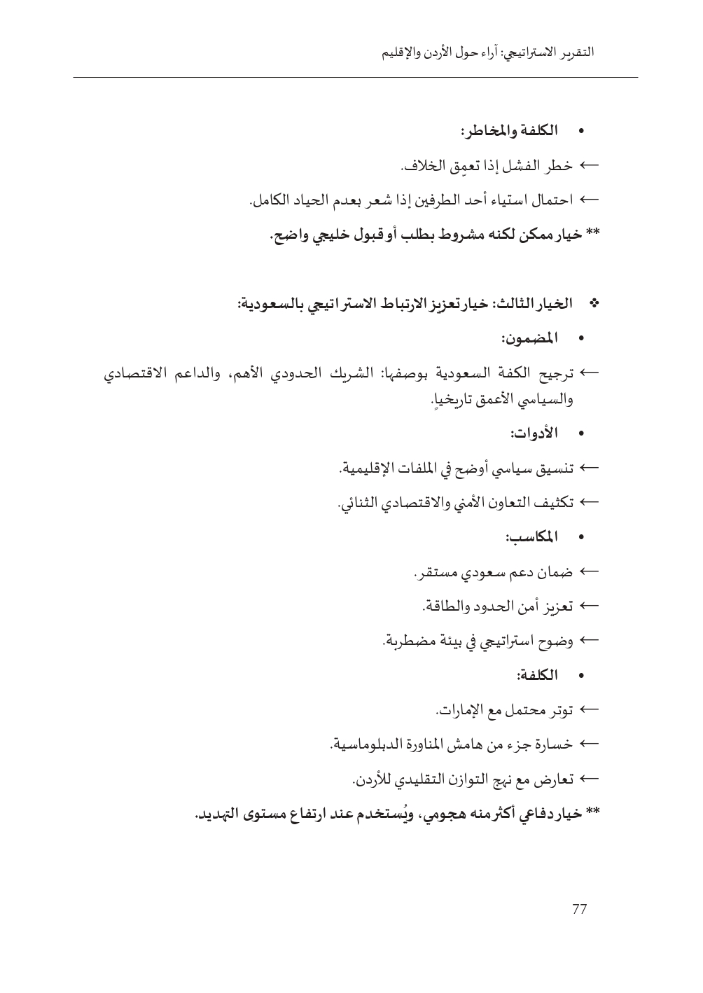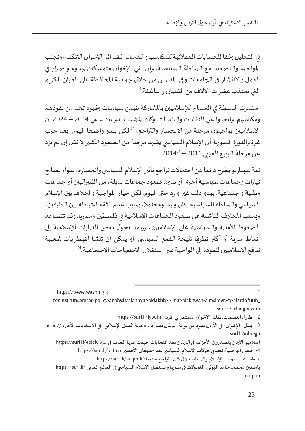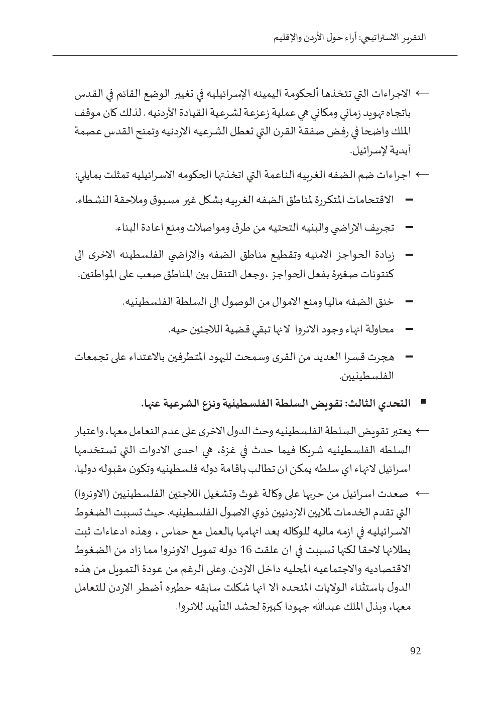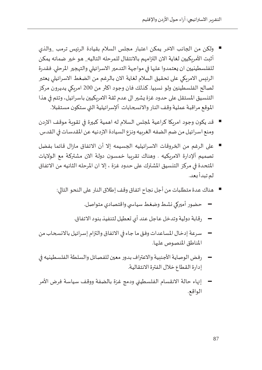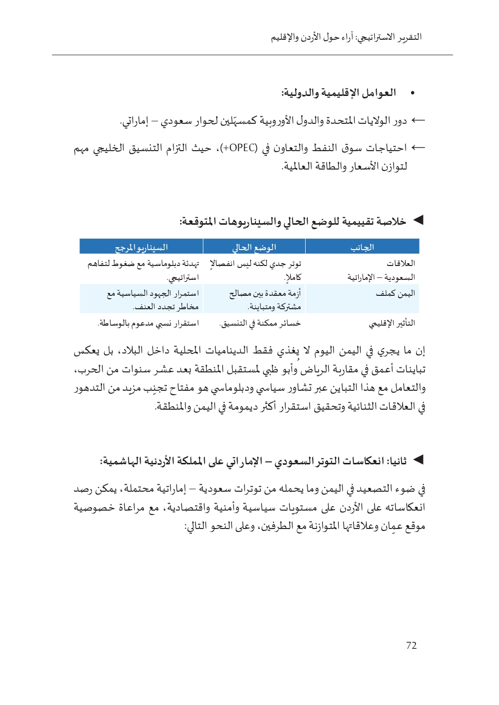 وينطلق التقرير من مقاربة تحليلية منهجية تقوم على استشراف السيناريوهات وتقدير المخاطر، ومواءمتها مع مرتكزات استراتيجية الأمن الوطني الأردني، وصولًا إلى بلورة مجموعة من المقترحات والتوصيات العملية القابلة للتنفيذ، بما يعزز قدرة صانع القرار على التعامل مع التحولات المتسارعة في الإقليم والعالم.