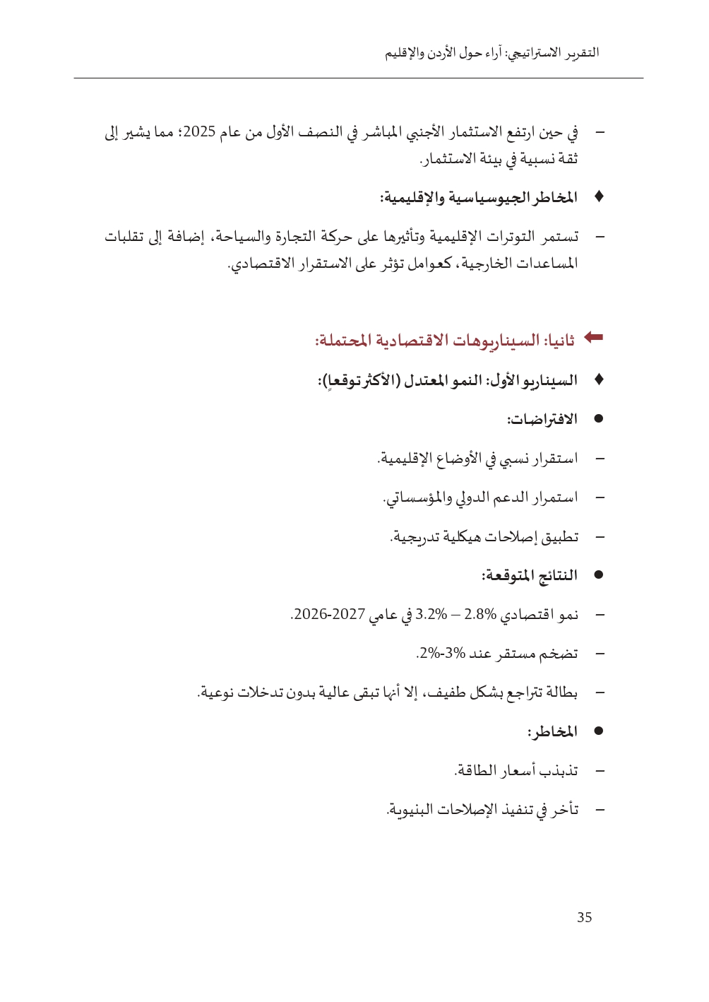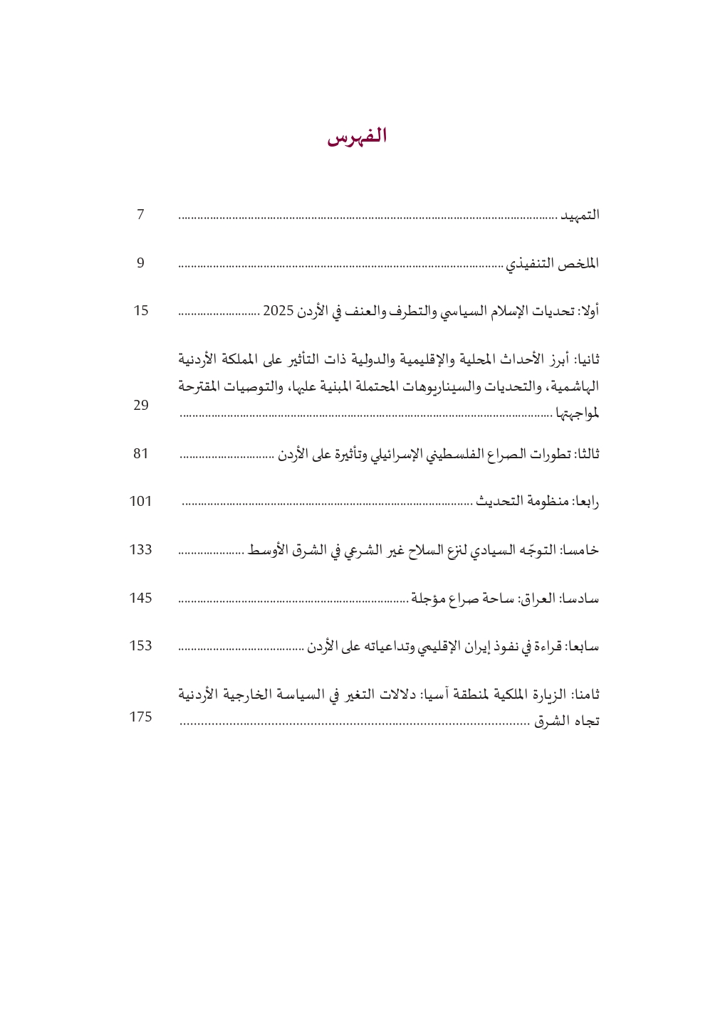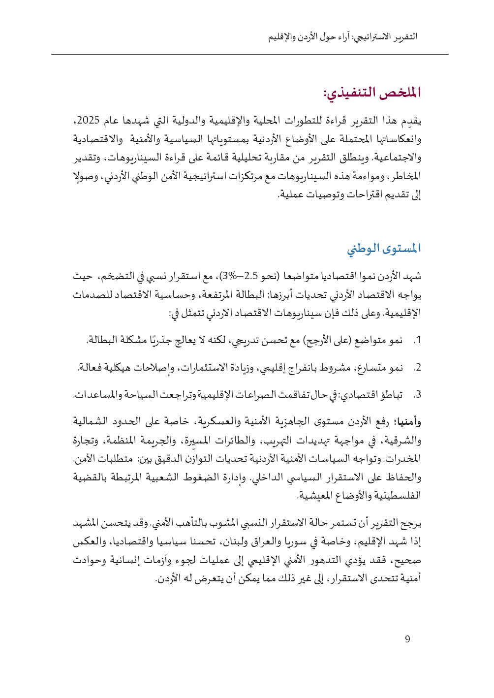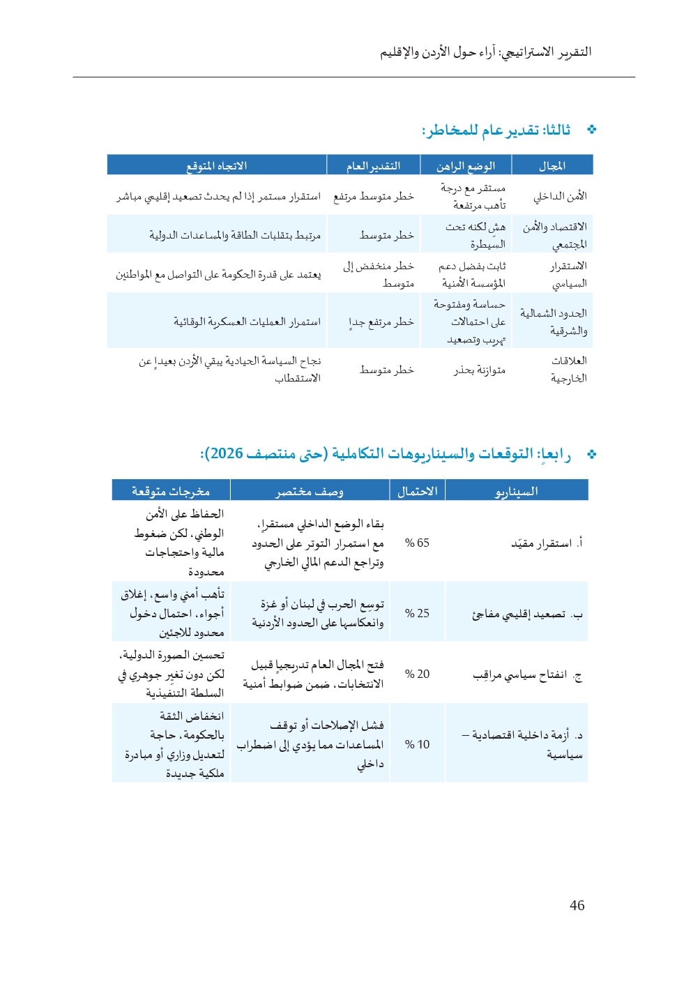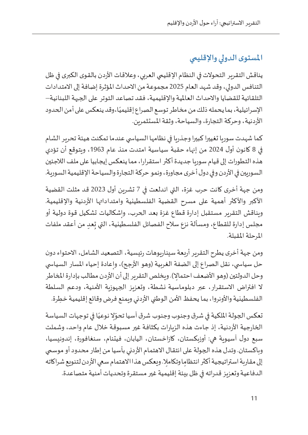 ويستند التقرير إلى تحليلات قائمة على الأدلة، تهدف إلى استشراف الاتجاهات المستقبلية وصياغة استجابات فعّالة للتحديات المتغيّرة. كما يقدّم قراءة تحليلية للتطورات السياسية والأمنية والاقتصادية والاجتماعية التي شهدها عام 2025 على المستويات المحلية والإقليمية والدولية، مع تسليط الضوء على انعكاساتها المحتملة على الأردن.