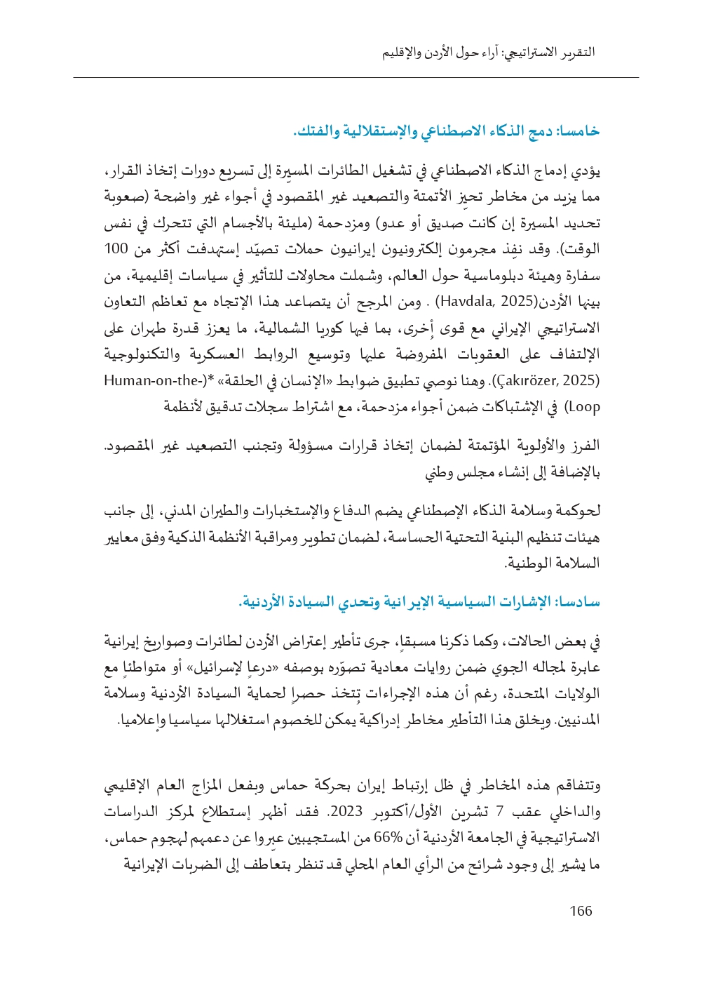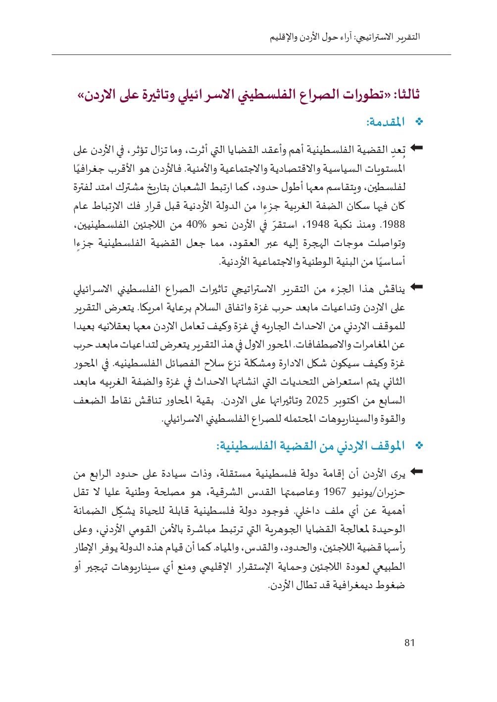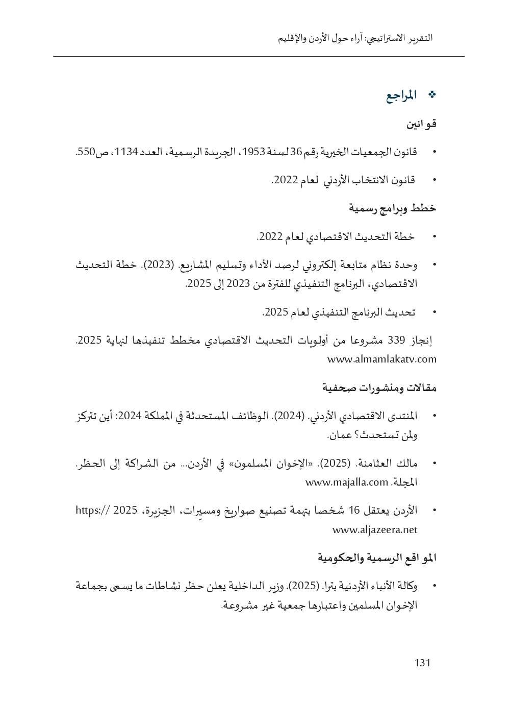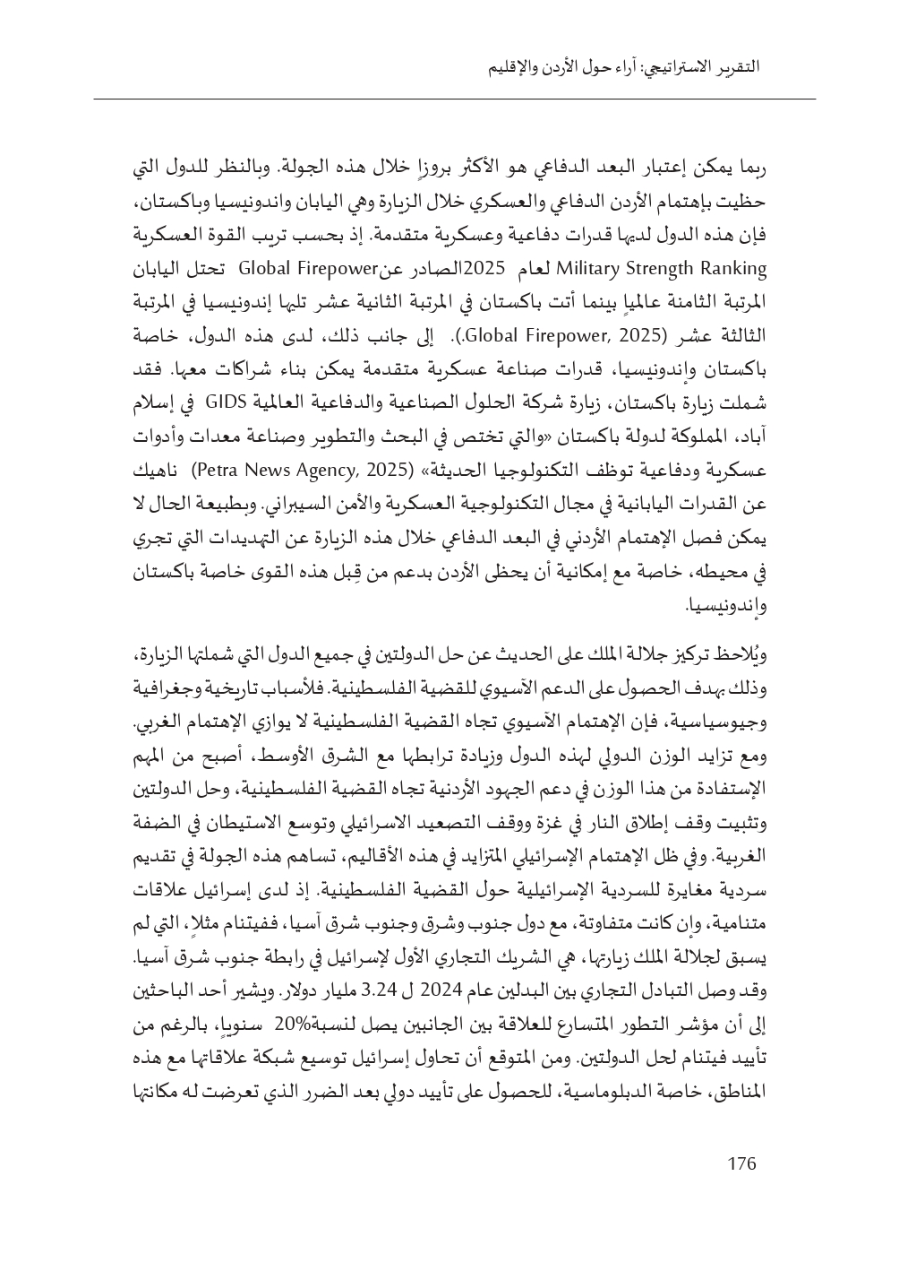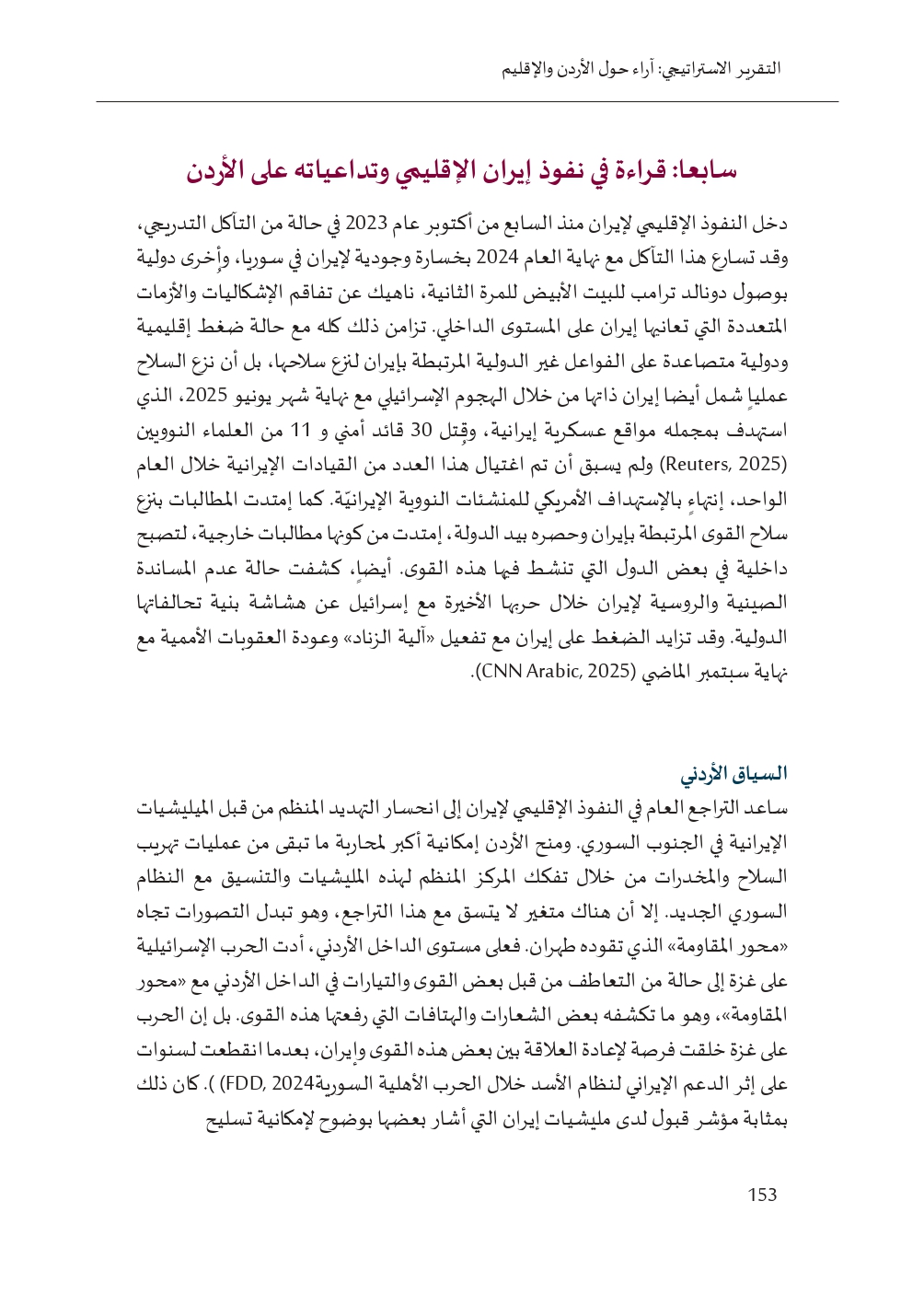 ويستند التقرير إلى تحليلات قائمة على الأدلة، تهدف إلى استشراف الاتجاهات المستقبلية وصياغة استجابات فعّالة للتحديات المتغيّرة. كما يقدّم قراءة تحليلية للتطورات السياسية والأمنية والاقتصادية والاجتماعية التي شهدها عام 2025 على المستويات المحلية والإقليمية والدولية، مع تسليط الضوء على انعكاساتها المحتملة على الأردن.