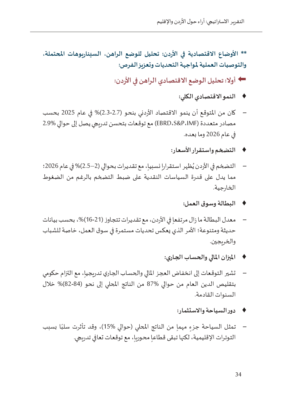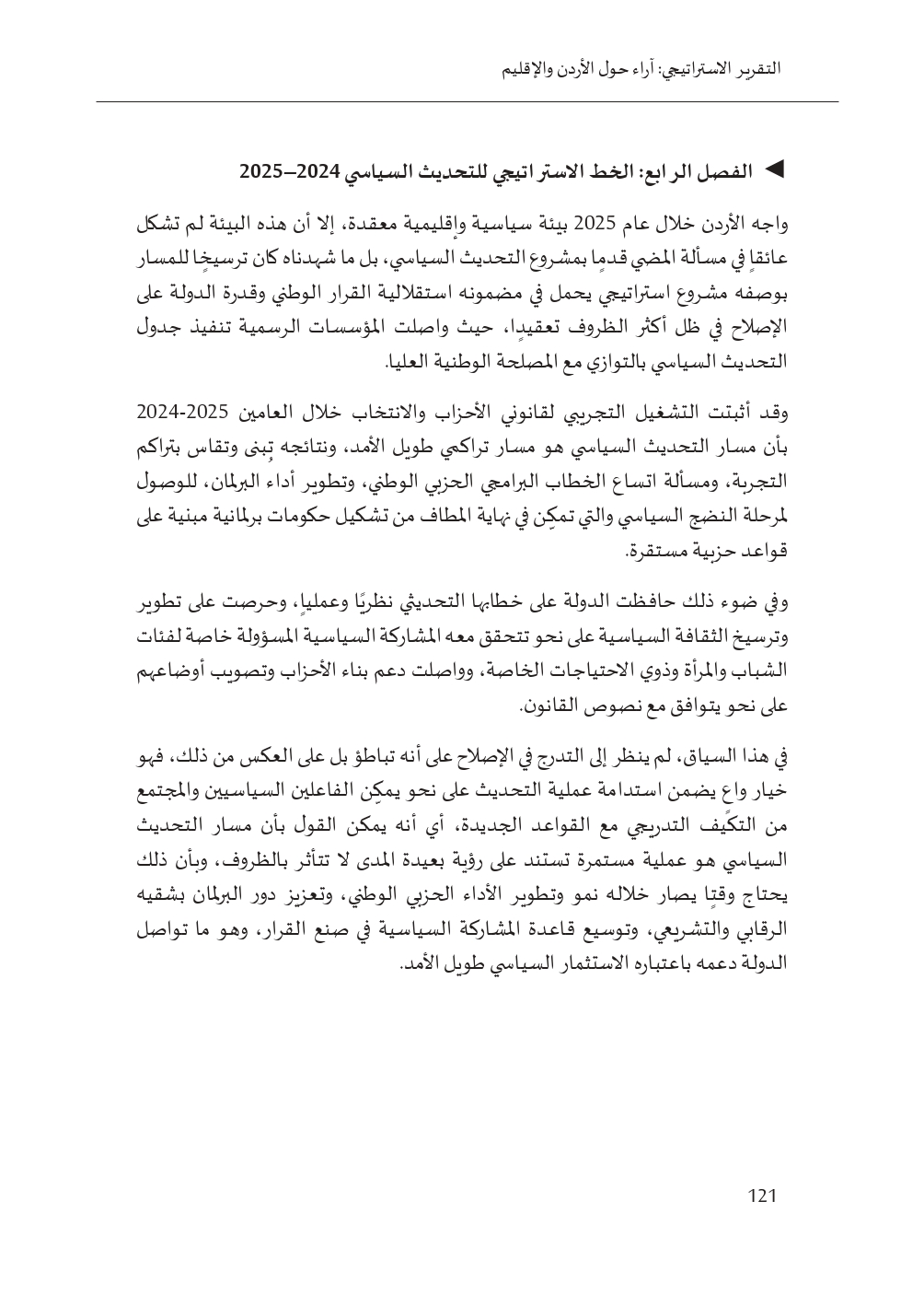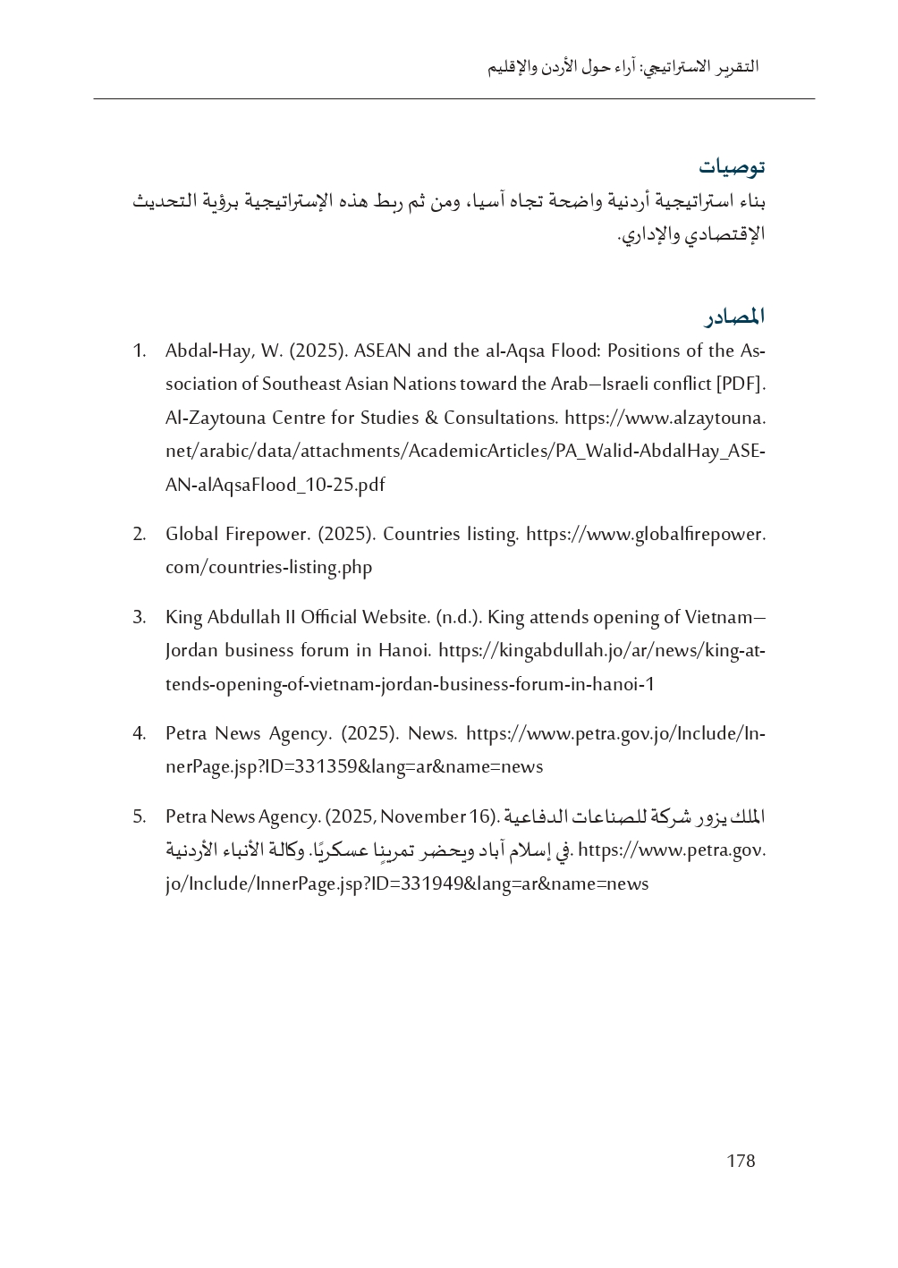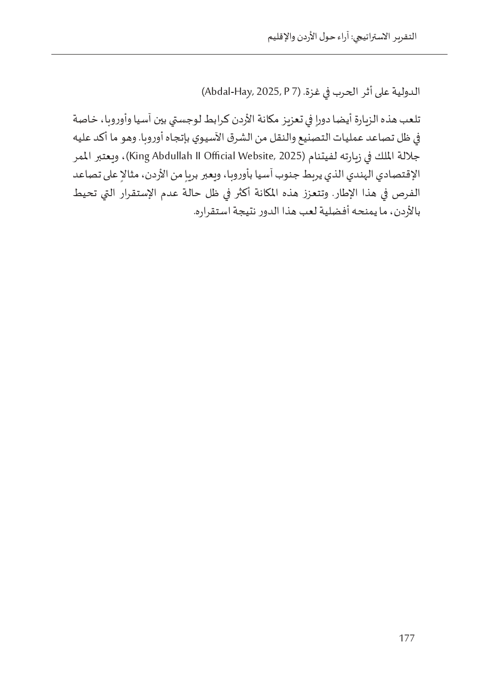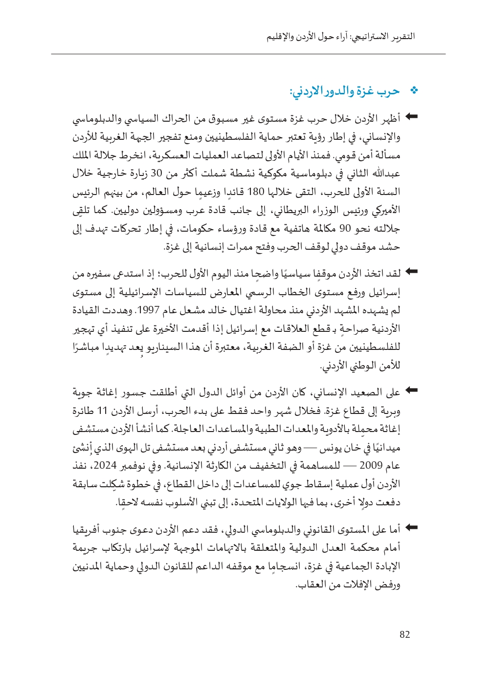 ويستند التقرير إلى تحليلات قائمة على الأدلة، تهدف إلى استشراف الاتجاهات المستقبلية وصياغة استجابات فعّالة للتحديات المتغيّرة. كما يقدّم قراءة تحليلية للتطورات السياسية والأمنية والاقتصادية والاجتماعية التي شهدها عام 2025 على المستويات المحلية والإقليمية والدولية، مع تسليط الضوء على انعكاساتها المحتملة على الأردن.