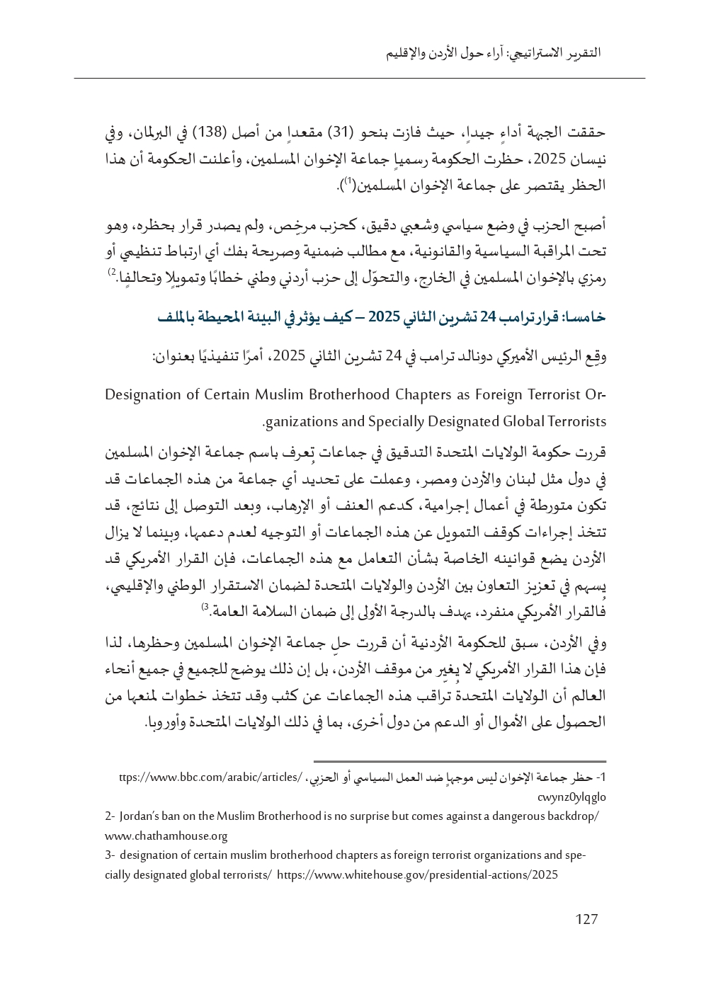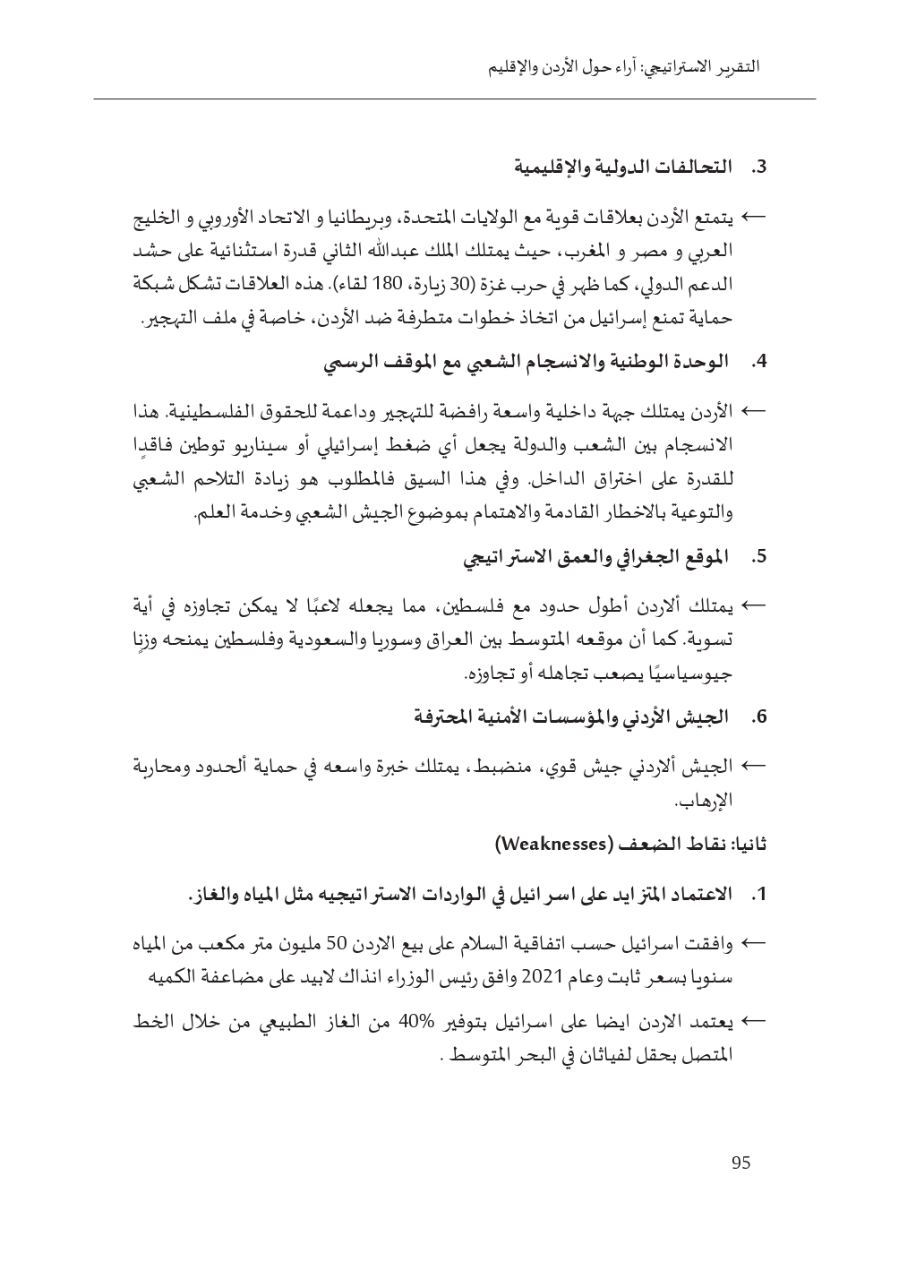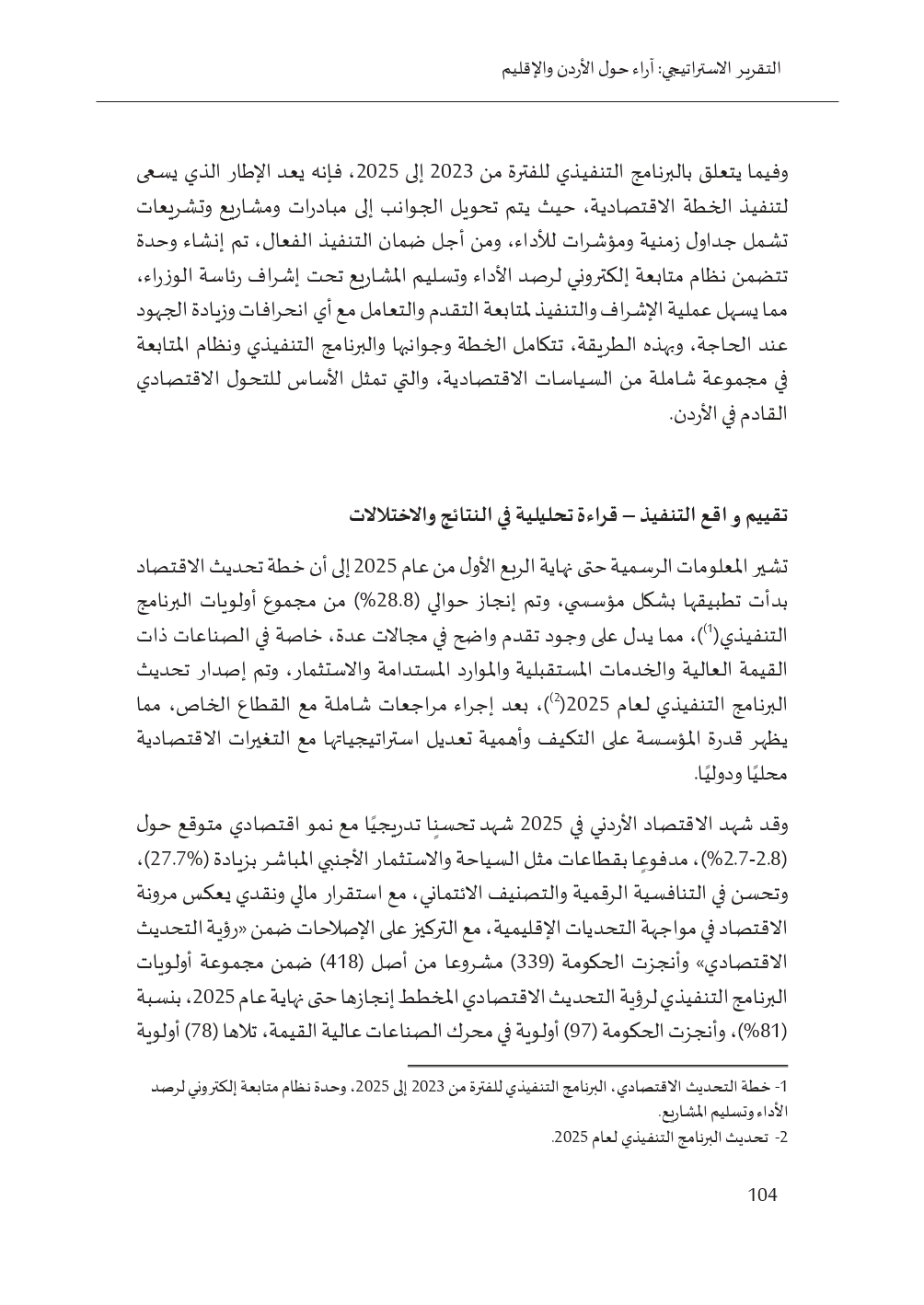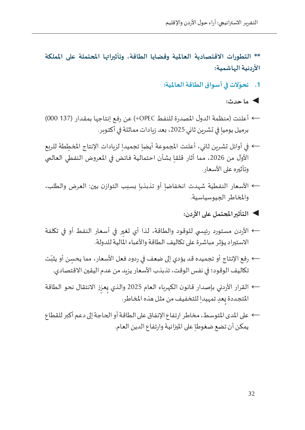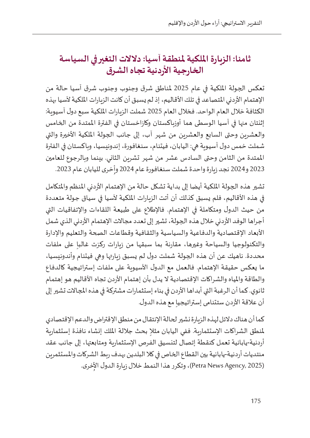 ويستند التقرير إلى تحليلات قائمة على الأدلة، تهدف إلى استشراف الاتجاهات المستقبلية وصياغة استجابات فعّالة للتحديات المتغيّرة. كما يقدّم قراءة تحليلية للتطورات السياسية والأمنية والاقتصادية والاجتماعية التي شهدها عام 2025 على المستويات المحلية والإقليمية والدولية، مع تسليط الضوء على انعكاساتها المحتملة على الأردن.