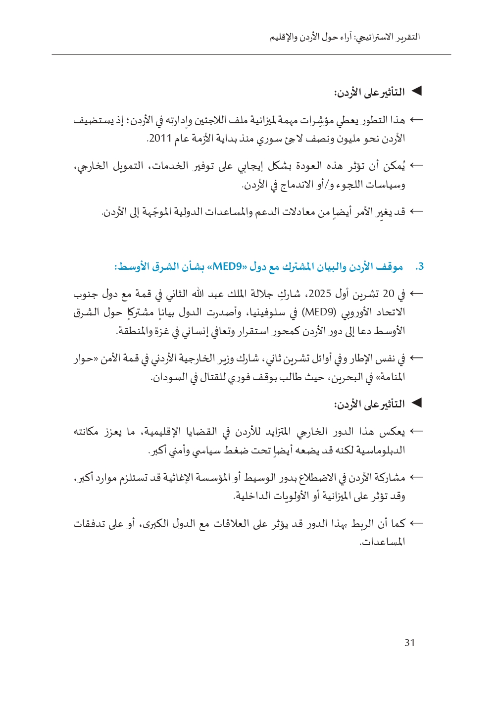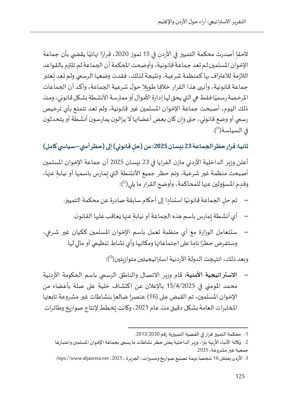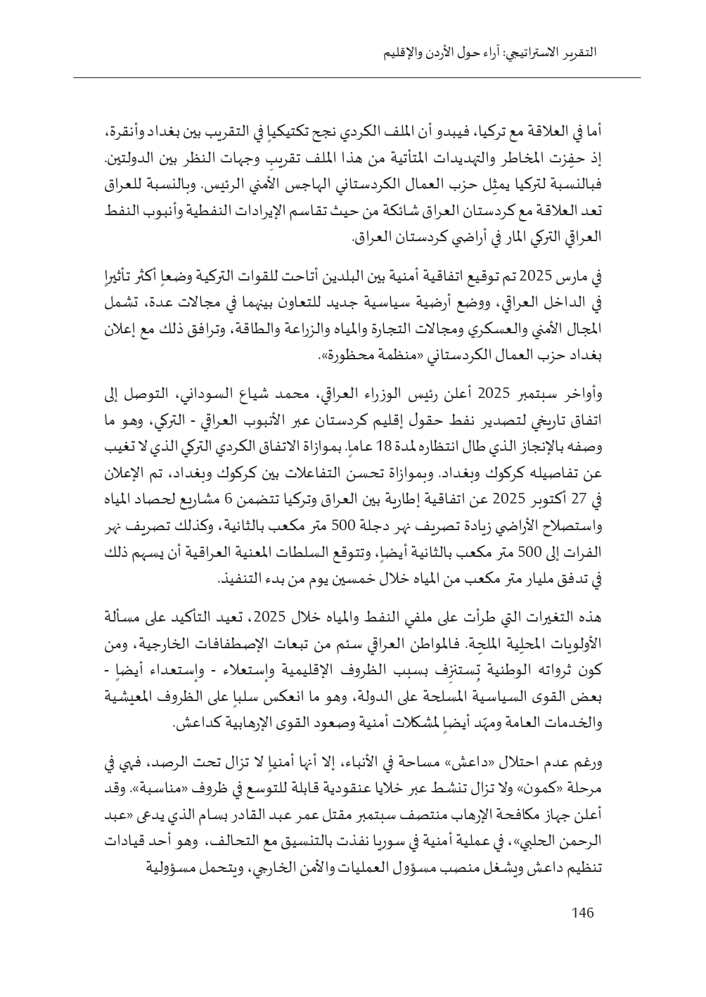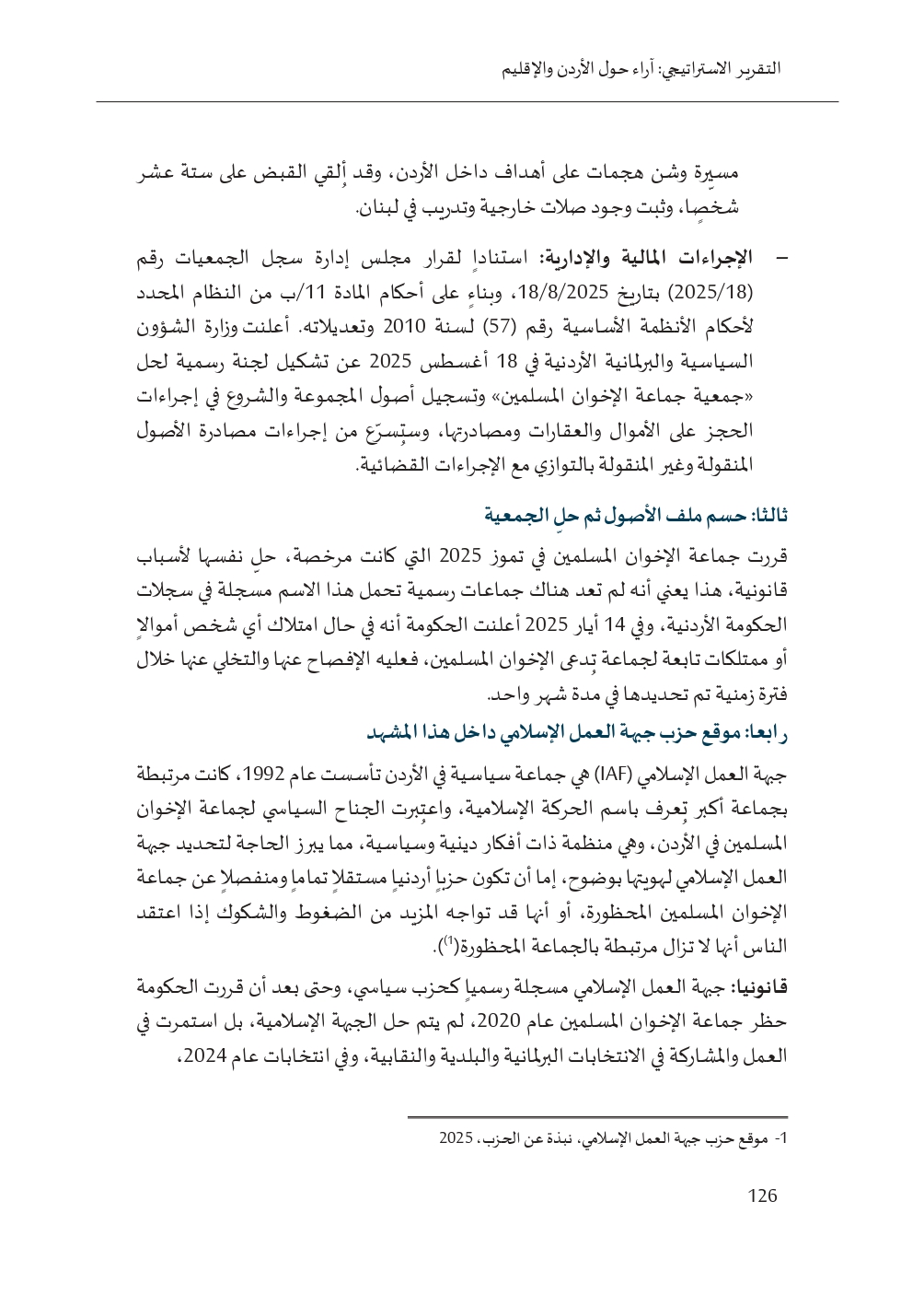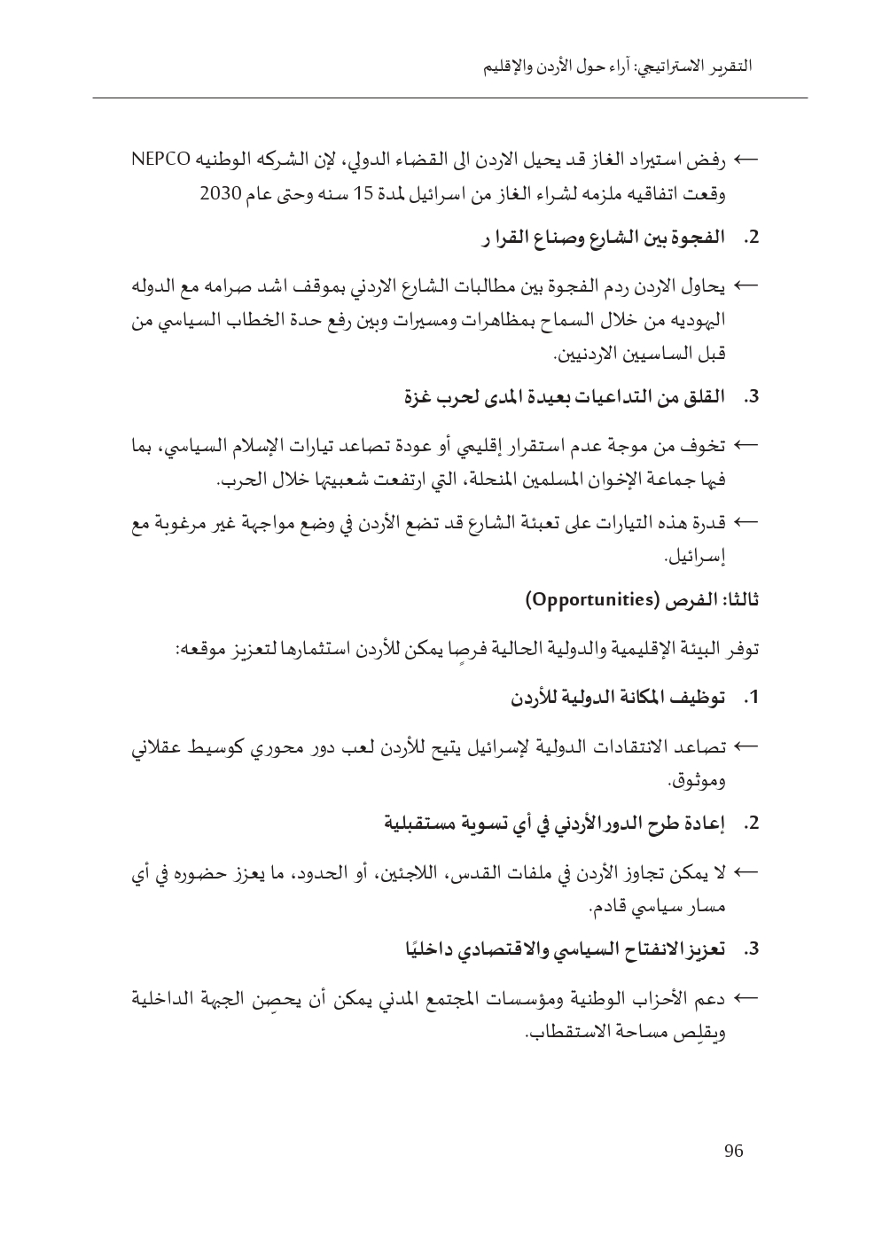 ويستند التقرير إلى تحليلات قائمة على الأدلة، تهدف إلى استشراف الاتجاهات المستقبلية وصياغة استجابات فعّالة للتحديات المتغيّرة. كما يقدّم قراءة تحليلية للتطورات السياسية والأمنية والاقتصادية والاجتماعية التي شهدها عام 2025 على المستويات المحلية والإقليمية والدولية، مع تسليط الضوء على انعكاساتها المحتملة على الأردن.