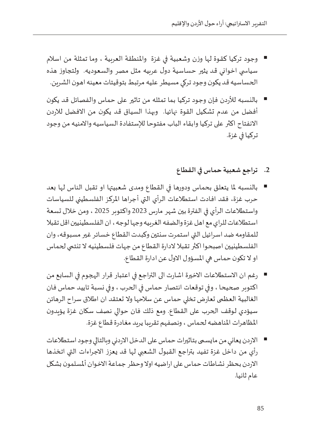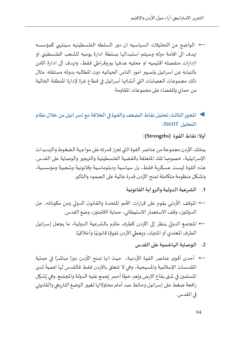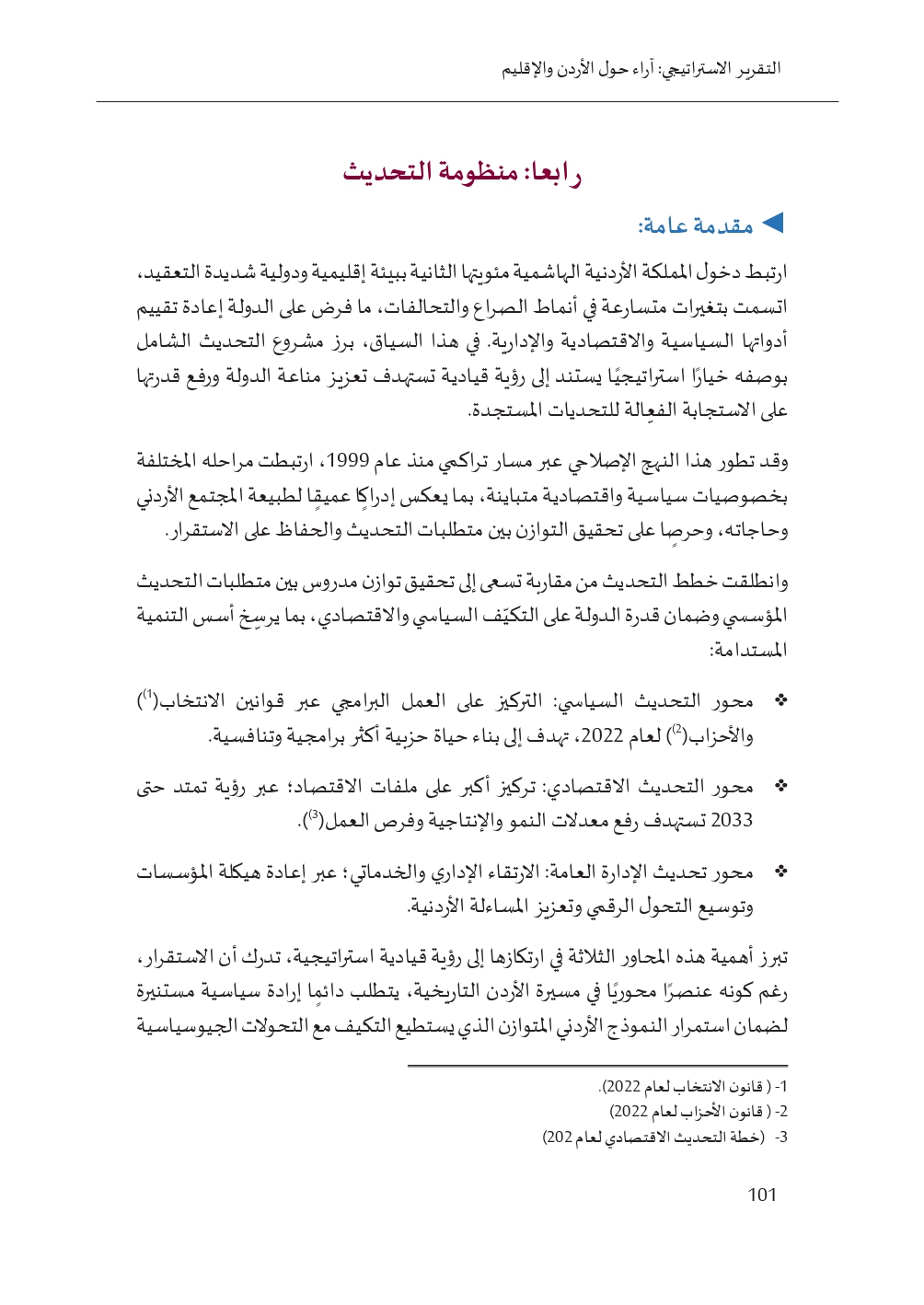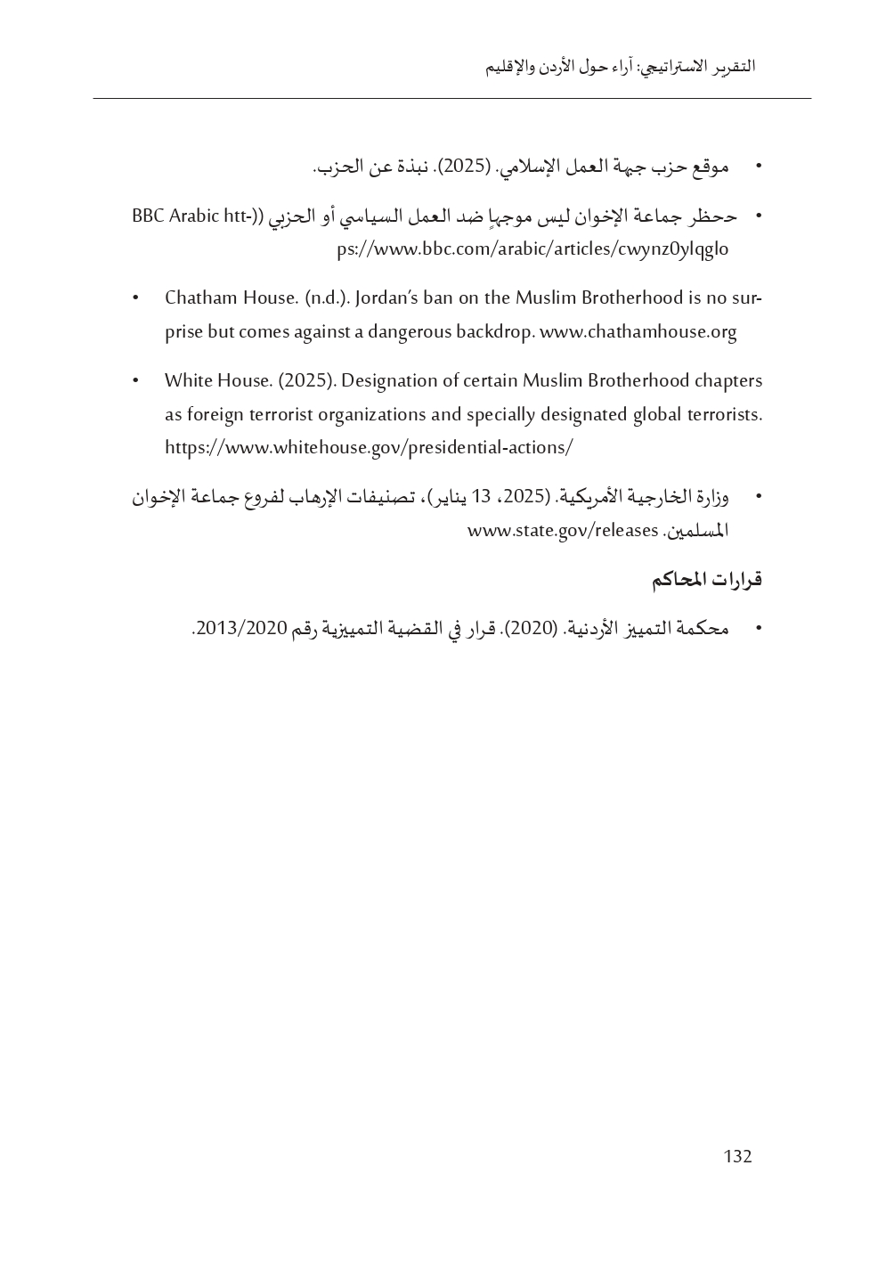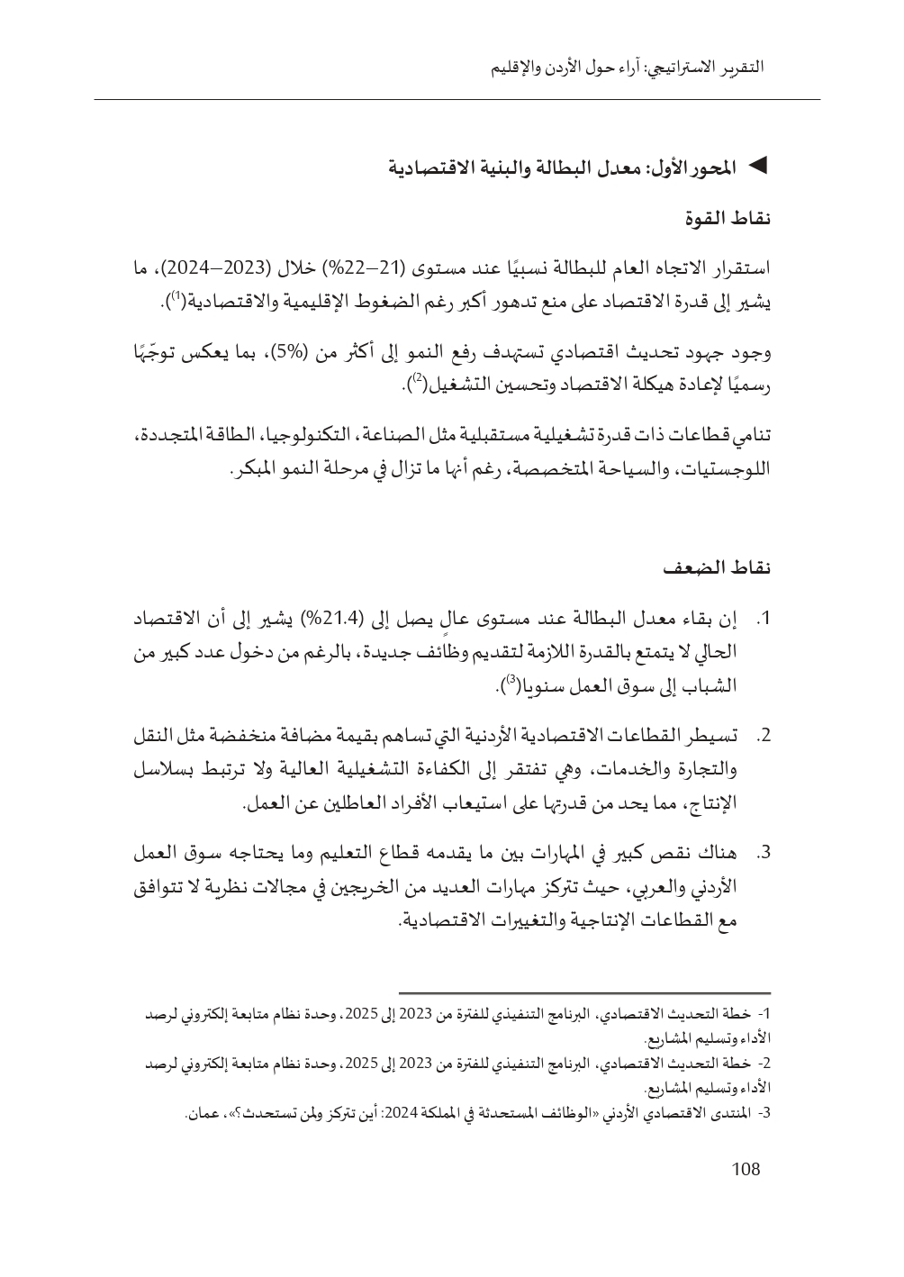 ويستند التقرير إلى تحليلات قائمة على الأدلة، تهدف إلى استشراف الاتجاهات المستقبلية وصياغة استجابات فعّالة للتحديات المتغيّرة. كما يقدّم قراءة تحليلية للتطورات السياسية والأمنية والاقتصادية والاجتماعية التي شهدها عام 2025 على المستويات المحلية والإقليمية والدولية، مع تسليط الضوء على انعكاساتها المحتملة على الأردن.