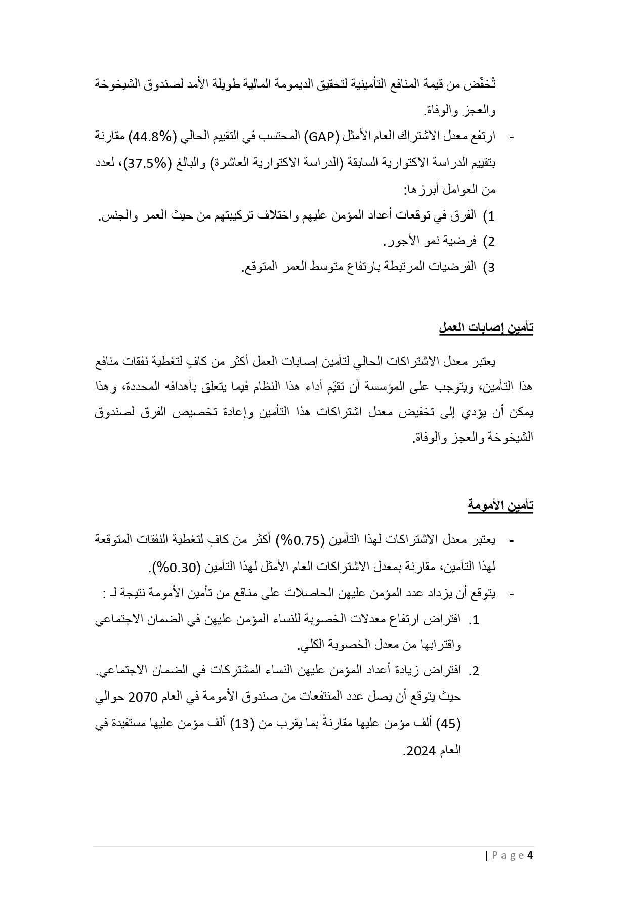 وأظهرت نتائج الدراسة أن صناديق التأمينات التي تديرها تتمتع بوضع مالي جيد جدًا ومستدام، ولا سيّما تأمينات إصابات العمل، والأمومة، والتعطل عن العمل، ما يعكس متانة المركز المالي للمؤسسة وقدرتها على الوفاء بجميع التزاماتها تجاه المشتركين والمتقاعدين، اعتمادًا على الإيرادات التأمينية والعوائد الاستثمارية والأصول، مع التأكيد على أهمية تعزيز الاستقرار المالي لضمان القدرة على تغطية الالتزامات المستقبلية دون الحاجة إلى استخدام الأصول أو العوائد الاستثمارية.