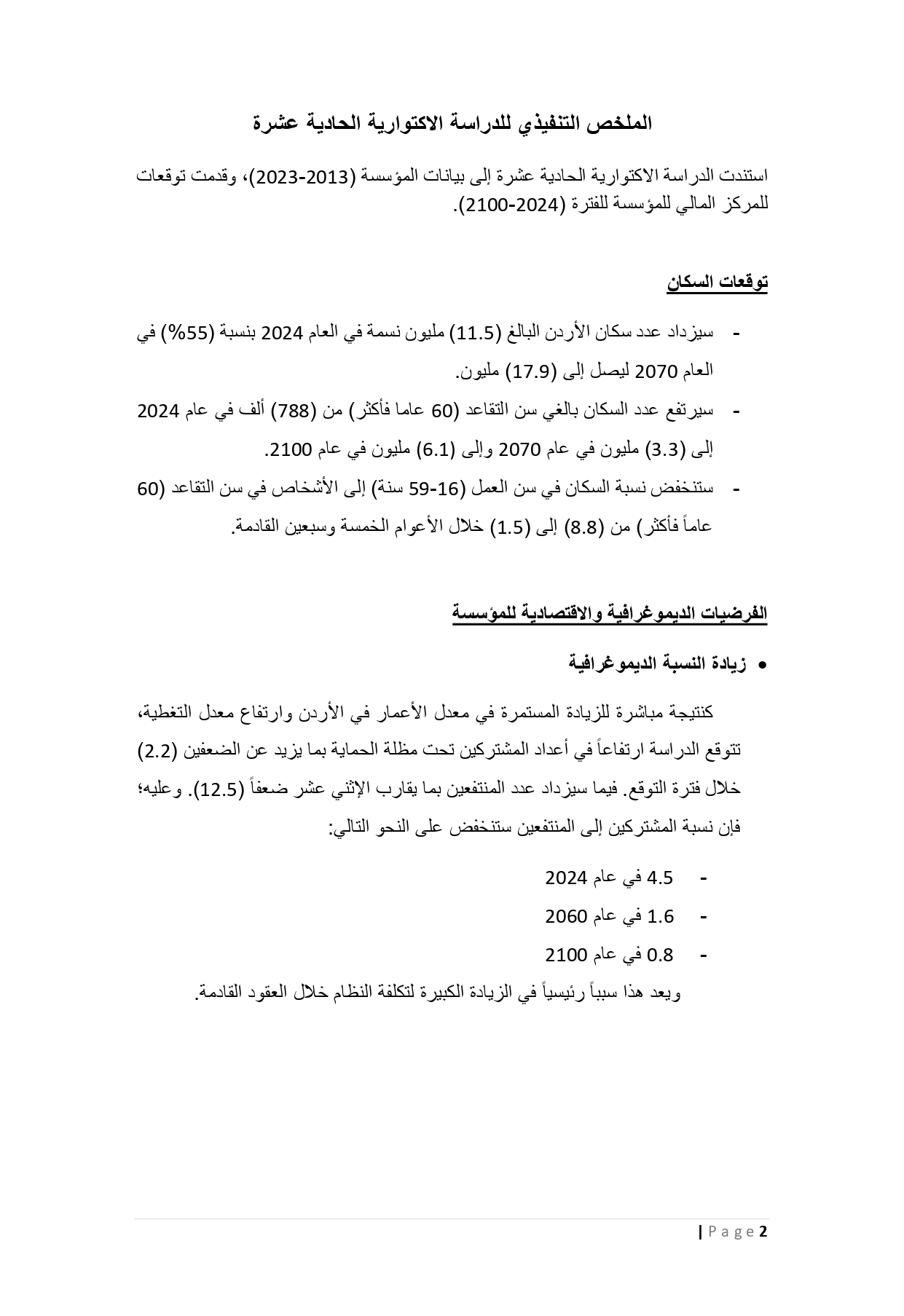 عمون - نشرت المؤسسة العامة للضمان الاجتماعي، على موقعها الإلكتروني الثلاثاء، الملخص التنفيذي للدراسة الاكتوارية الحادية عشرة والذي يتضمن أبرز نتائجها، التي تُجرى كل 3 سنوات بموجب أحكام المادة (18) من قانون الضمان الاجتماعي.