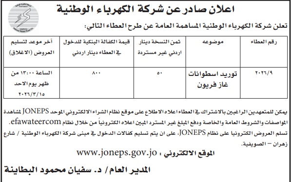 عطاء صادر عن شركة الكهرباء الوطنية