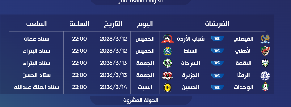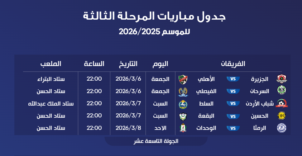 عمون - أصدر الاتحاد الأردني لكرة القدم، جدول مواعيد وأماكن إقامة مباريات الأسابيع من التاسع عشر وحتى الحادي والعشرين من بطولة الدوري الأردني للمحترفين لموسم 2025/2026.