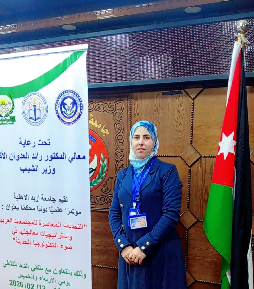 عمون - في إطار حرص جامعة عمان العربية على دعم البحث العلمي وتعزيز حضورها الأكاديمي في المحافل العلمية، شاركت الدكتورة الاء البوريني رئيس قسم الشريعة والدراسات الإسلامية في كلية الشريعة في الجامعة في فعاليات المؤتمر العلمي الدولي المحكم الأول، تحت عنوان: "التحديات المعاصرة للمجتمعات العربية واستراتيجيات معالجتها في ضوء التكنولوجيا الحديثة"، وذلك بمشاركة نخبة من الباحثين والخبراء من مختلف الجامعات والمؤسسات الأكاديمية.