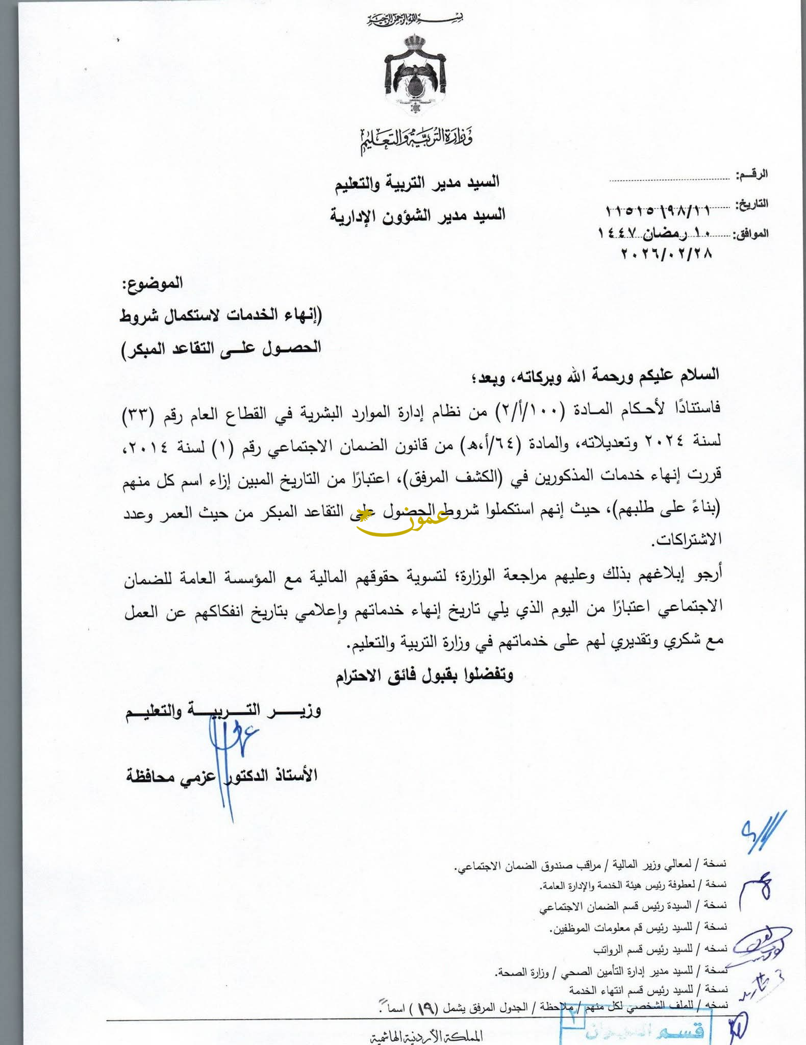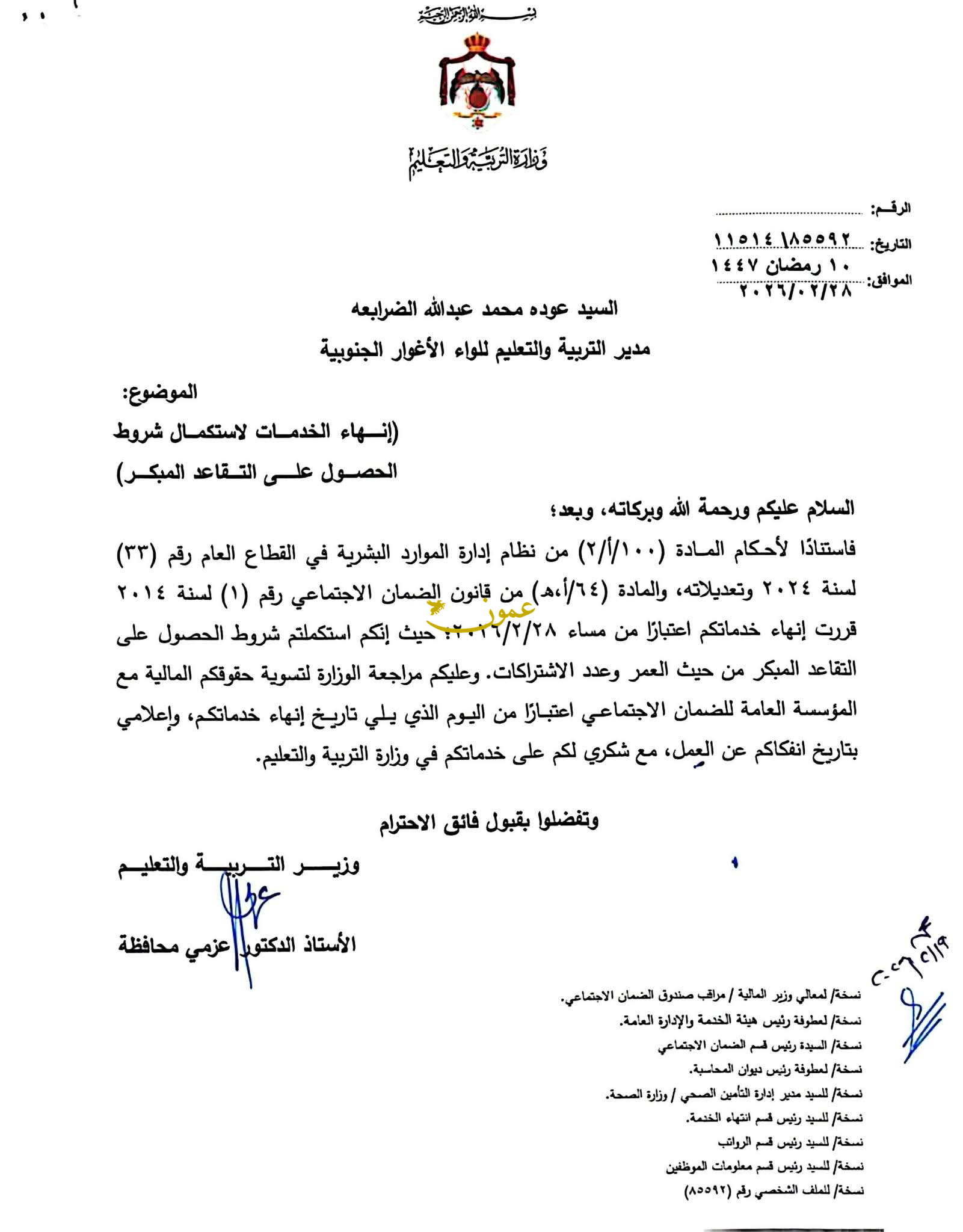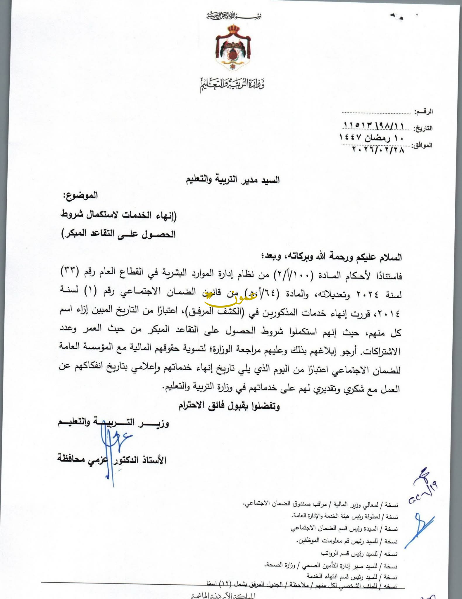 إنهاء خدمات موظفين في التربية لاستكمالهم التقاعد المبكر (اسماء)28-02-2026 08:29 PM