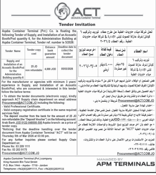عطاء صادر عن شركة ميناء حاويات العقبة