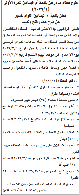 عطاء فتح وتعبيد شوارع بلدية ام البساتين